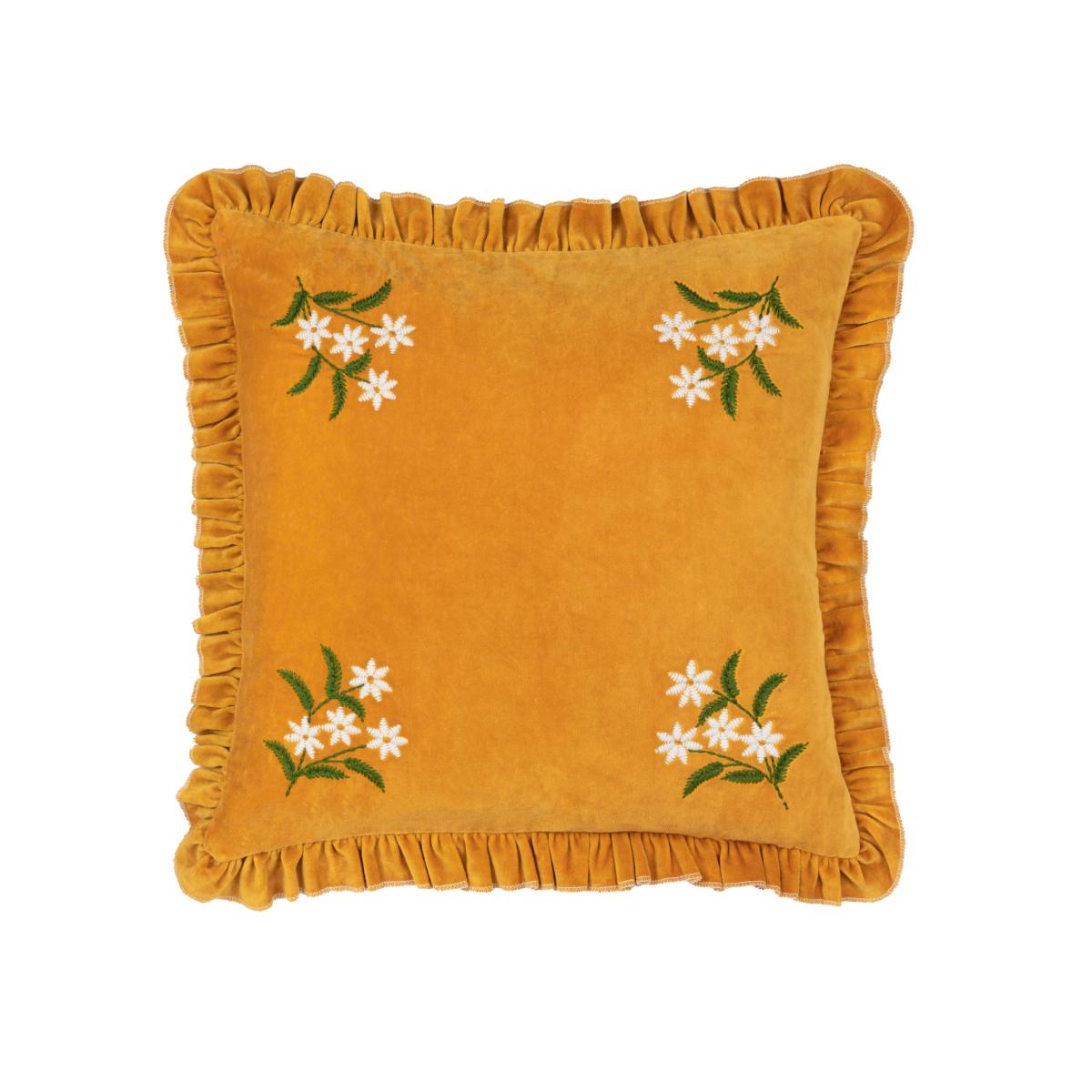 Daisy Frill Embroidered Velvet Cushion - Gold / Polyester