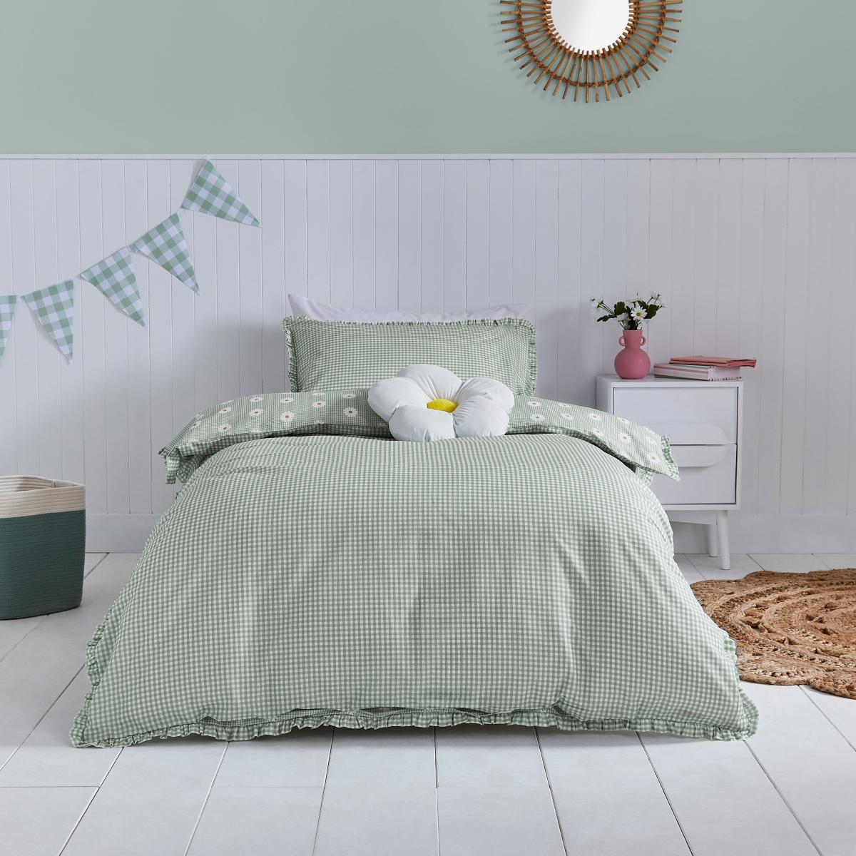 I love the Daisy Gingham Ruffle Trim duvet in green for adding a fresh, playful touch to a child's room. Its classic gingham pattern combined with ruffle details makes it versatile, working well in both traditional and contemporary children’s interiors. It pairs nicely with neutral or pastel-coloured walls, and adds personality without overwhelming the space. Practical styling tips include layering it with solid-coloured cushions or soft toys to create an inviting look, and keeping accessories simple to let the cheery pattern stand out. This duvet cover is ideal for creating a cheerful, cosy environment that’s easy to update with a few subtle changes over time.