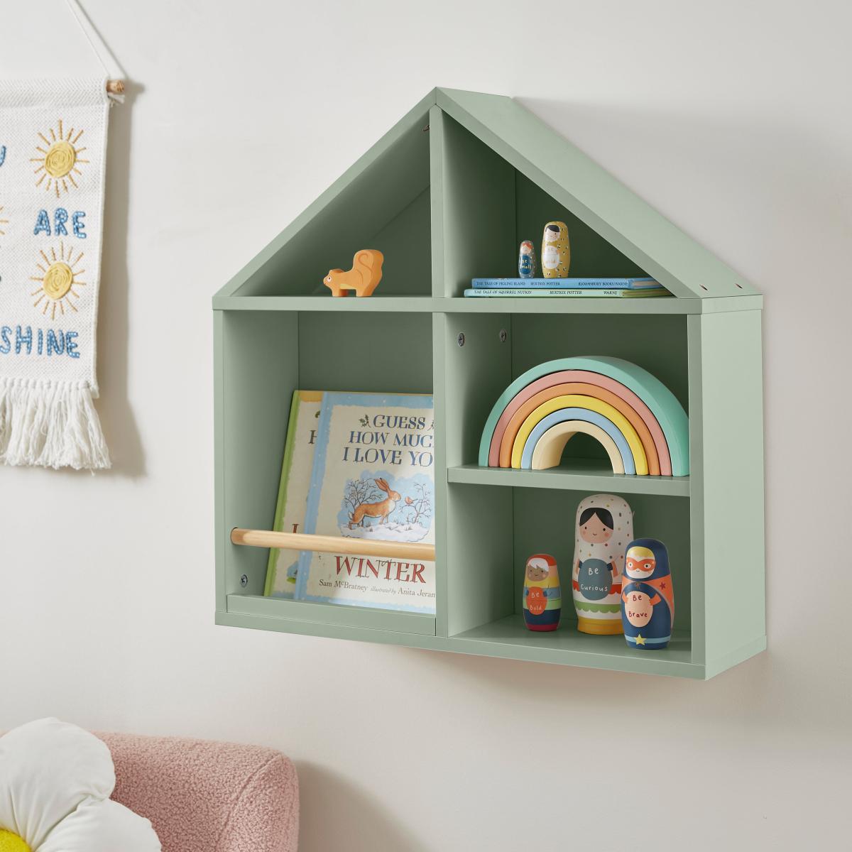 I love this little house shelf for its charming, playful design that instantly adds personality to a child's room. It works well in both modern and traditional interiors, especially when paired with soft pastel tones or natural wood accents. Practical styling tips include using it for organising books, toys, or cherished keepsakes, and keeping it uncluttered to maintain its visual appeal. Its compact size makes it perfect for small spaces, and positioning it at a low level encourages easy access for children, fostering independence while keeping their space tidy.