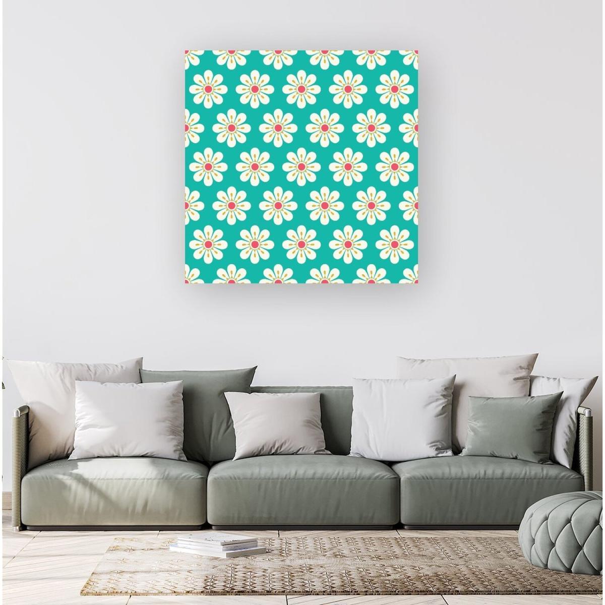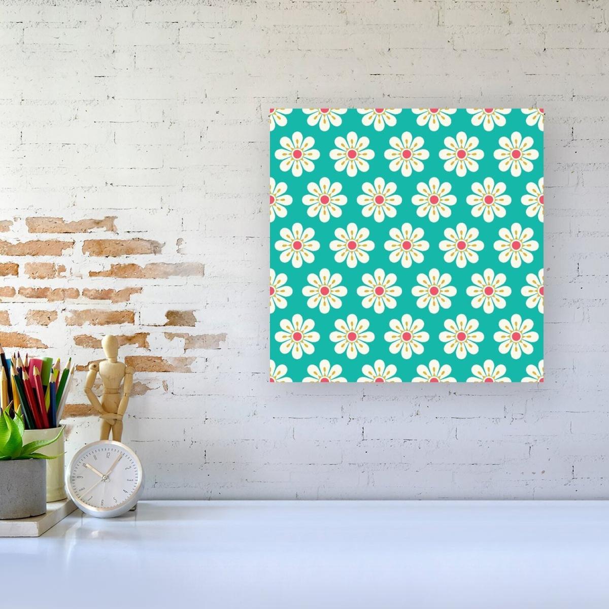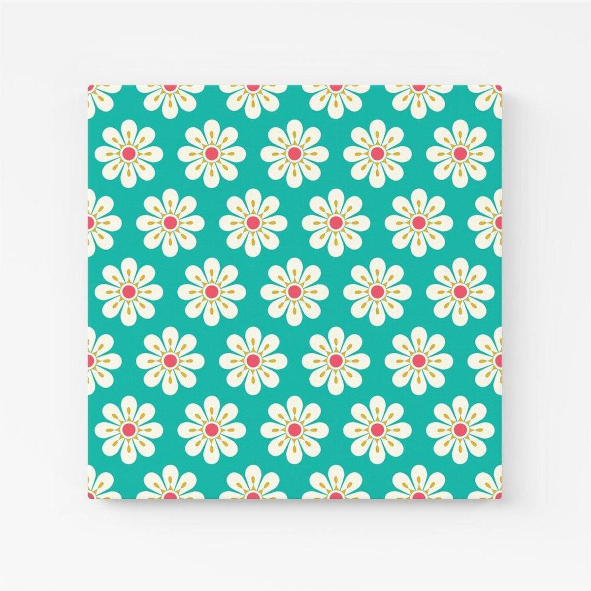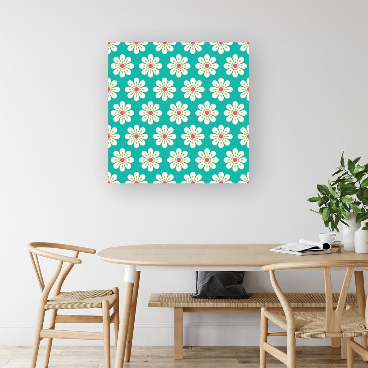 I love this daisy print canvas for its cheerful and retro vibe, making it a great statement piece in a variety of interiors. It works particularly well in contemporary, minimalist spaces where a pop of colour can add warmth, or in eclectic and vintage-inspired rooms to enhance a playful, nostalgic feel. To style it effectively, consider pairing it with neutral furnishings to let the print stand out, or incorporate other green accents to create a cohesive look. Hanging it at eye level above a sofa or in a corridor can draw the eye, making the space feel more inviting and lively.