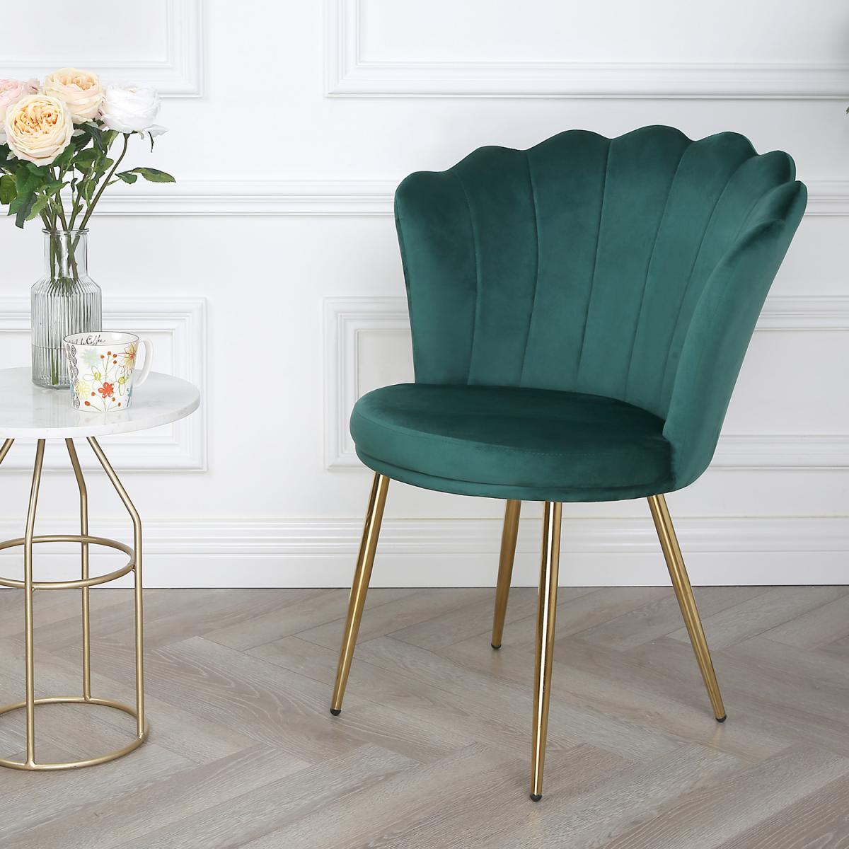 This Daisy Accent Chair with scalloped back armchair is the perfect addition to your living room, bedroom, or study! Its contemporary design features a comfortable seat, petal-shaped back with armrests, and a sturdy steel base. The chair is upholstered in a luxurious silver-grey velvet fabric that is soft to the touch and durable. The chair is also height-adjustable to provide optimal comfort and support. The design is sure to liven up your space and make it look modern and chic. Featuring highly intriguing elegance, this Daisy velvet accent chair will grace your home with its sophisticated design that accentuates any interior decor. This accent chair in grey, green and pink colours is expertly upholstered with a glamorous finish. It is soft to touch and highly comfortable to sit on while matching the interior decoration of your interior spaces. You will enjoy great relaxation and comfort as you sit back on its strongly built backrest. To improve its elegance and beauty, this velvet accent chair is constructed with titanium golden plated legs that are sturdy and prevent any wobbling movement.