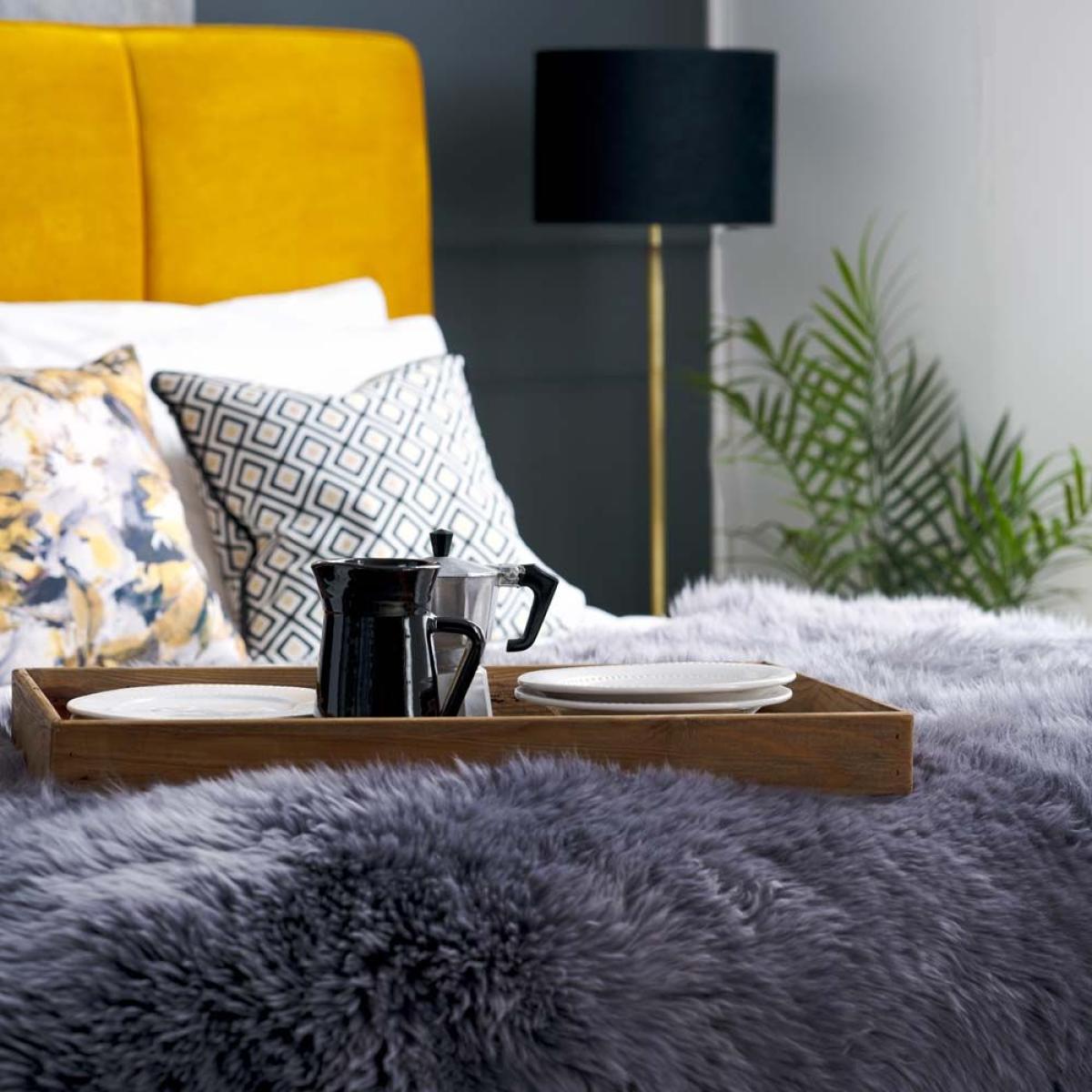 The Daisy velvet bedframe in Mustard is a stunning and modern design with two rows of square padding detail on the headboard. The bed is also swathed up each side with a soft velvet upholstery and across the footend. Featuring turned wooden legs this bed is a true statement piece and is a perfect upgrade for the bedroom. The bed is easy to assemble and comes with a slatted base.