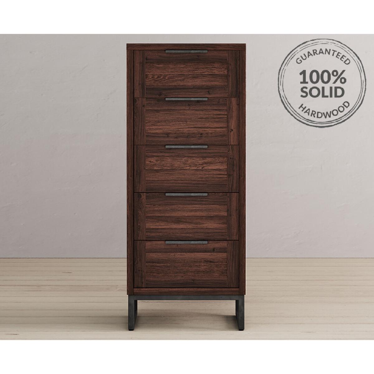 The Dakota Dark Acacia and Metal 5 Drawer Tallboy Chest is crafted from 100% solid hardwood with a brushed finish and features five dovetail drawers, complete with metal handles.