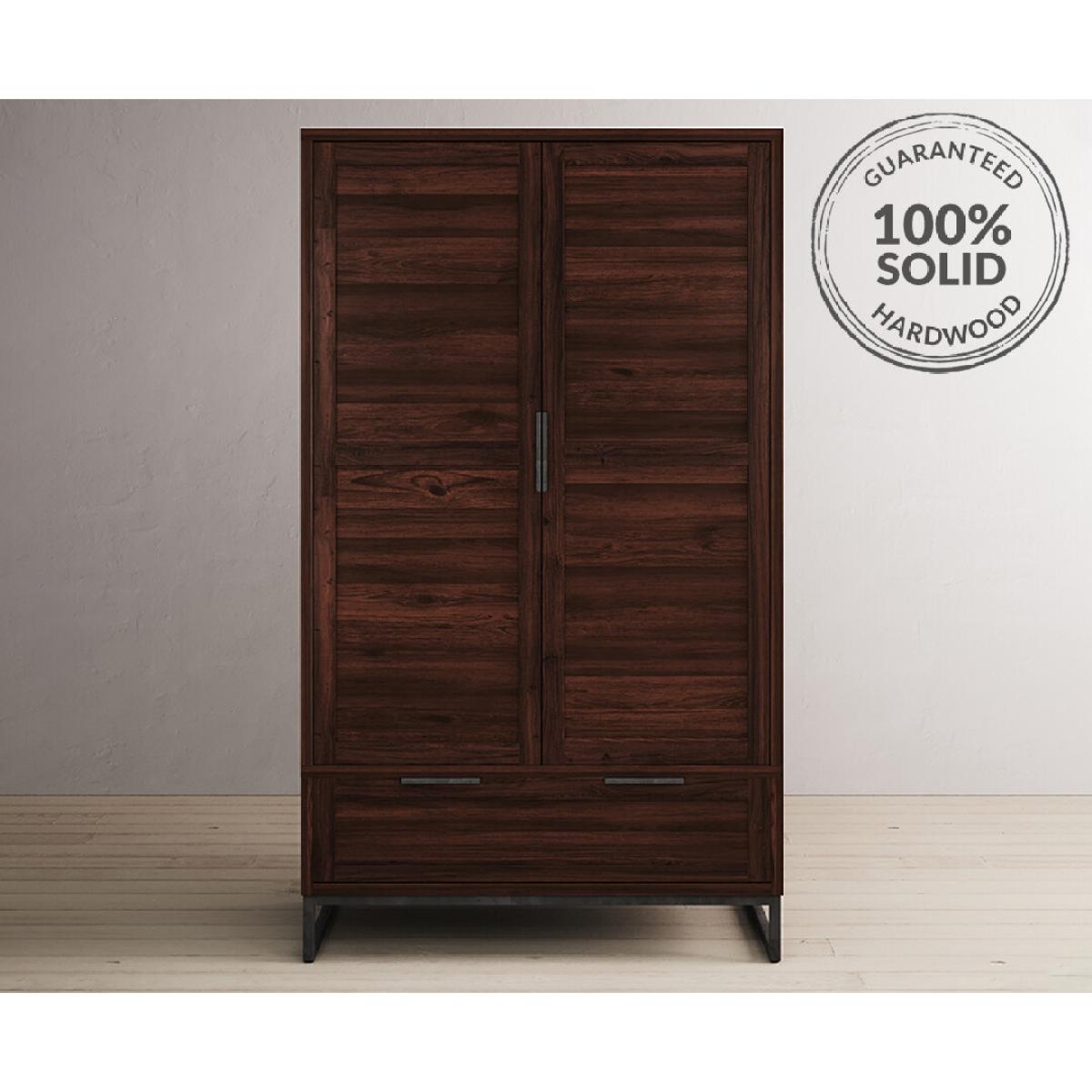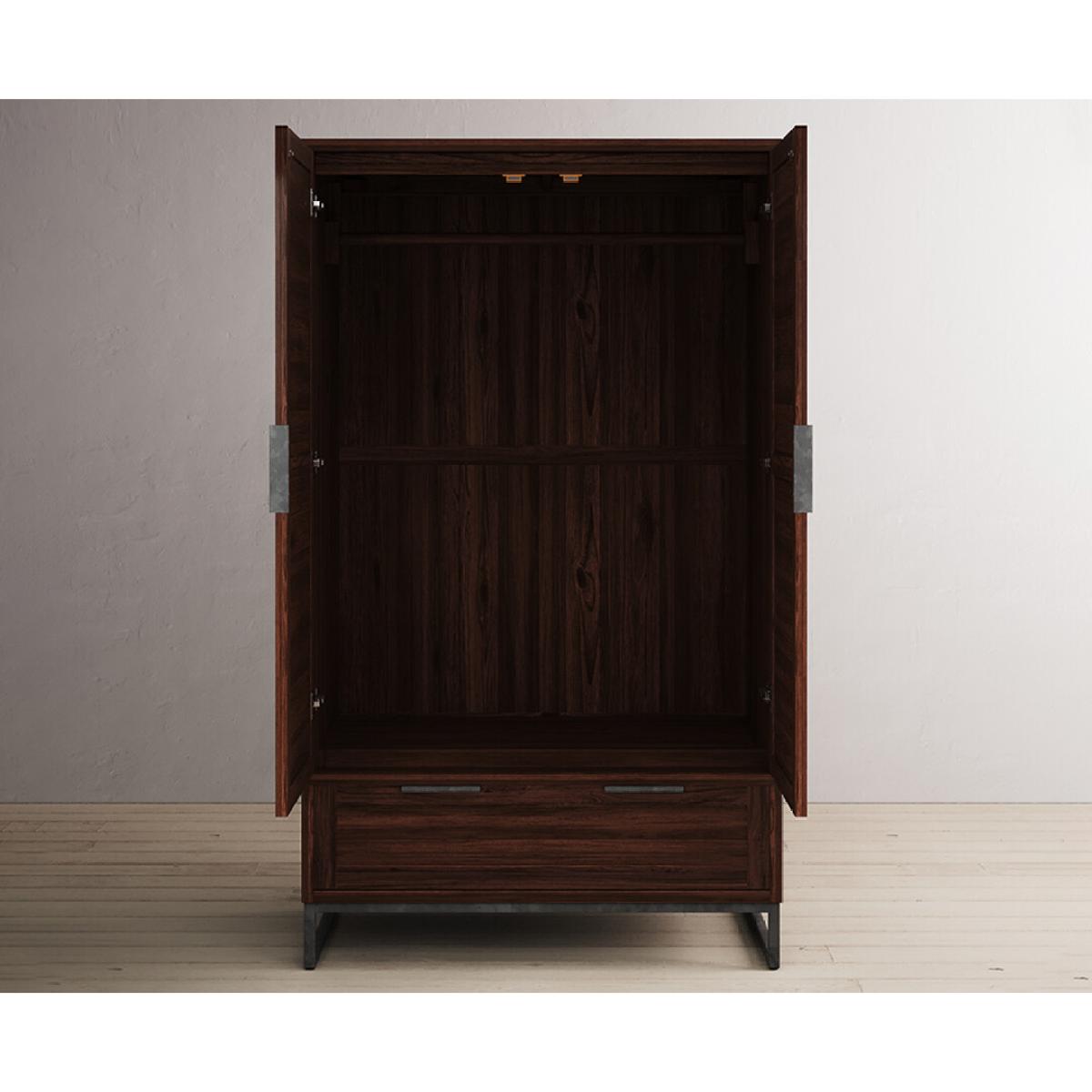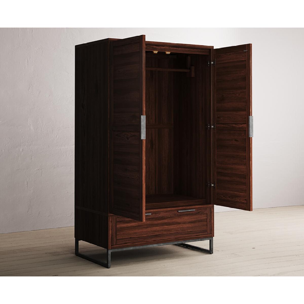 The Dakota Dark Acacia and Metal Double Wardrobe is crafted from 100% solid hardwood and features plenty of storage, complete with a lower dovetail drawer.