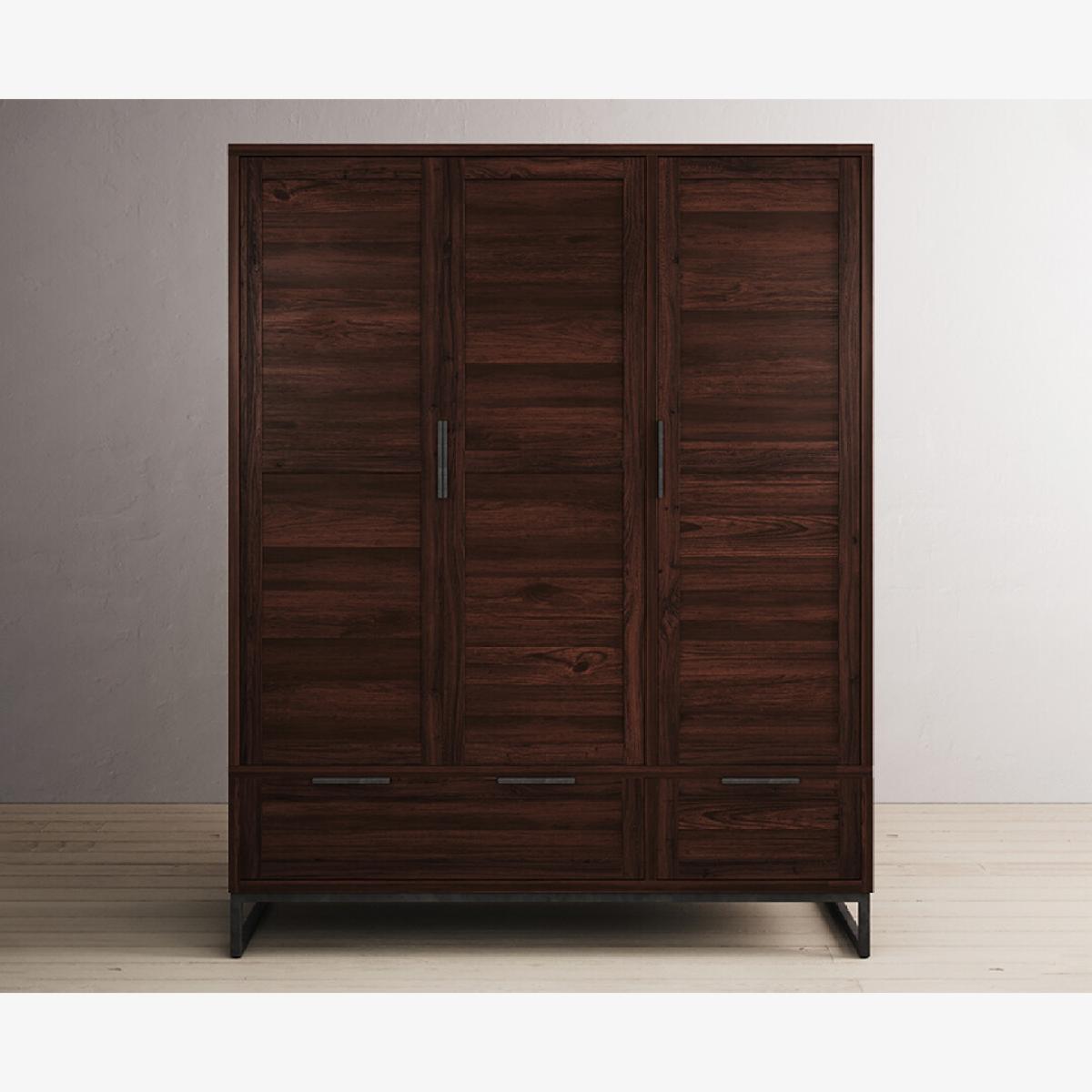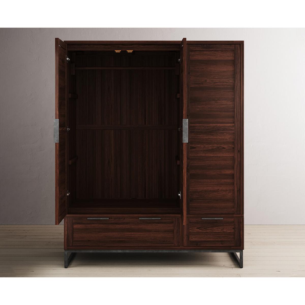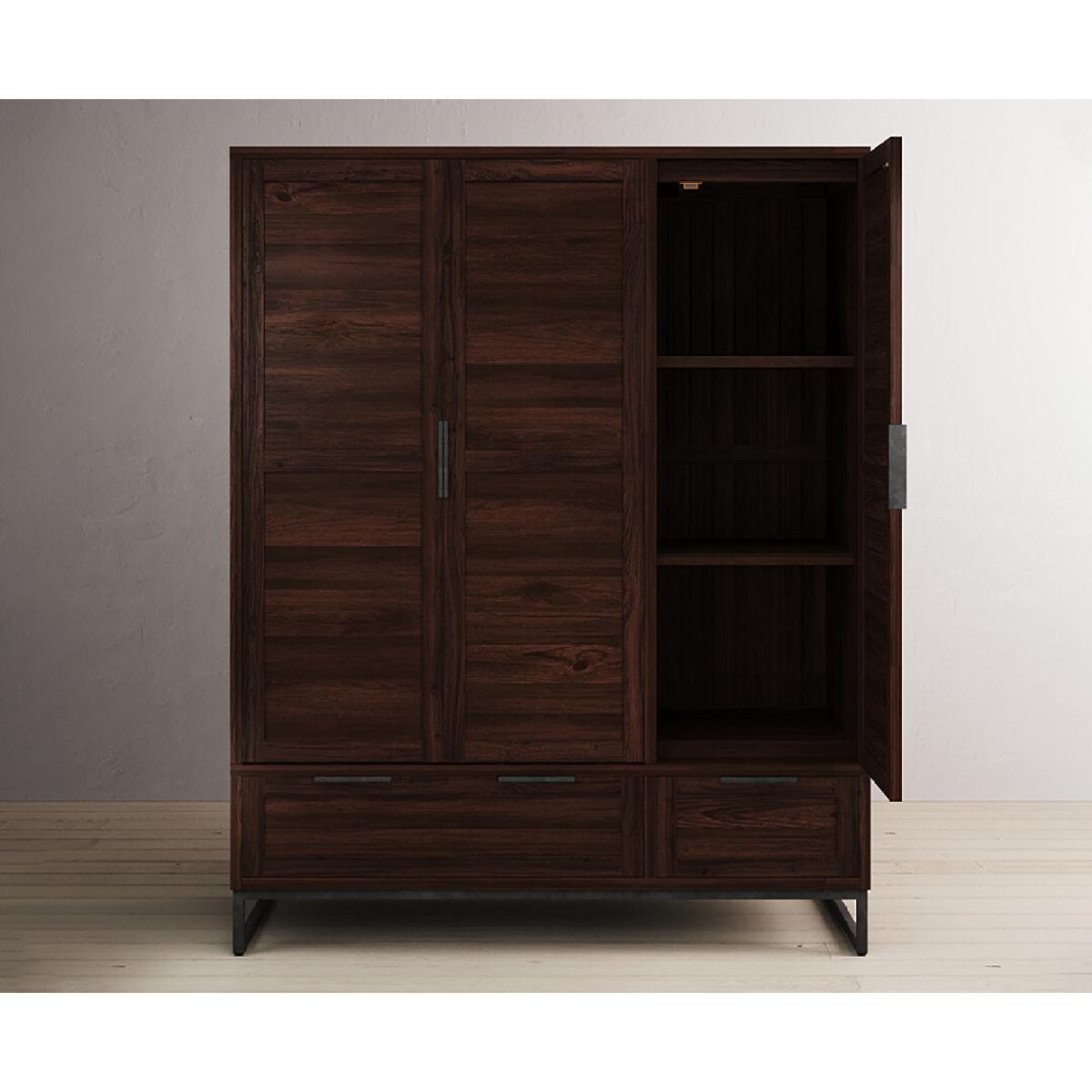 The Dakota Dark Acacia and Metal Triple Wardrobe is crafted from 100% solid hardwood and features plenty of hanging space and two dovetail drawers.