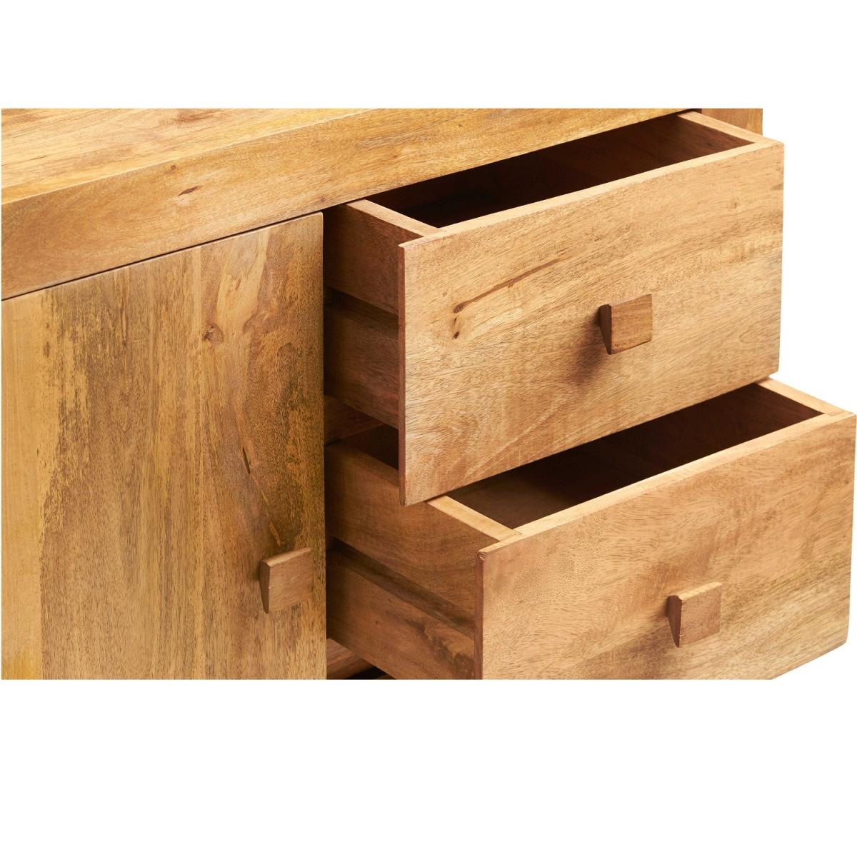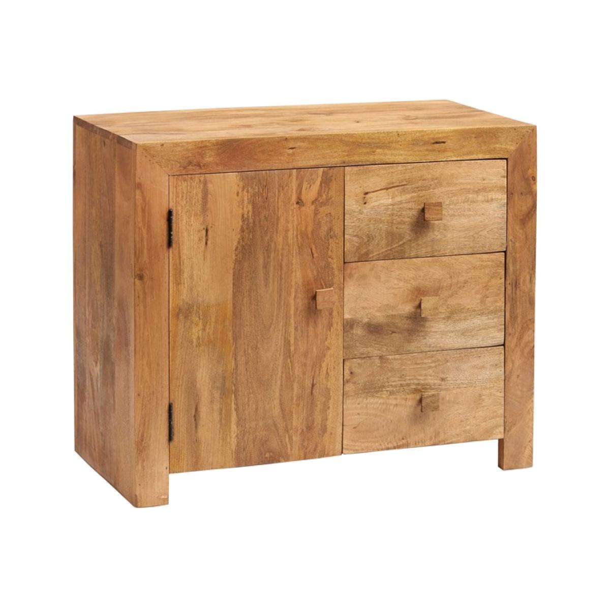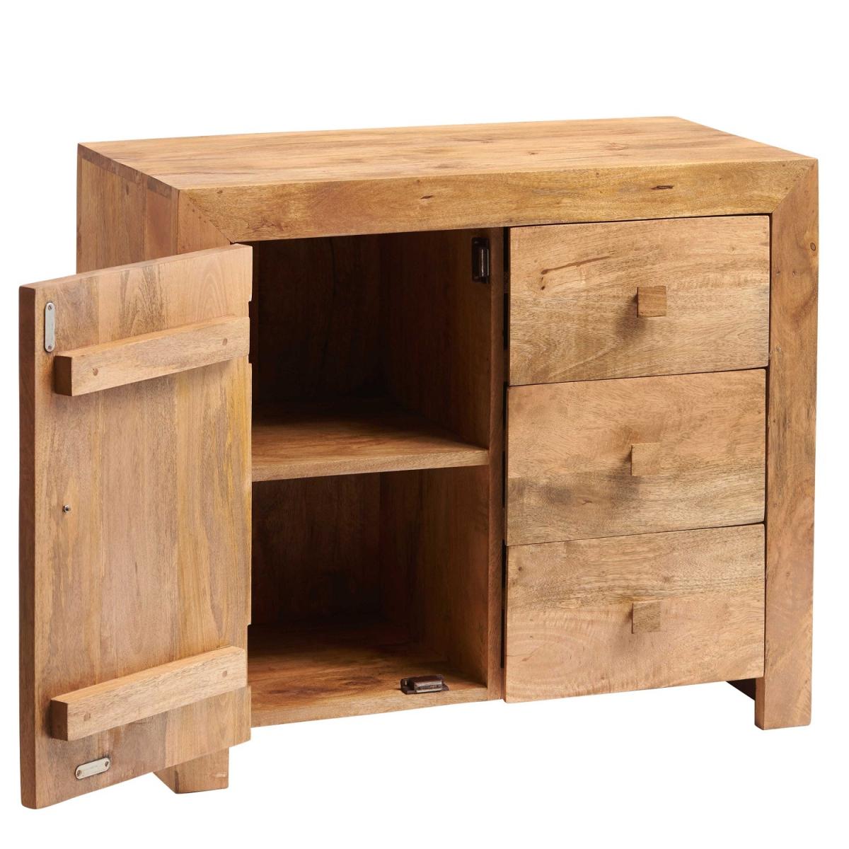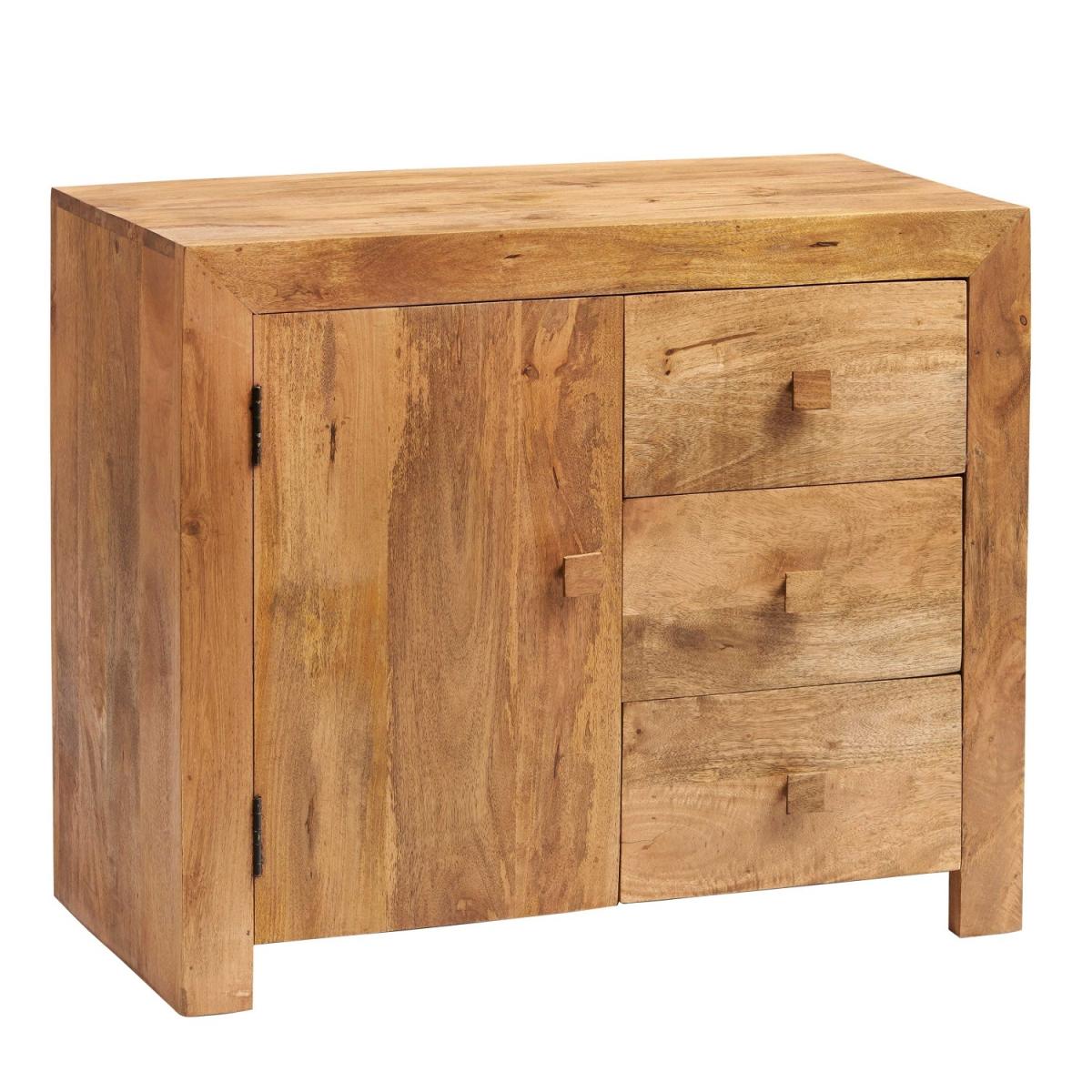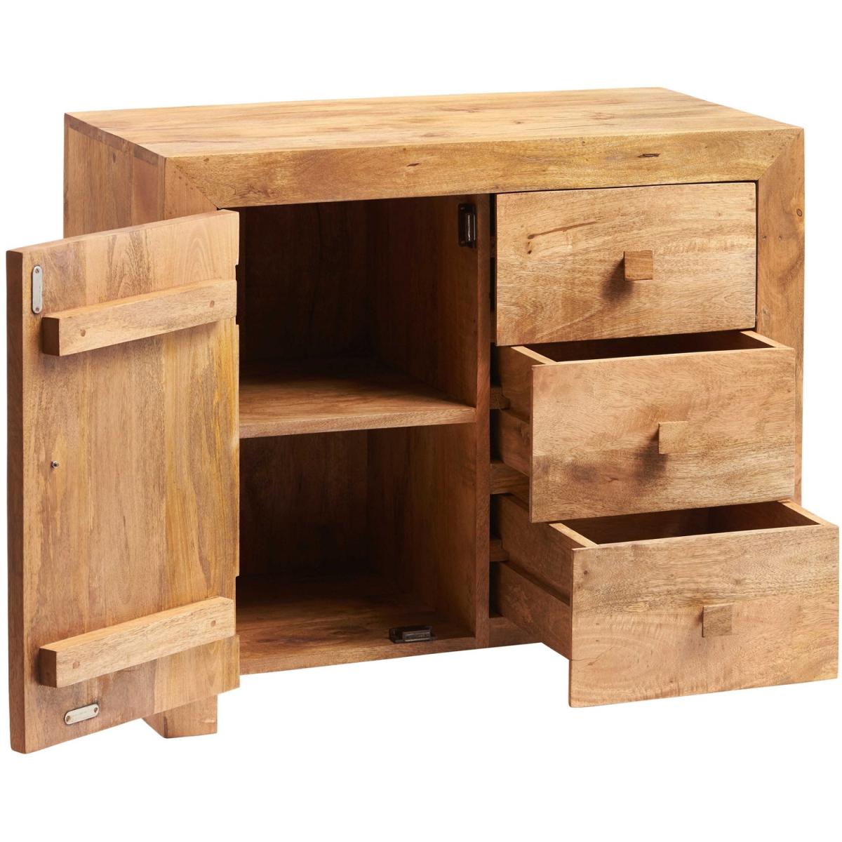 This sideboard boasts a solid light mango wood structure alongside a high-quality matt finish. This handmade piece of furniture is sturdy and durable thanks to its construction and design. Boasting three drawers and one cupboard each finished with a contemporary square handle this small sideboard offers generous storage space alongside display space on the tabletop too. Item Supplied Assembled.