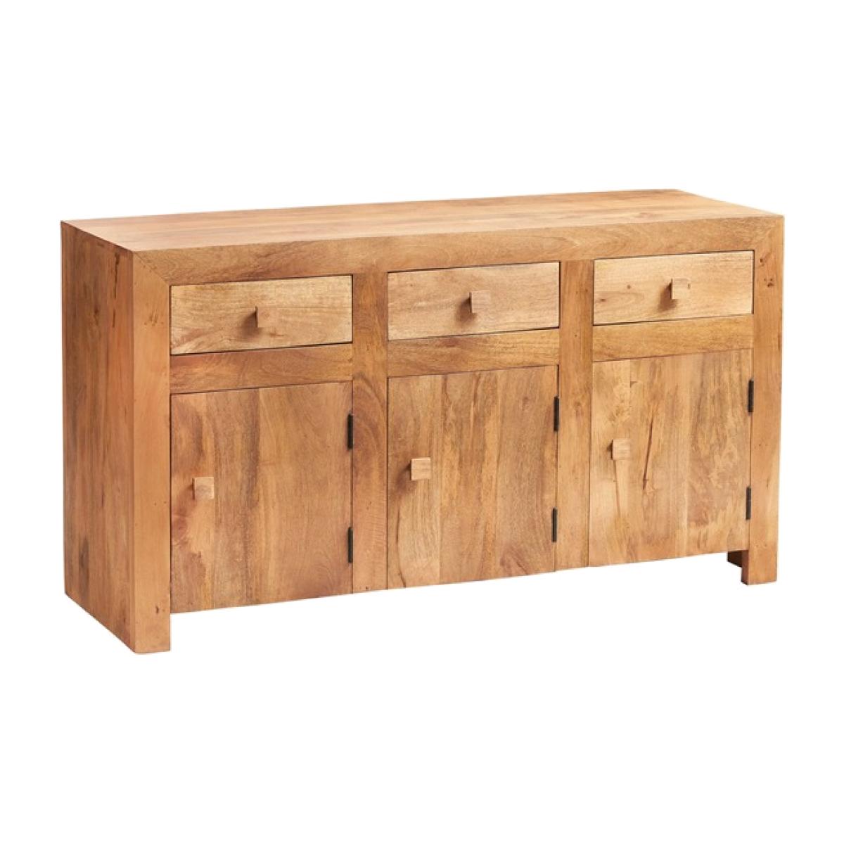 This sideboard boasts a grand size and generous features with three deep drawers and three spacious cupboards below each finished with a wooden square handle that adds to the contemporary yet classic design of this piece. A sturdy and durable choice this large sideboard is handcrafted from solid light mango hardwood and finished with a Light Stain accompanied with Matt Finish that enhances and accentuates the natural wood grain. Item supplied Assembled.