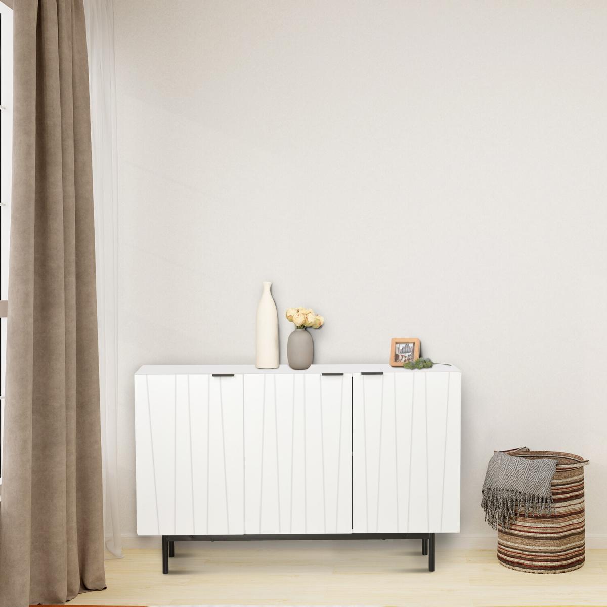I love the Dakota for its clean lines and subtle groove detailing - its matt white finish and slim black metal base make it a natural fit in Scandi, minimalist or contemporary coastal schemes. It brings light into a hallway or dining room without feeling heavyweight, and the raised legs keep the look airy. Styling it is simple: group decorative pieces in odd numbers (a trio of vases or candles), add a mirror or an art print above to create a focal point, and tuck a woven basket or storage box underneath to keep magazines, throws or toys neatly out of sight.
