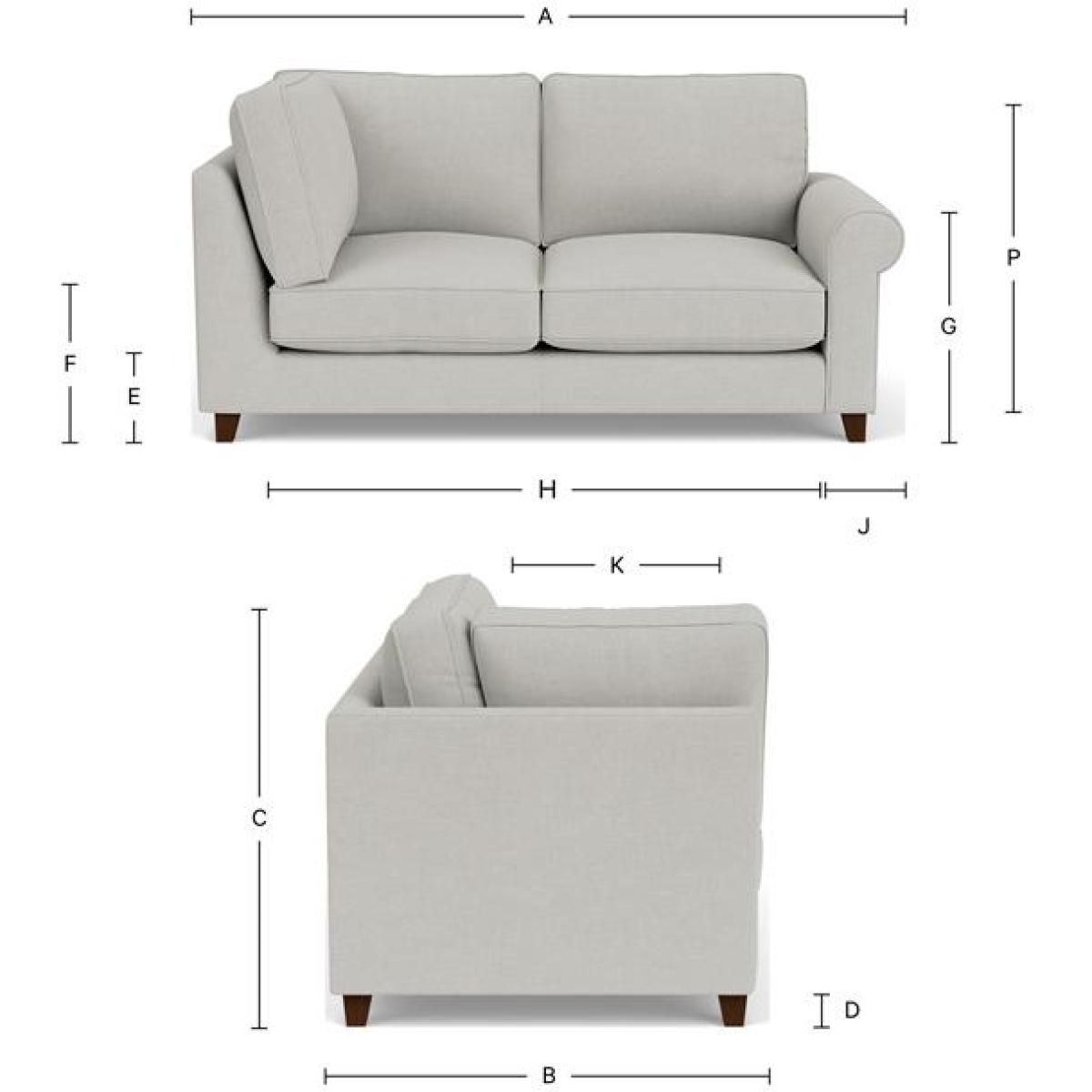 The Dalby Medium Corner Unit is ideal for creating a good-sized modular corner sofa that is comfortable and stylish. It comes in a variety of fabrics and colours. The medium corner unit does not come with any scatter cushions included, however additional scatter cushions can be added with a variety of fabrics to choose from to complement your sofa. External (cm): - Width (A) = 188 - Depth (B) = 95 - Height (C) = 96 Seat (cm): - Width (H) = 142 - Depth (K) = 62 - Height (F) = 48 Arm (cm): - Width (J) = 15 - Height (G) = 60 Legs (cm): - Height (D) = 11 Frame Height (without Feet): - Height (P) = 71