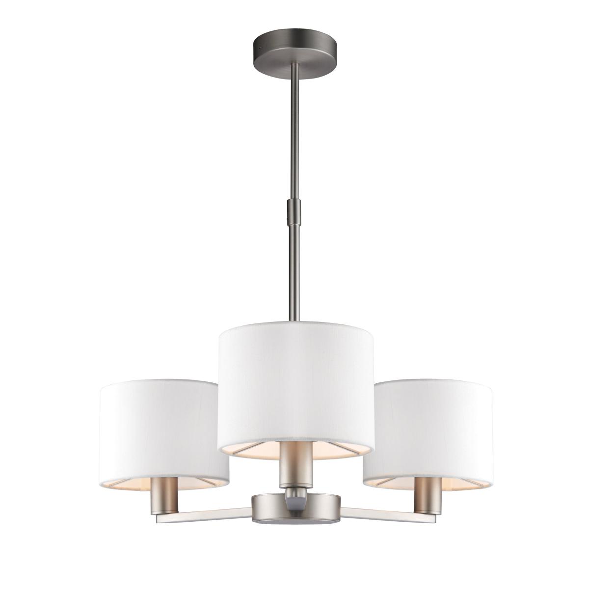 An understated modern 3 arm pendant, mixing a subtle matt nickel plated finish with timeless vintage white faux silk shades. Modern styling for today's interiors. Matching items also available.