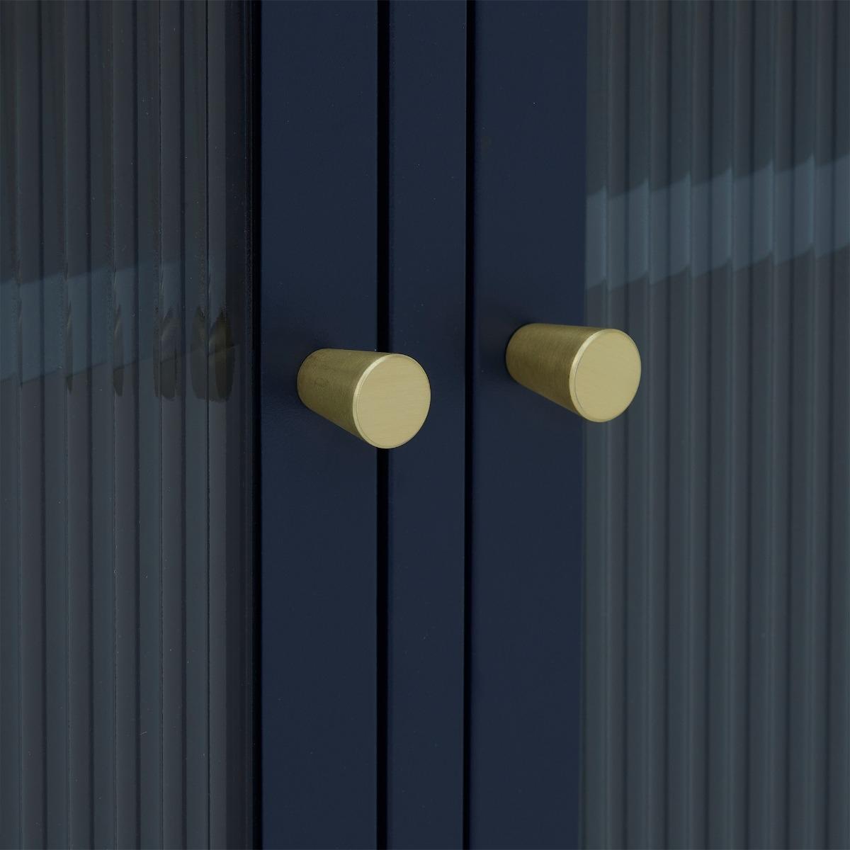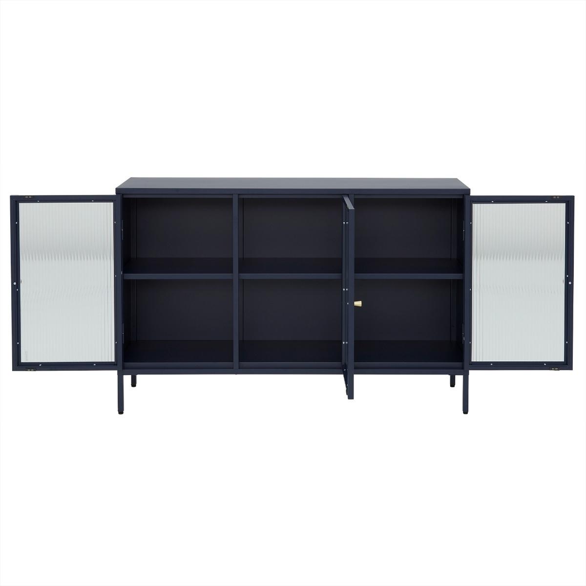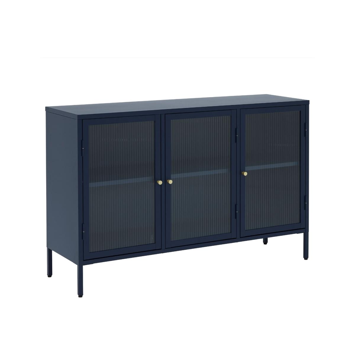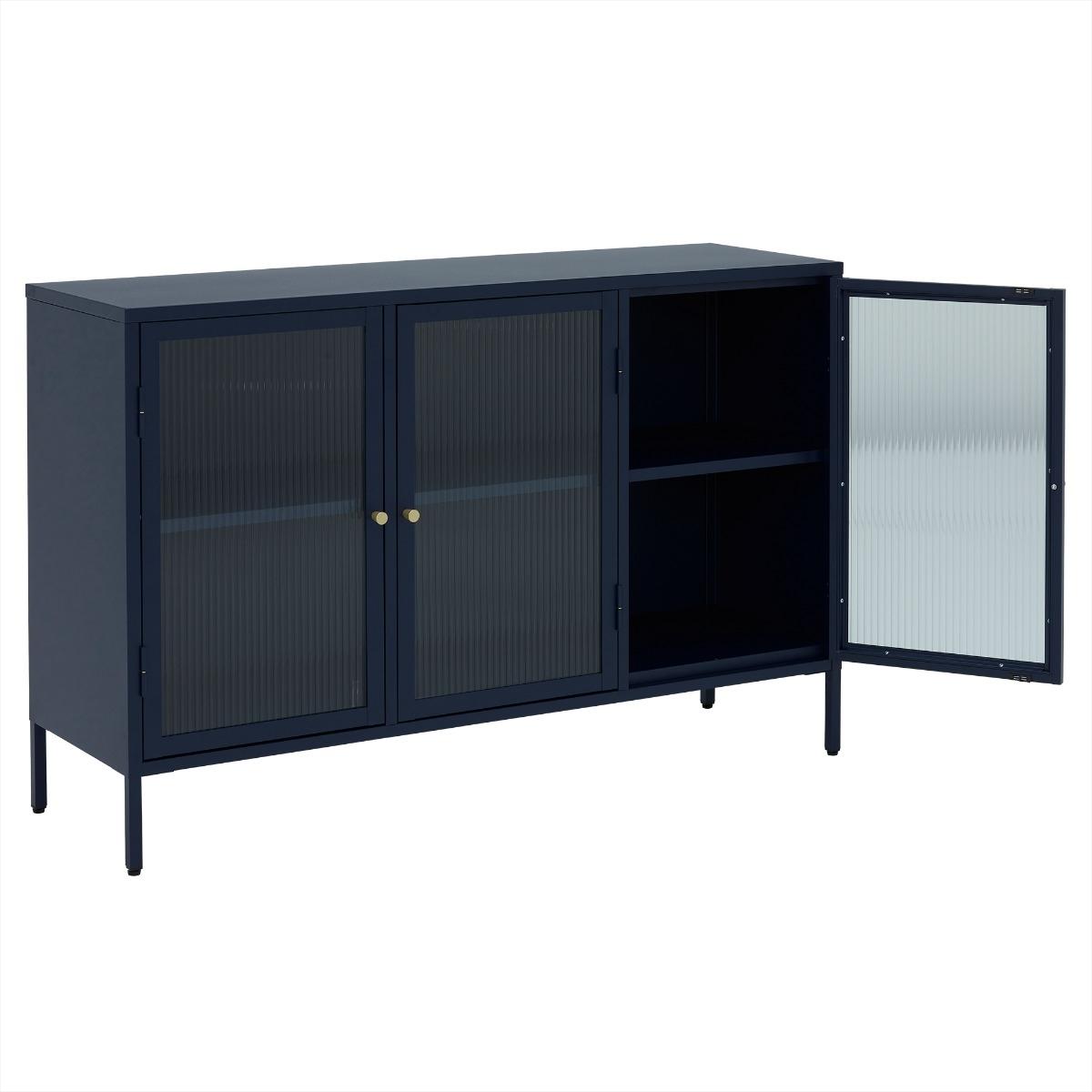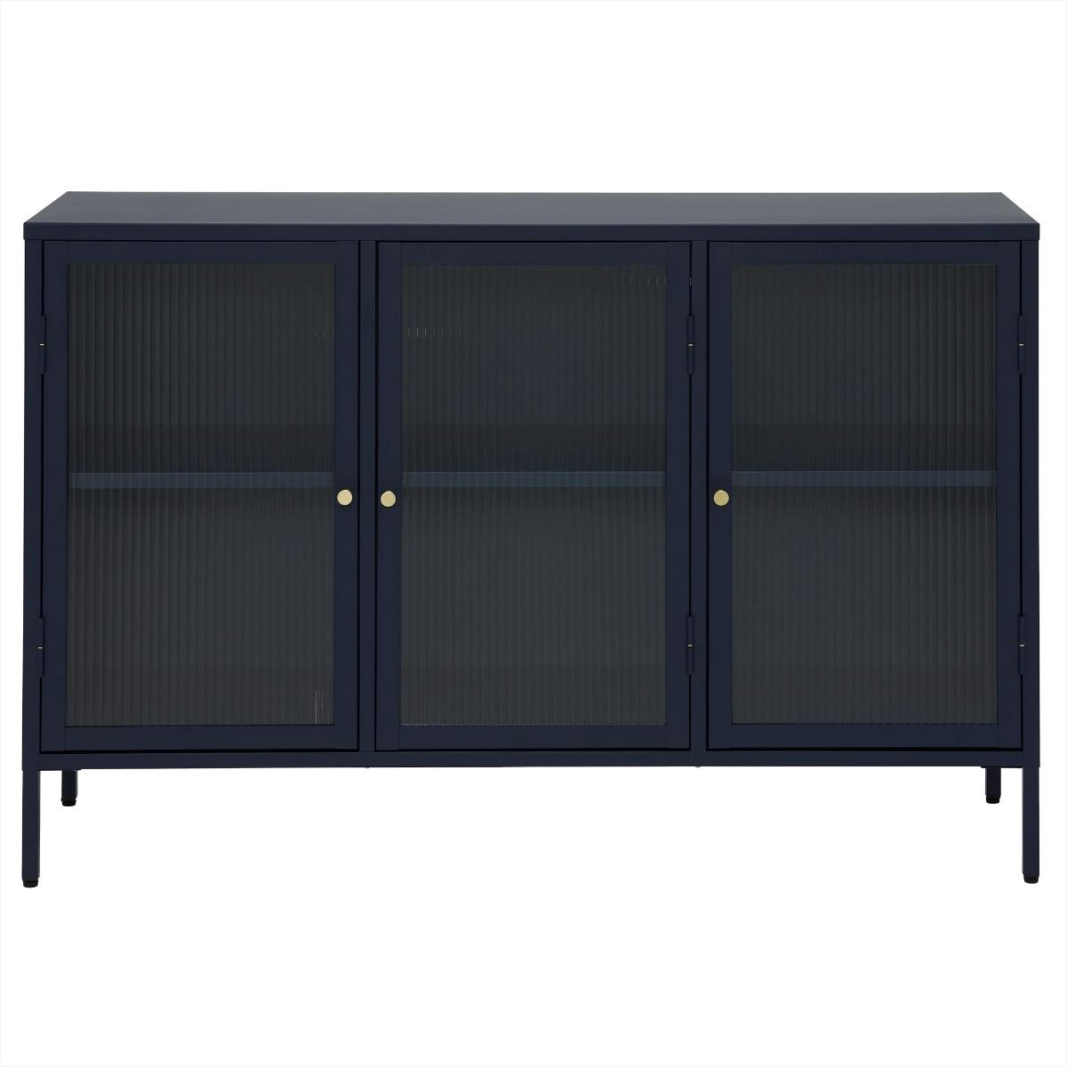 Design. Formed with rolled steel and finished with quality fluted glass fronts, the Dali 3 Section Metal Sideboard in Steel Blue is the ideal furnishing to introduce personality and colour into your space. The gold handles and hinges compliment the dark blue frame in an elegant manner, ensuring style and practicality are of equally important measures. The Steel Blue Dali Metal Sideboard matches perfectly alongside the. Steel Blue Dali Glass Tower Cabinet. For a cohesive finish to your interior.
