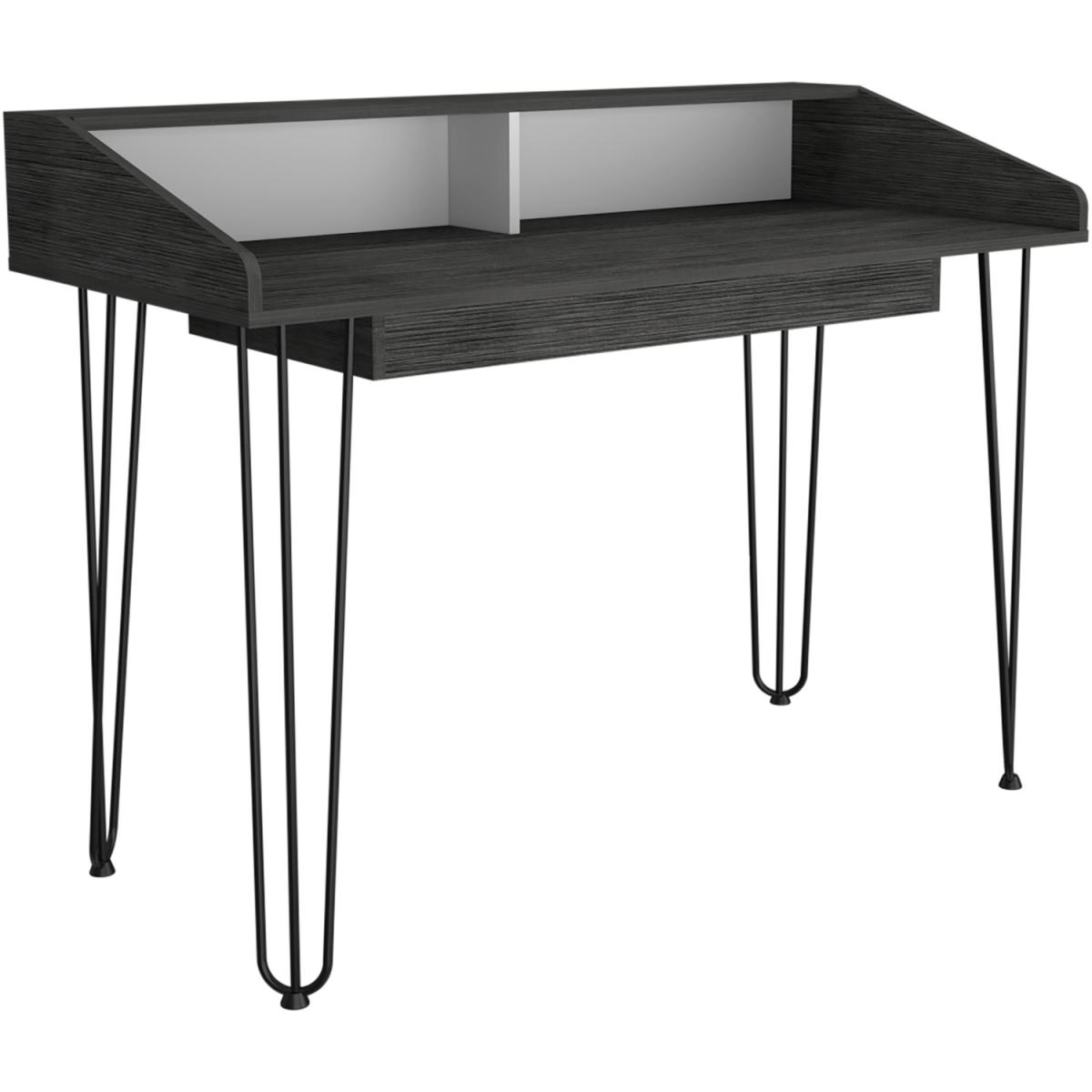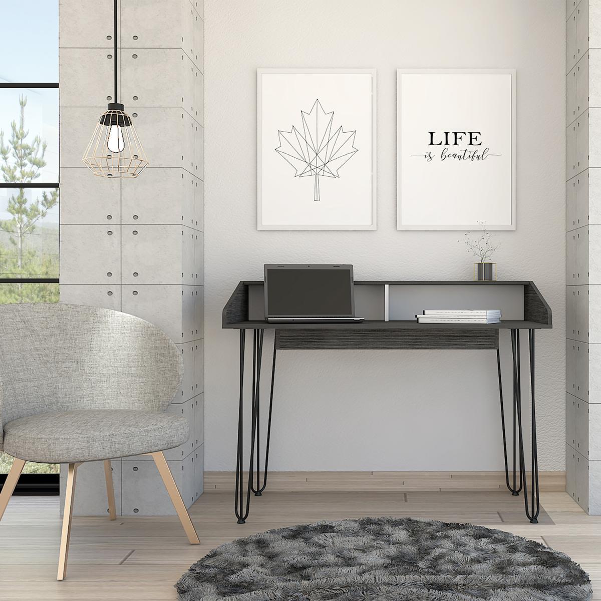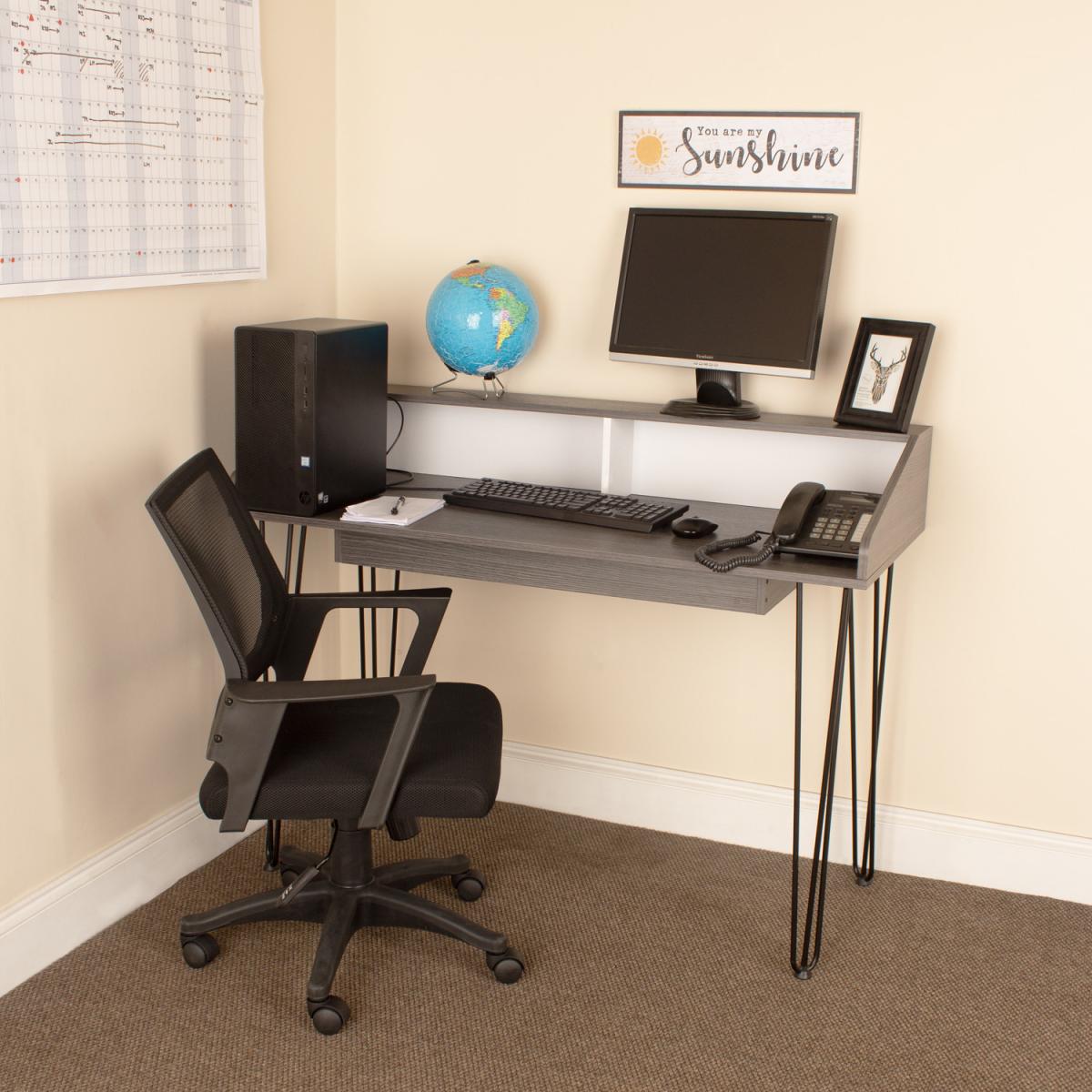 This stylish home office desk and chair set is ideal for working from home or for creating your own home study area. The metal hairpin design legs give your work space an up to the minute look, whilst the reinforced base gives stability and strength. The white and carbon grey oak effect melamine finish is both on trend and hard wearing. The home office chair has a black upholstered seat and black mesh back. The black plastic moulded base has castors and the gas lift ensures the height can be adjusted to suit your needs. Maximum weight capacity 120 KG.Dimensions :Desk - 120.1w x 55.2d x 90h cm Chair - 62w x 58d x 90-100h cm