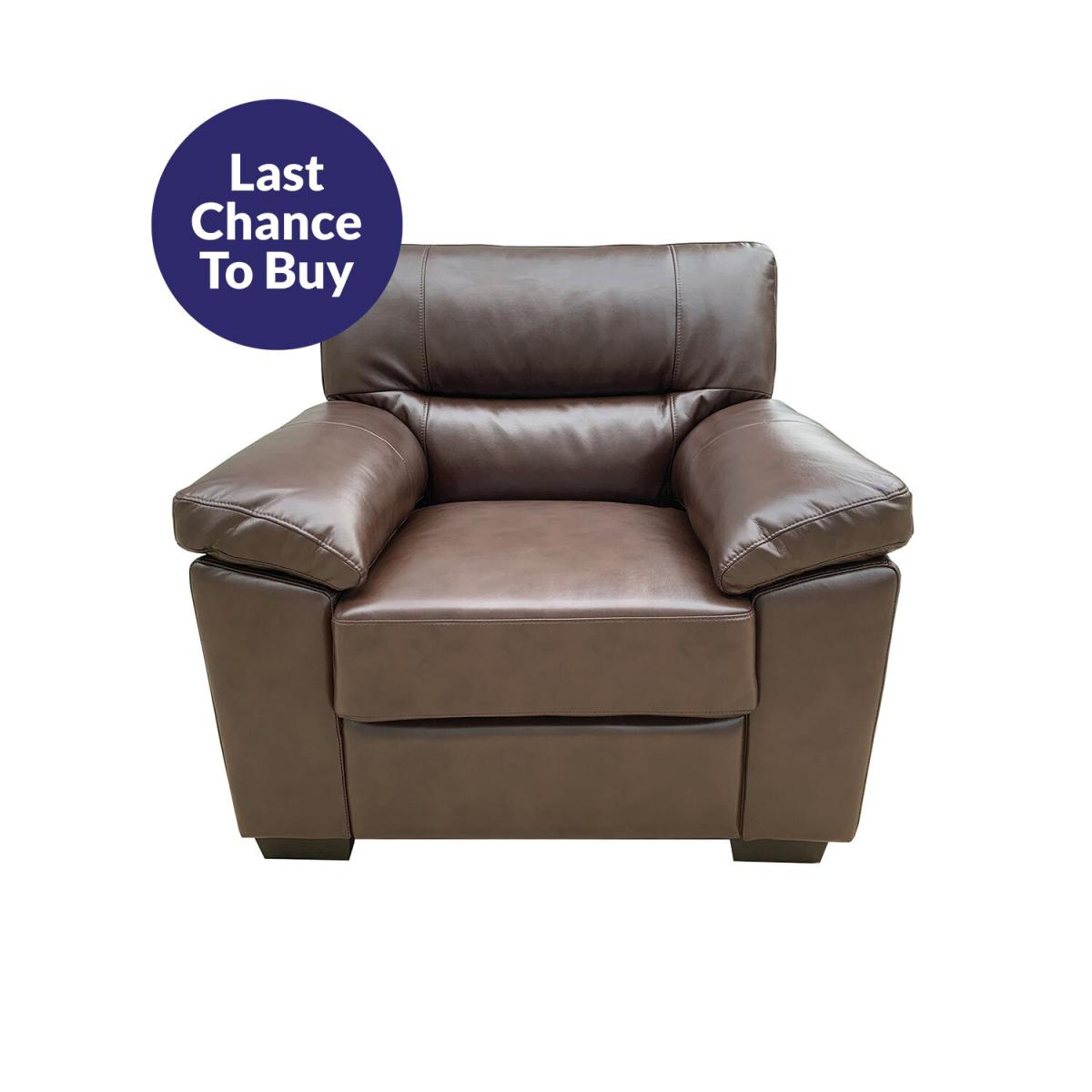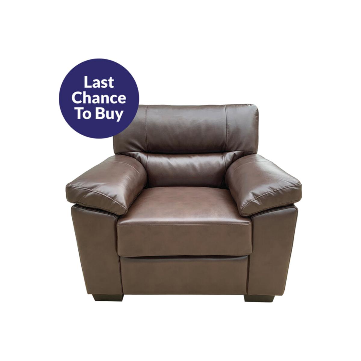 Boasting a warm brown faux leather exterior and square legs in a sophisticated dark tone, the Dalmore Chair is a rustic yet contemporary seating solution for your living space. Its rich chocolate upholstery conceals a sturdy wooden frame and plump cushioning, allowing you to relax in complete comfort. Part of a coordinating living room furniture collection with matching 2 & 3 seater sofas available, this armchair will add inviting contemporary style to your living room.