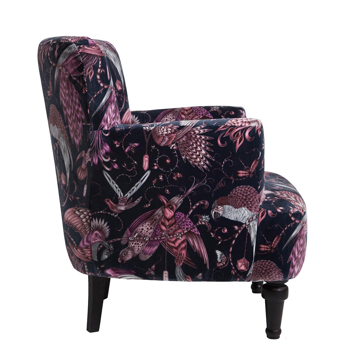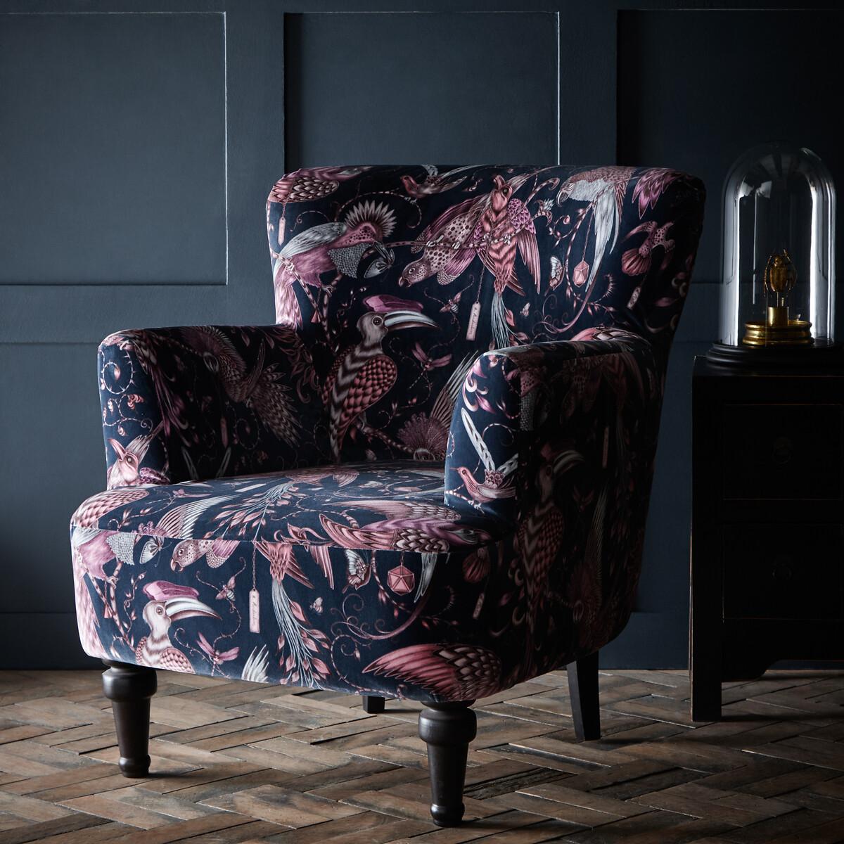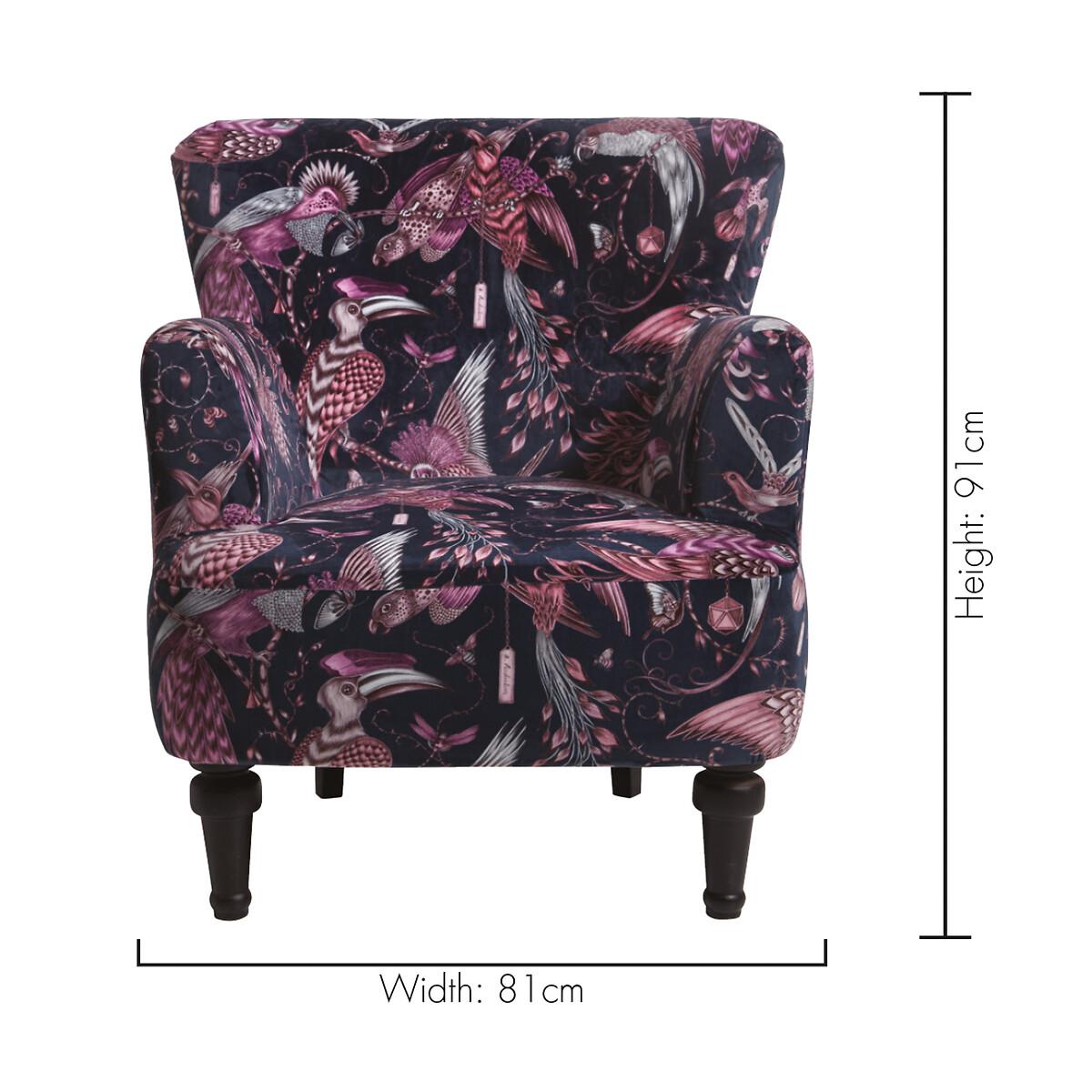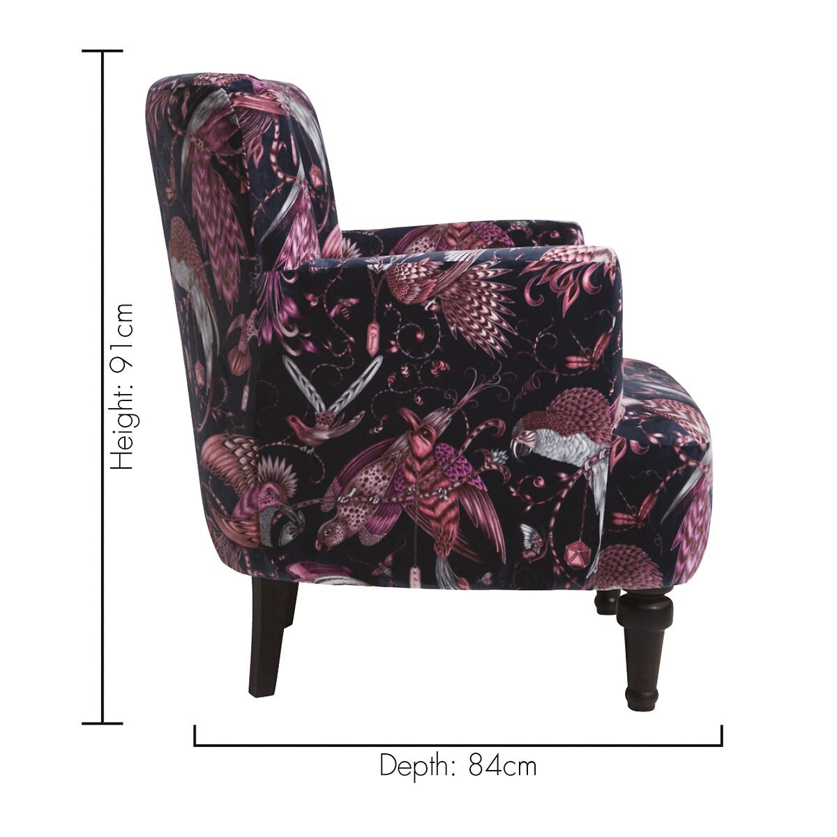 The Audubon design comes to life in tonal pinks on an inky ground, printed onto beautiful, rich velvet. This luxurious and imaginative armchair is a statement piece sure to spark conversation. Product Details Velvet upholstery Foam and fibre filling. Solid beech legs. Wooden frame Sponge clean only. Please note this product has a weight limit of 130 KGComposition Fabric- 100% Polyester, Legs- 100% Beech Wood, Filling- 100% FR Foam. Product Dimensions - 82 cm x82 cm x91 cm. Product Weight - 15 KGPackage Dimensions - 84 cm x 81 cm x 84 cm. This product will be dispatched by one of our trusted suppliers. You’ll be contacted by their selected courier about your delivery. Please note that this item cannot be delivered to the Offshore Islands, Northern Ireland or the Republic of Ireland.