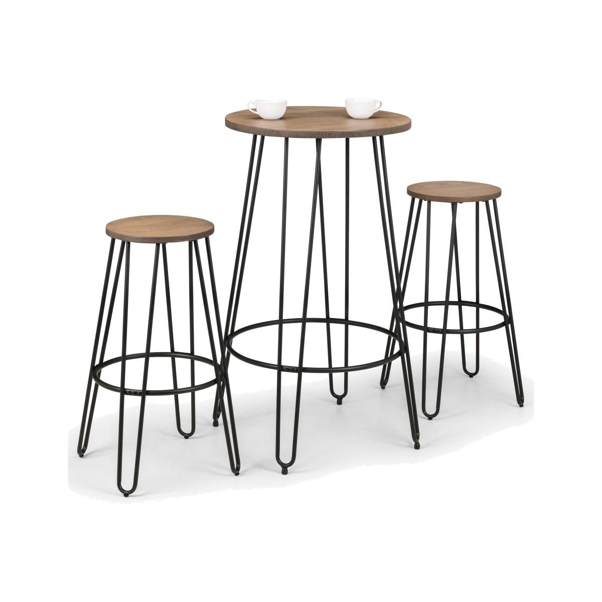 Crafted from solid elm wood with black powder coated steel legs, this bar set is perfect for adding that modern feel to your home. With hairpin legs these chairs a modern feel. This modern bar set is perfect for smaller homes and rooms as it is space saving and a perfect alternative to a large dining table.