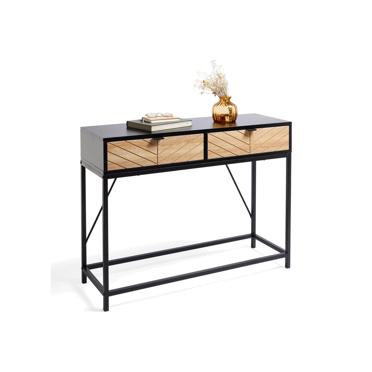 Introduce a touch of retro style into your home with the Von Haus Dalton console table. The engraved chevron detailing takes inspiration from characterful 1970s design, whilst the bold metal frame adds a modern industrial edge. All finished in neutral sure to suit any home! More than just a retro statement piece, this hallway table is a functional and versatile addition to any space. The industrial-style legs and frame are constructed from robust steel, finished with a powder coating to ensure style and longevity. And its not just for the hallway, why not use it as a bedroom desk or dressing table? With a 50kg weight capacity, you can use it wherever you need. Simple assembly is required, with all the necessary screws and fittings included.