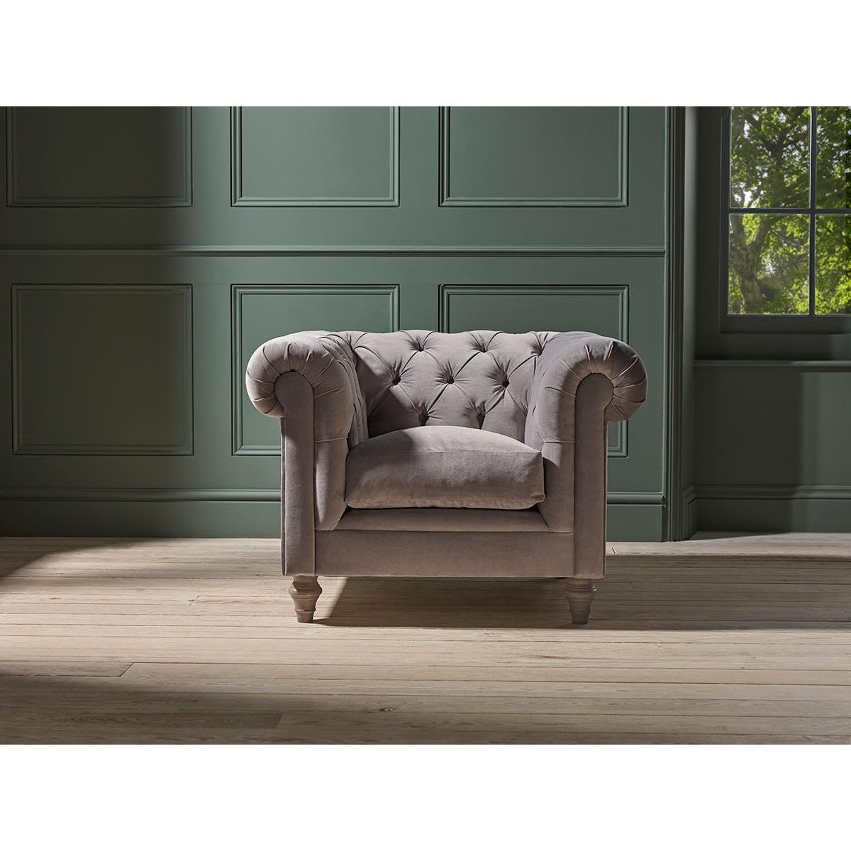 Our Dalvik armchair has low sides and a deep tufted button back for a hint of sophistication. Plump feather filled seat cushions and hand pleated rolled arms complete the design which sits on elegant hand turned wooden feet. The Dalvik range includes two seater and three seater sofas, an armchair and an ottoman. Our Dalvik collection can be upholstered in a choice of 34 distinctive shades and six fabrics to suit your style. Read our Upholstery FAQs View our full Upholstery Terms and Conditions