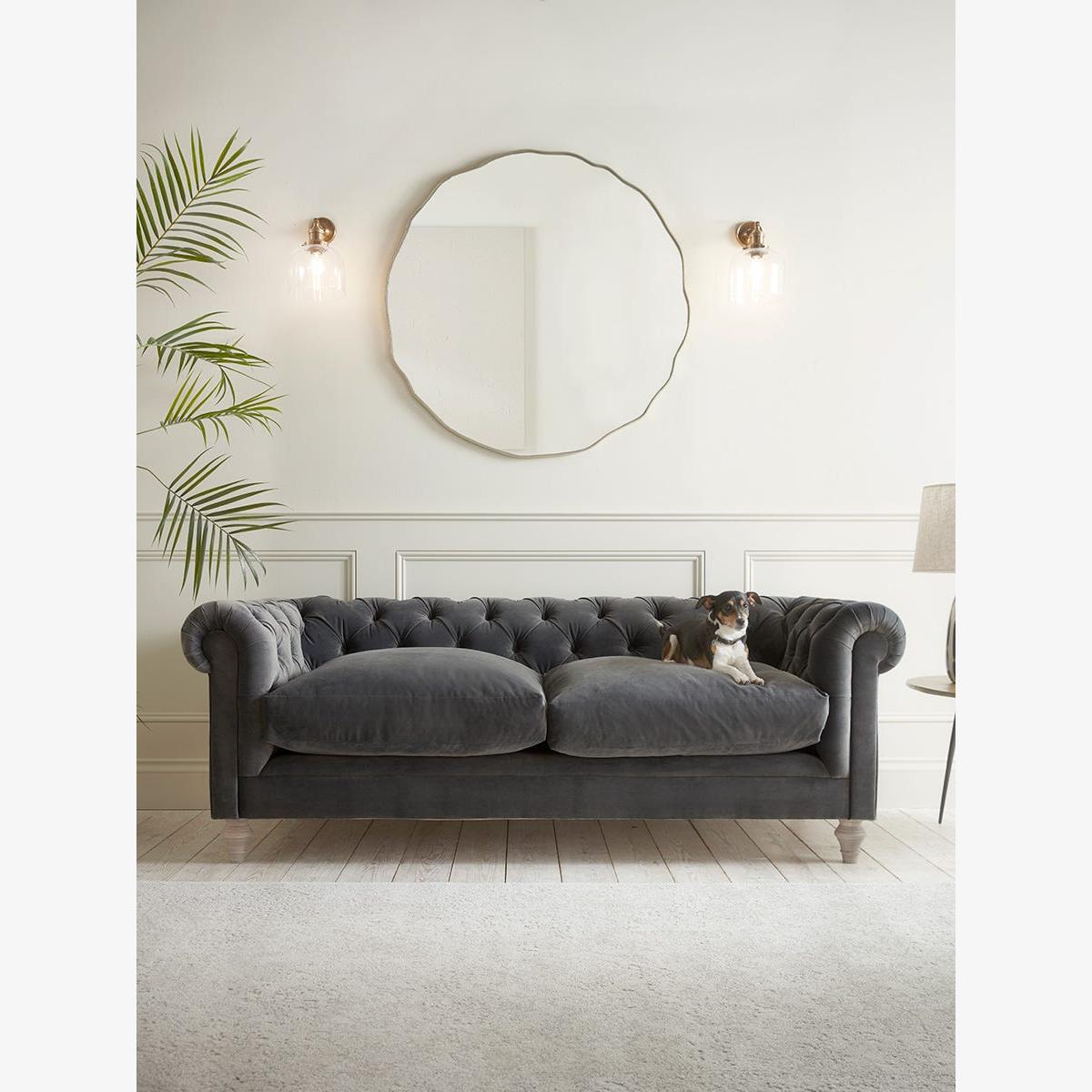 With a low back and sides and deep tufted button back, there’s a sophisticated hint of country house snug to our Dalvik sofa. Plump feather filled seat cushions and hand pleated rolled arms complete the design which sits on elegant hand turned wooden feet. The Dalvik range includes two seater and three seater sofas, an armchair and an ottoman. Our Dalvik collection can be upholstered in a choice of 34 distinctive shades and six fabrics to suit your style. Read our Upholstery FAQs View our full Upholstery Terms and Conditions