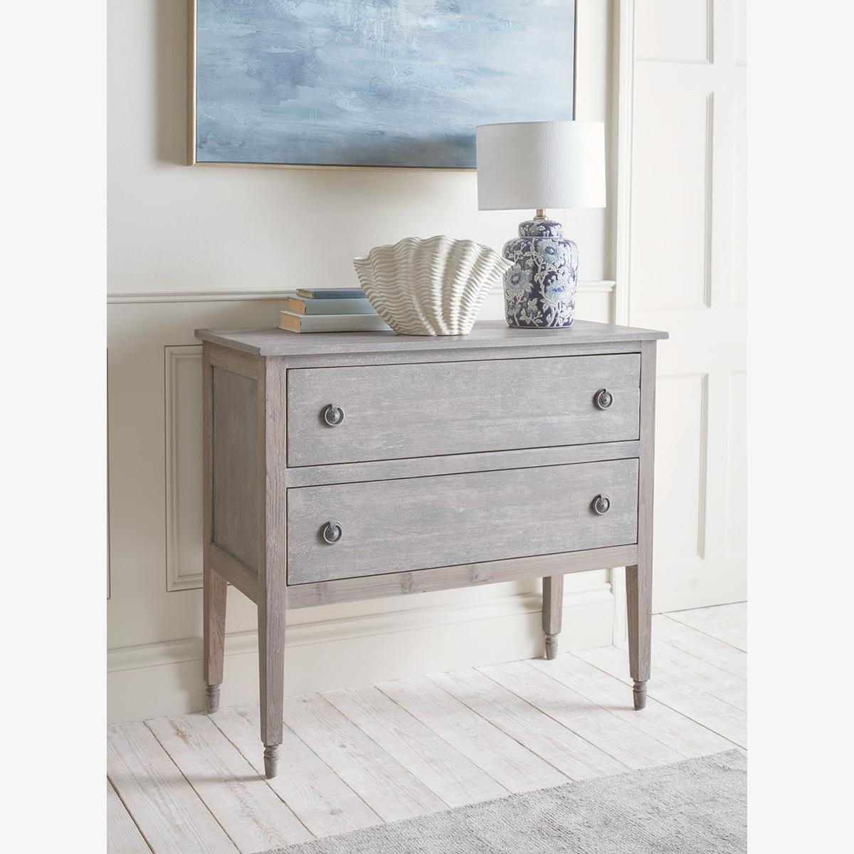 With its elegant proportions and gentle grey painted finish, this two drawer chest is a stylish storage piece. Crafted from reclaimed pine with tapered legs finishing in simple carved feet and classic plate and drop pull ring handles, it is a character filled piece of furniture that will complement any setting.
