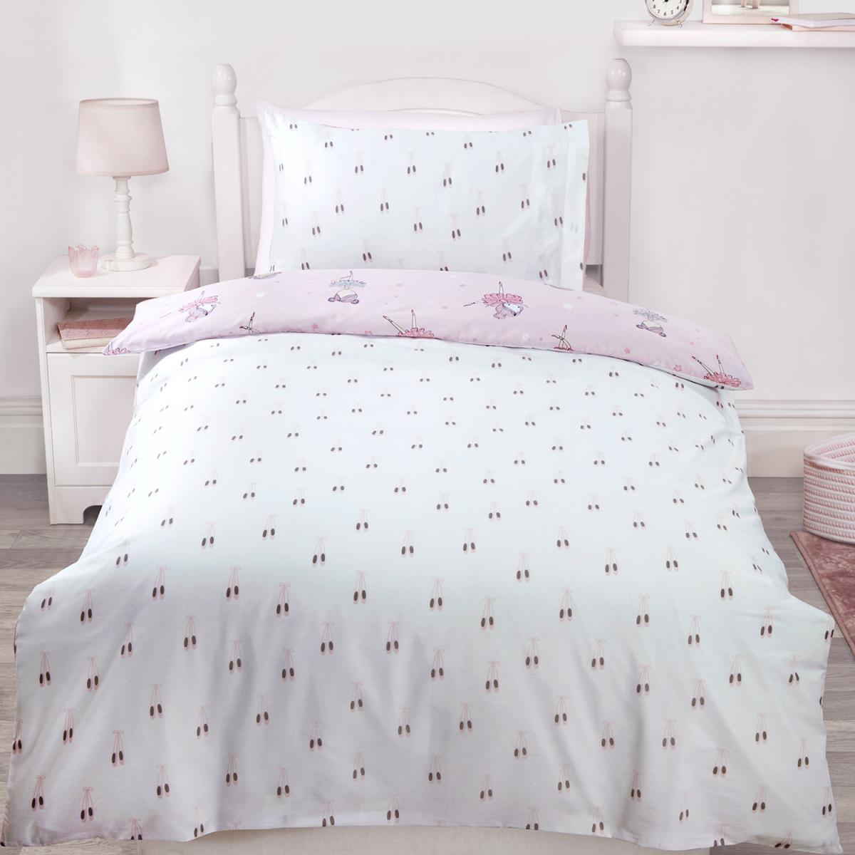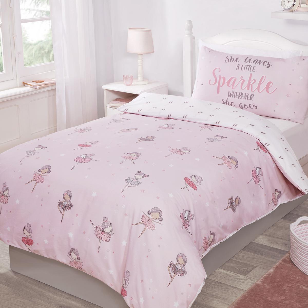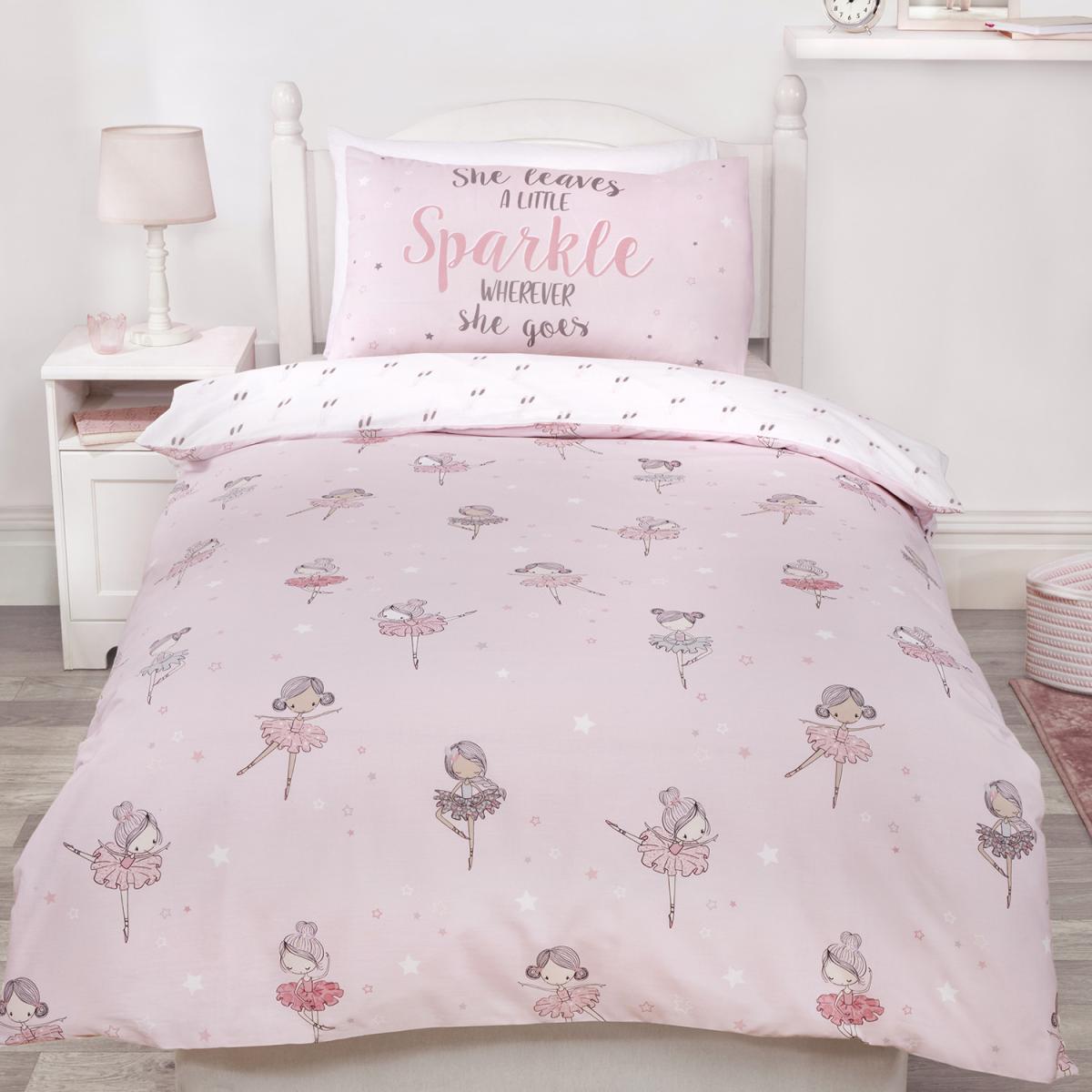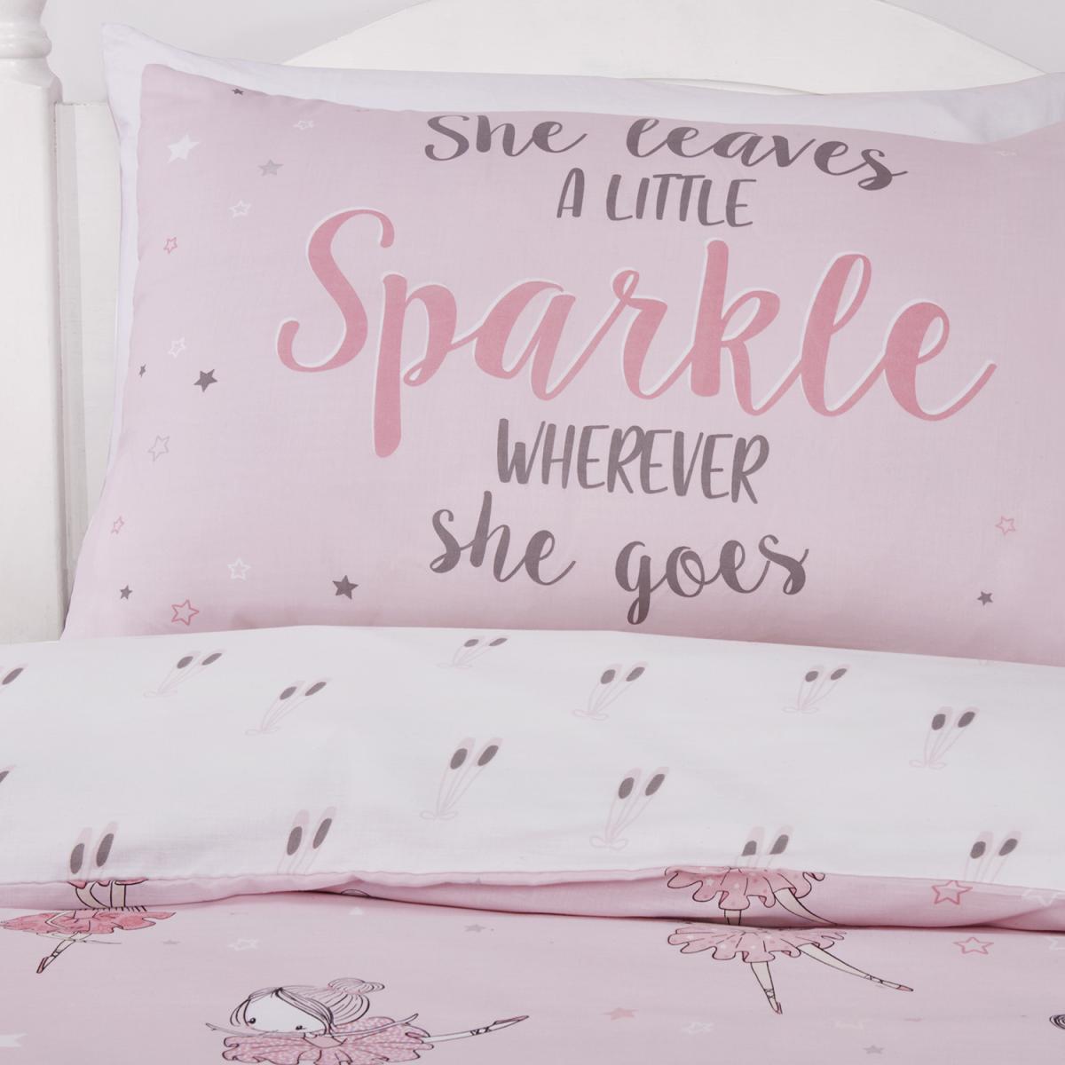 Perfect for any little ballerina in training, the Dancing Ballerinas Duvet Set is a sweet addition to any child's bedroom. This set features a duvet cover with a reversible design in candy pink tones - ballerinas on one side, and delicate ballet slippers on the other. Coming with a matching pillowcase that says "she leaves a little sparkle wherever she goes," your little one is sure to feel like the next prima ballerina when they snuggle under this comfortable and cosy set.