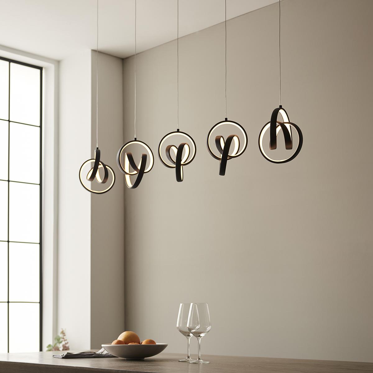 I love the dangle five light pendant in textured black for its modern, sculptural appeal and versatility. It's especially effective in contemporary or industrial interiors, where its bold black finish adds contrast and character. The unique, knotted design of the pendants makes it a striking statement piece over a dining table or kitchen island, but it also works well in more minimalist spaces when styled with clean-lined furniture. A practical tip would be to keep the surrounding decor simple to let the pendant shine; pairing it with neutral tones or monochrome palettes will enhance its edgy yet sophisticated look. Adjusting the height of each pendant can also help create a personalised and dynamic arrangement that suits the space perfectly.