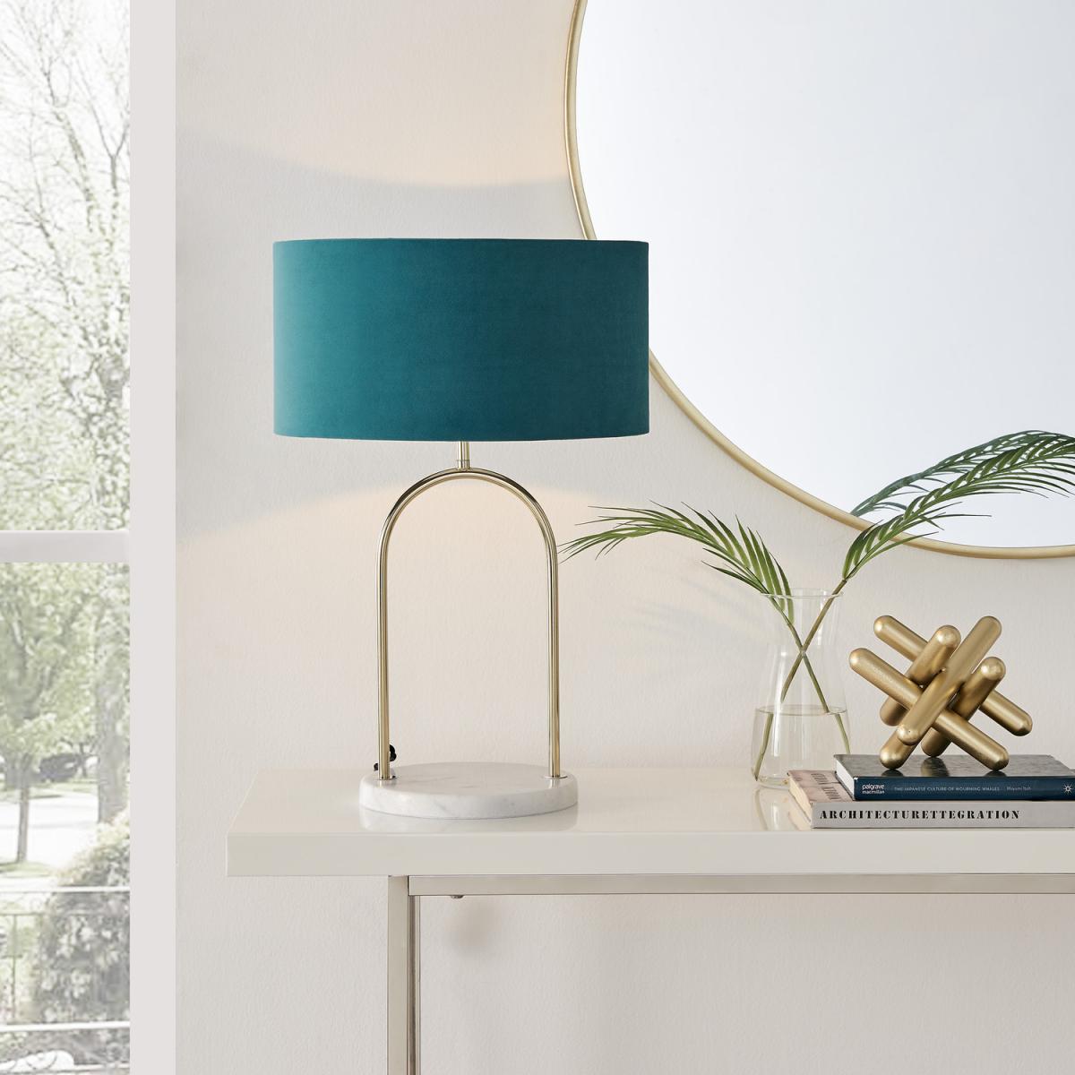 Our Danielle table lamp has a teal velvet fabric lamp shade, brass arched stand and white marble base and will be the perfect lighting addition for your living room, bedroom or even office desk. The Danielle is a modern glam take on more retro vintage styles, with nods to 1920s art deco design but still in keeping with contemporary minimalist trends. It's structural yet simple and eye-catching. Featuring a solid white marble base with grey veining, and brass plated arched stand, topped with a teal velvet fabric lampshade. A gorgeous combination of materials and colours that creates contrast. This table lamp would look stunning in any modern home, from maximalist to minimalist, glam to industrial. Perfect for any desk, table or console. With a black corded cable and rocker switch. Is this the desk lamp for you? Check out our full lighting range for more ideas. Requires one 18W E14 bulb (not included).