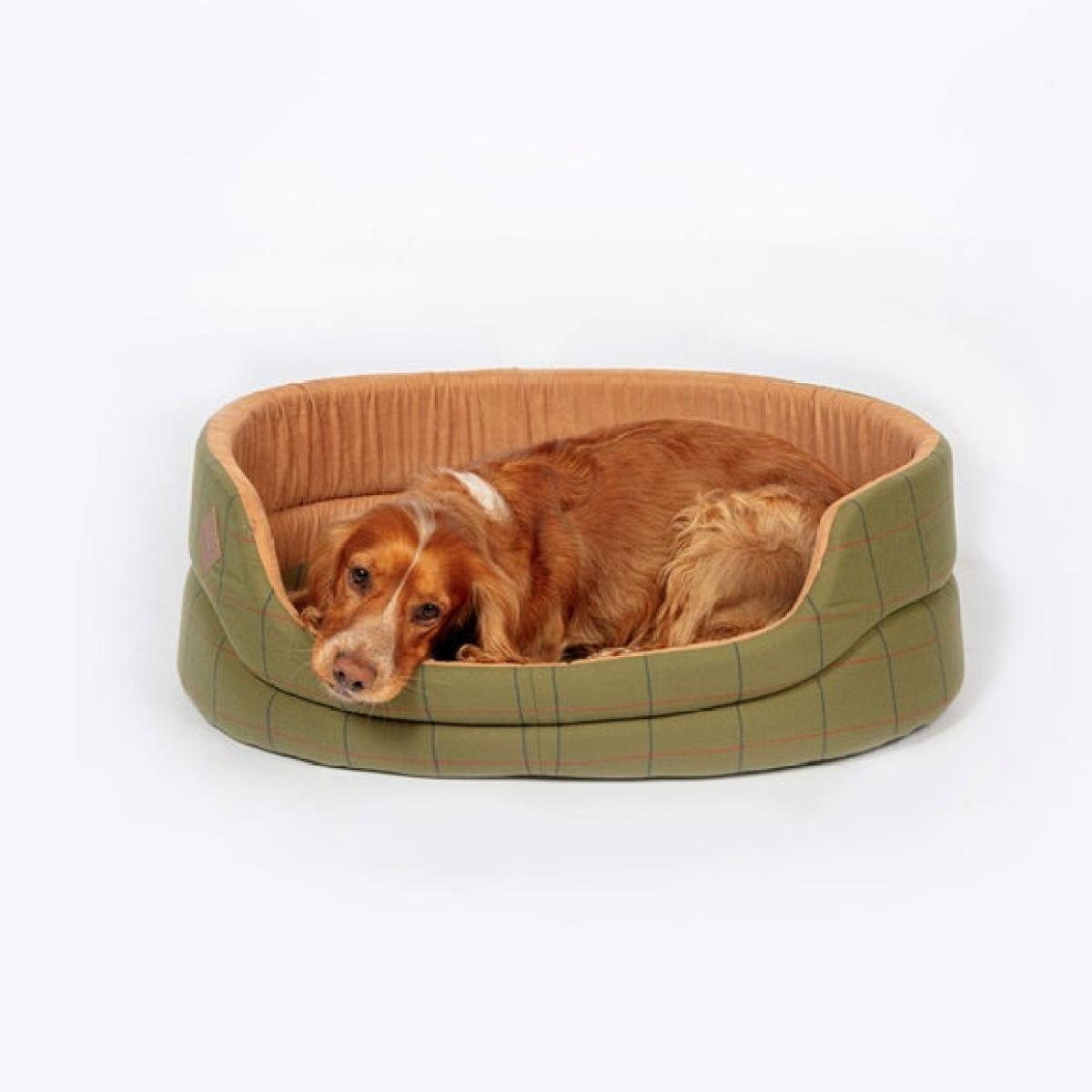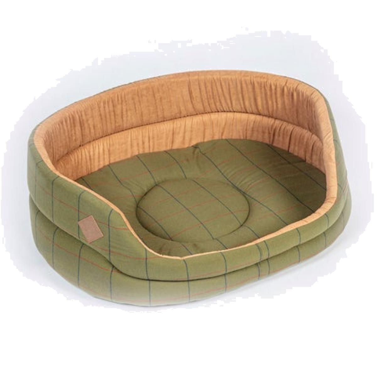 * Tweed and Faux Suede dog bed * Fibre filled * Hypoallergenic * Machine washable cover This traditional oval-shaped bed is available in various sizes, ranging from 53cm to 101cm, making it a perfect fit for pets of all sizes. Made with country green tweed and faux suede, it’s filled with Ecoflex, a hypoallergenic, chemical-free, and recycled filling that provides both comfort and sustainability. The removable, machine washable mattress ensures easy care, while the UK craftsmanship offers lasting quality.