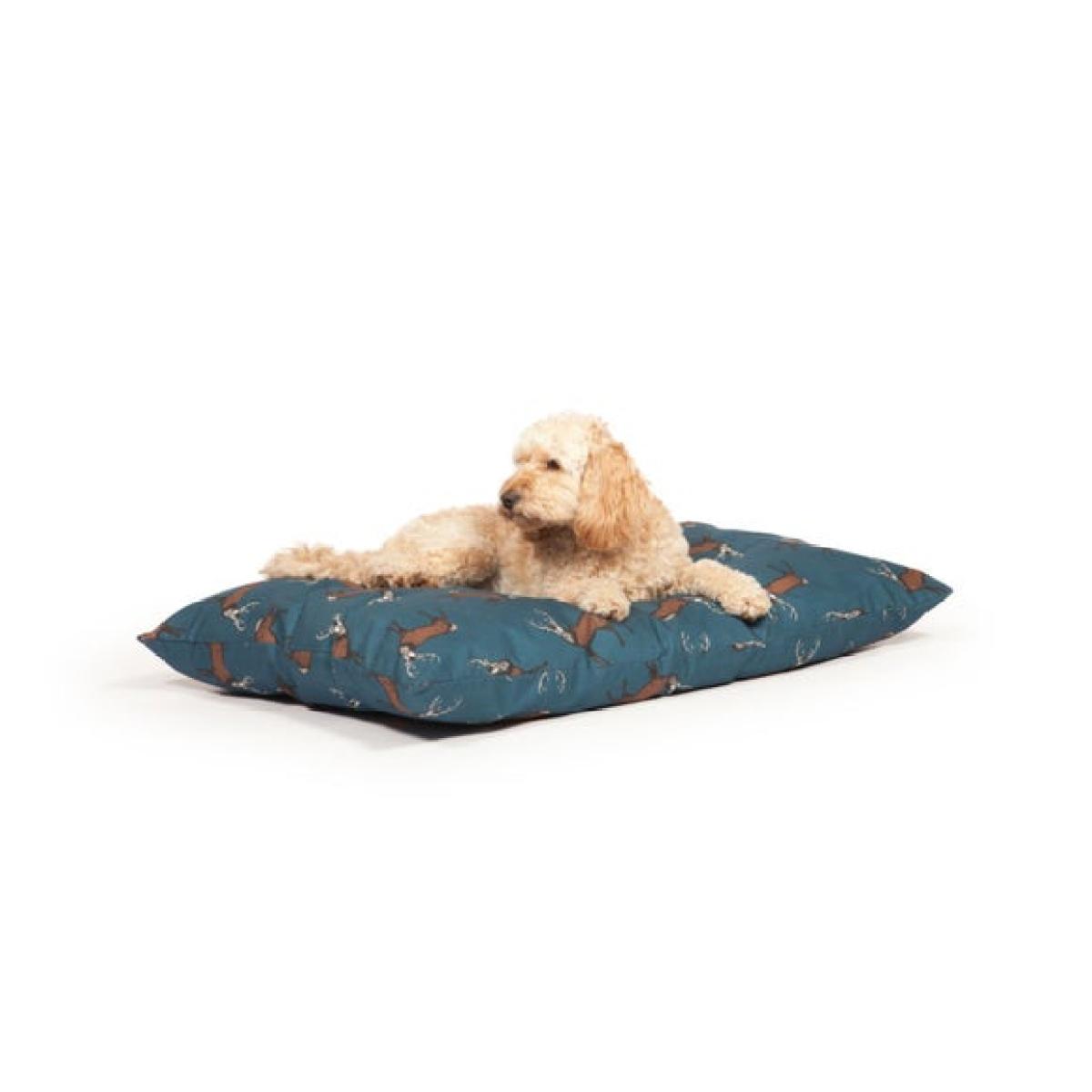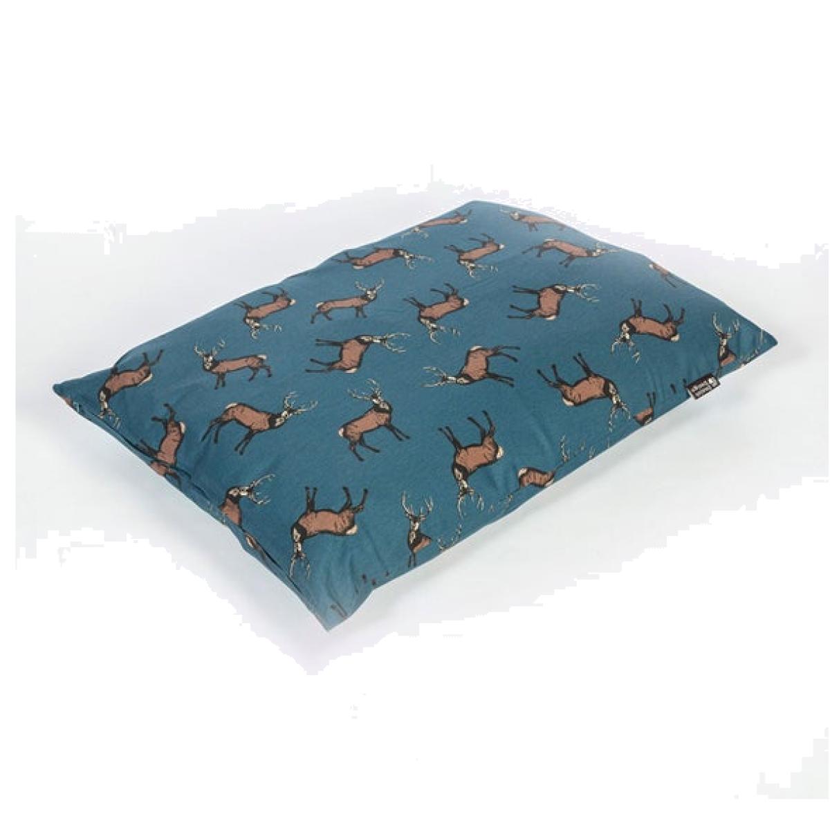 * Plush dog bed * Fibre filled * Machine washable cover Available in both large and medium sizes, this luxury deep duvet combines comfort and style with a charming woodland stag print. Made in the UK and filled with a proportion of recycled fibre, this duvet offers a soft, eco-conscious surface for your pet. The removable, machine washable cover makes it easy to maintain, while the deep filling provides extra cushioning and support.
