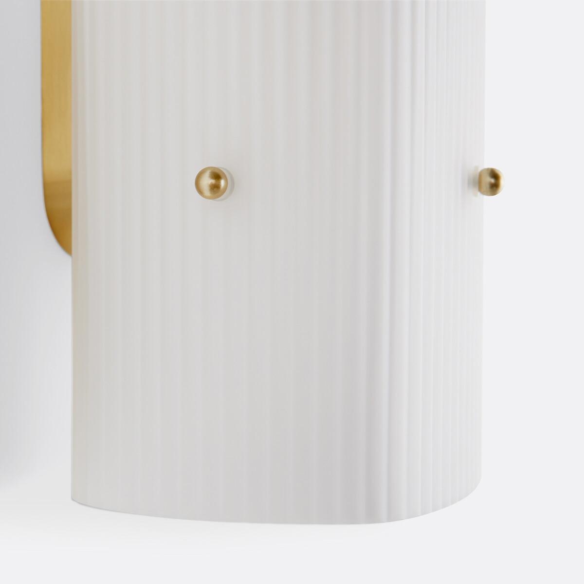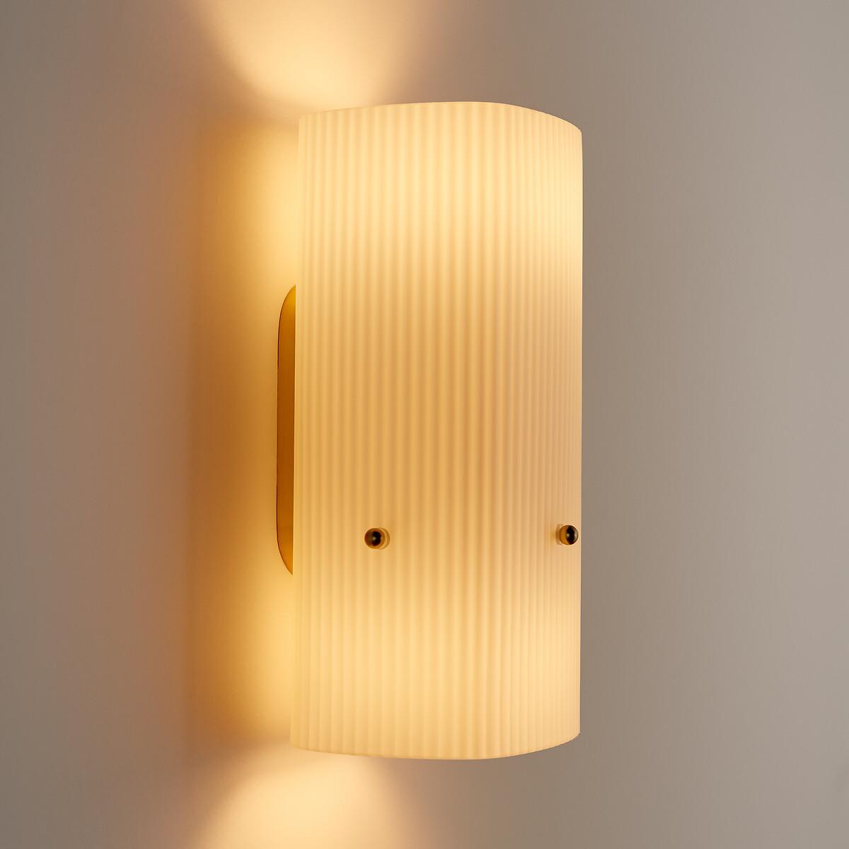 Minimalist aesthetics. A harmonious marriage of brass and streaked glass. The soft light created by the opaline glass. With the La Redoute Interiors signature, the Danny wall lamp combines classic elegance and contemporary allure. Product Details • Brass-finish iron structure • Ribbed opaline glass lampshade • E14 socket for LED bulb of 4W max (not supplied)Dimensions • Width: 14.9cm • Height: 30cm • Depth: 14.5cm • Lampshade:L12.1 x H30 x D12.1cm. Parcel dimensions and weight: • 1 parcel • L24 x H36.5 x D20cm. 1.8kg.