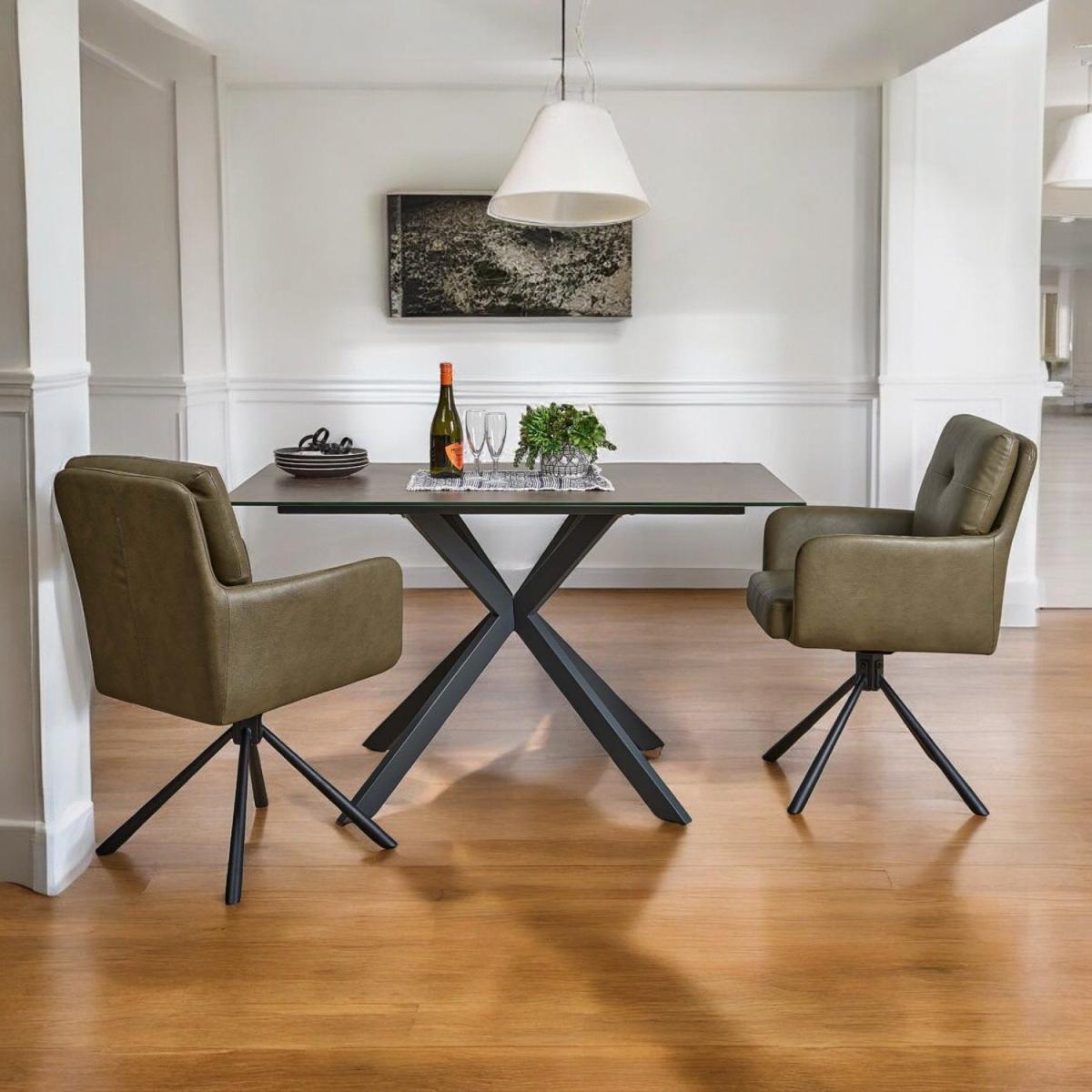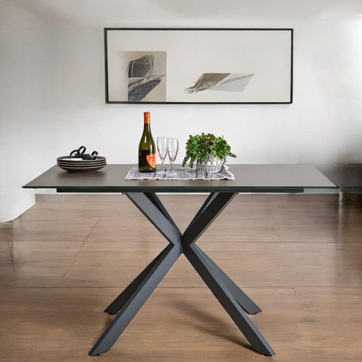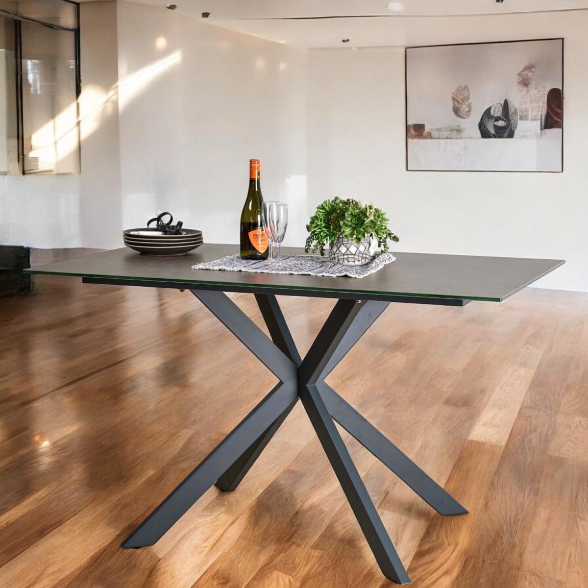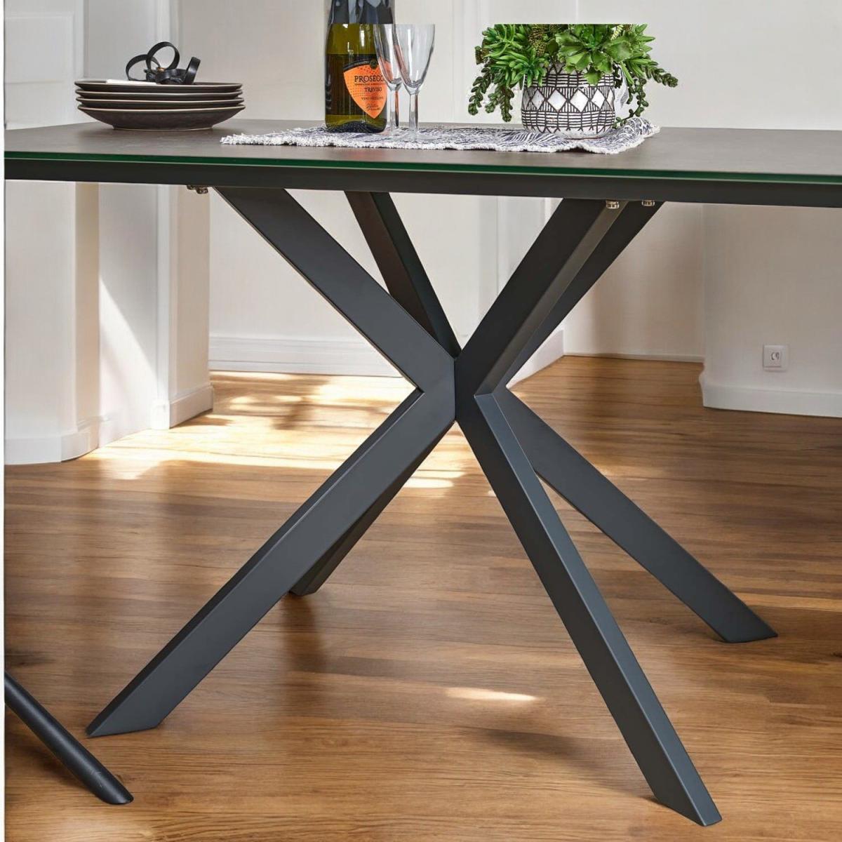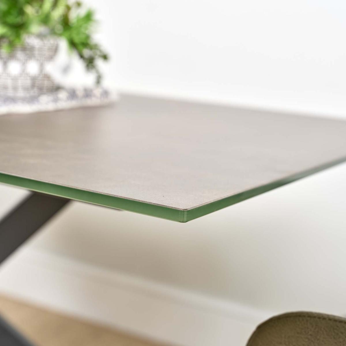 The Dante dining table combines materials for a sleek industrial addition to your dining space. A glass table top with a dark grey textured finish is supported by a stylish metal star base. The table is great for four seats, but can cater for six with chairs placed at each end. The table of course is both heat and stain resistant due to it's ceramic nature, and pairs beautifully with a wide range of our dining chairs and benches.