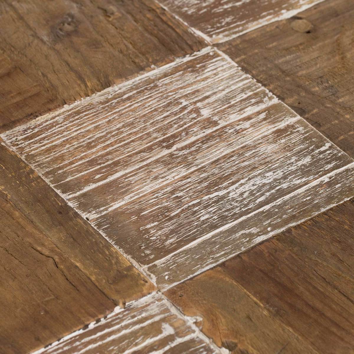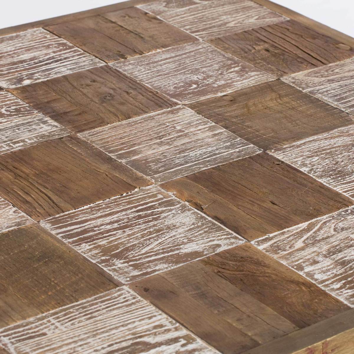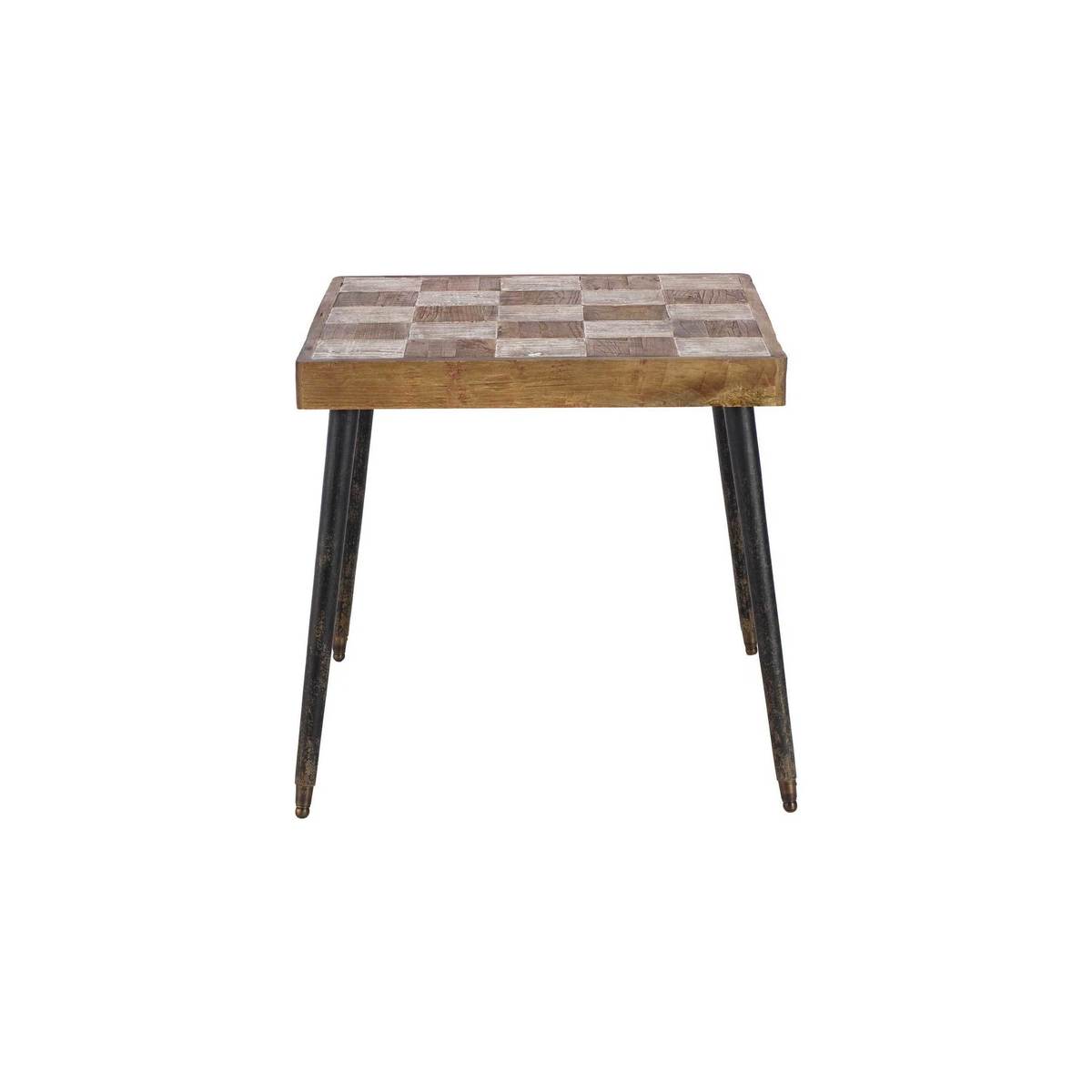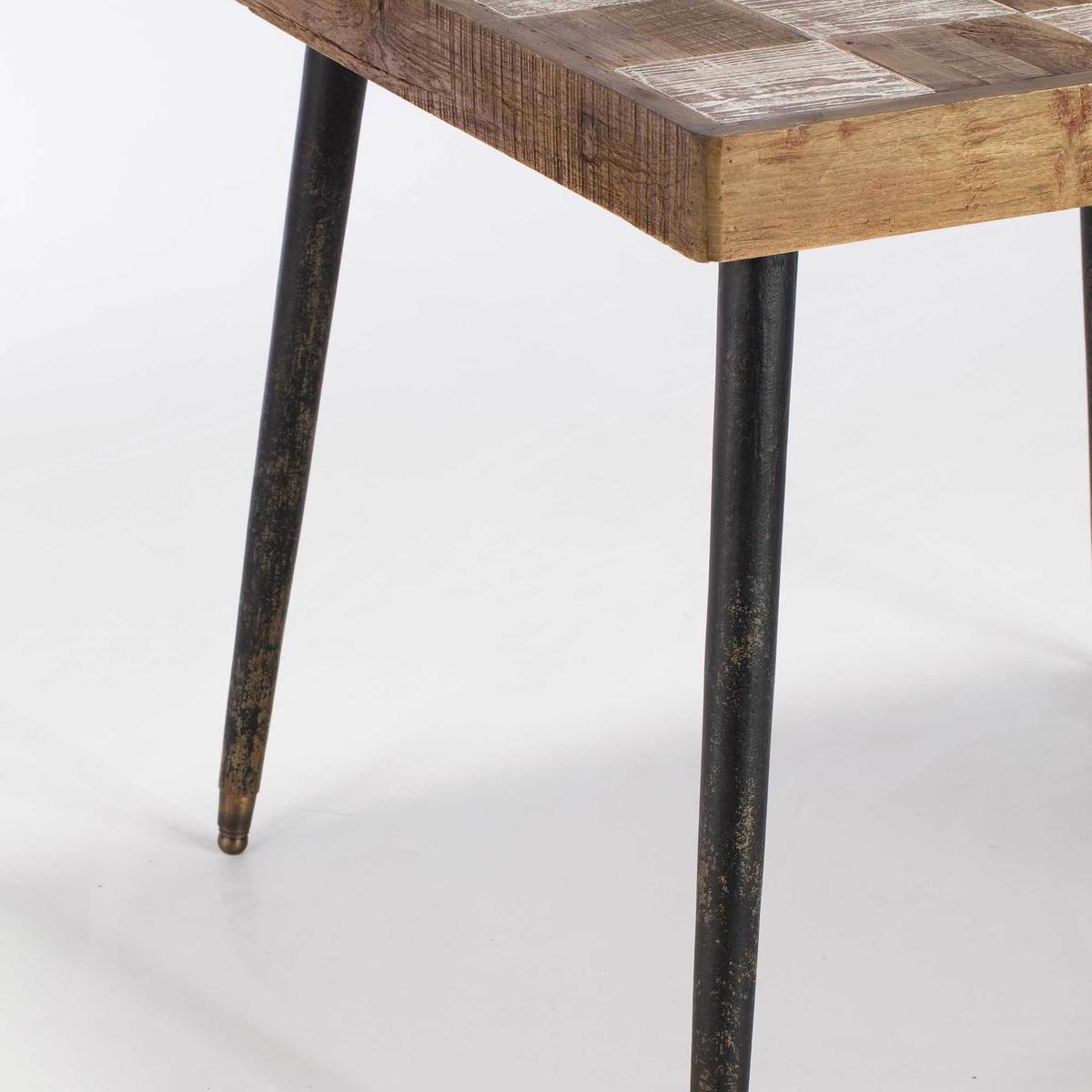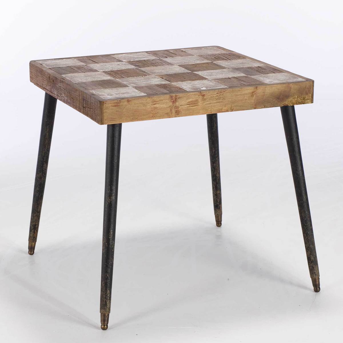 This sixties inspired dining table will look fabulous in your home with a parquetry chess board style inlay and metal legs.