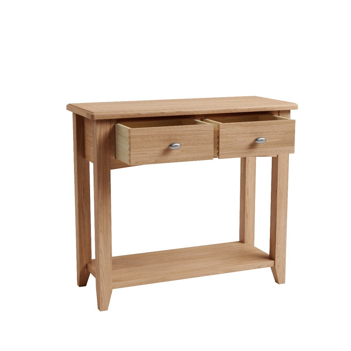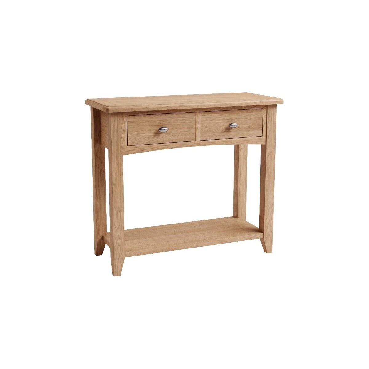 Featuring a classic design to suit any home, the Dante Solid Oak Console Table is stylish and sturdy. Crafted from durable timbers with a natural finish, the console table features a strong frame and offers handy storage space in the form of 2 upper drawers and a lower shelf. Stylish and practical oak console tableDurableconstruction. Classic light oak finish complements any interior2 Dovetailed upper drawers and low shelf offer handy storage. Rounded corner with bevelled corners and tapered legs for a classic look. Brushed metal oval shaped handles for the perfect finishing touch. Fully assembled. Matches with other items in the Dante dining collection