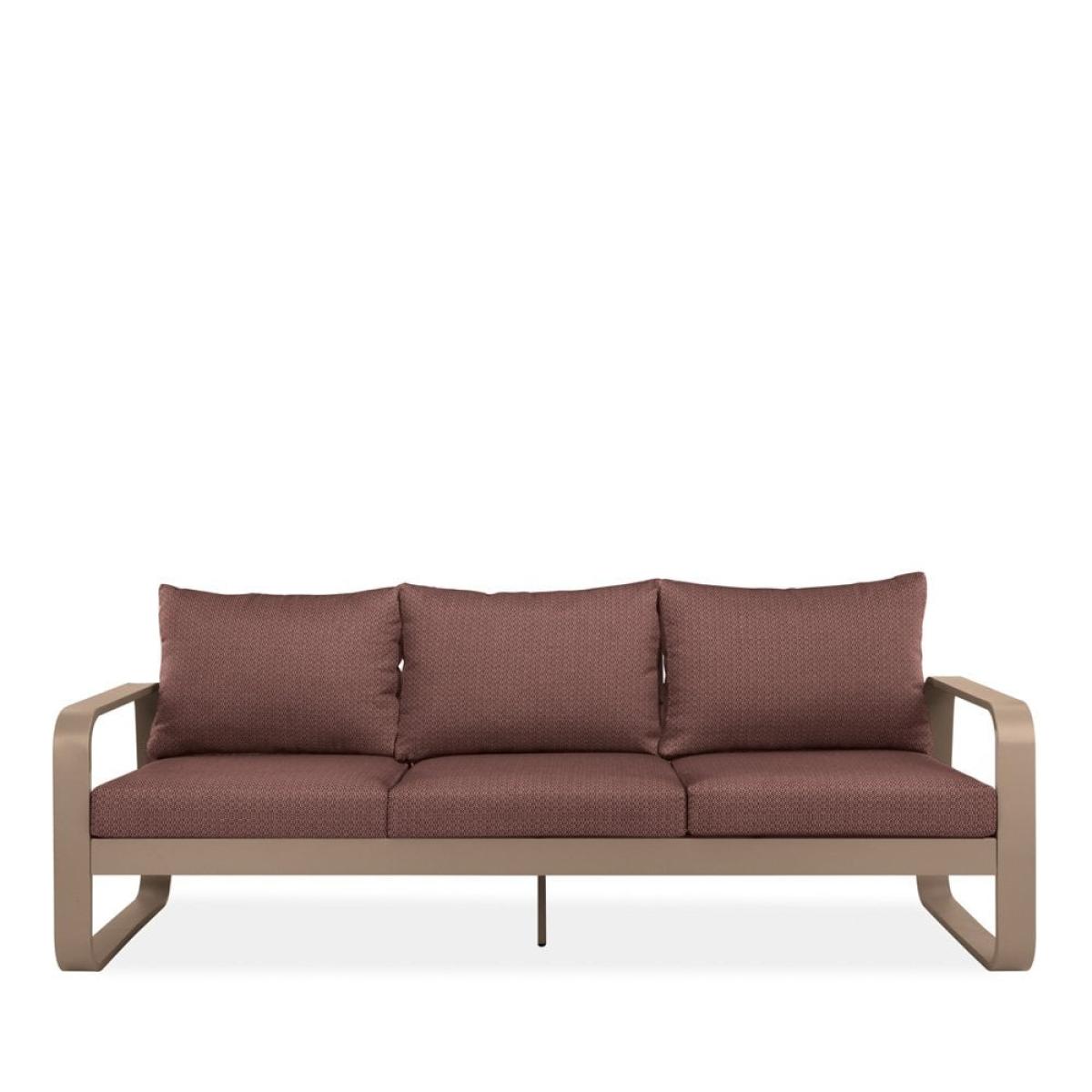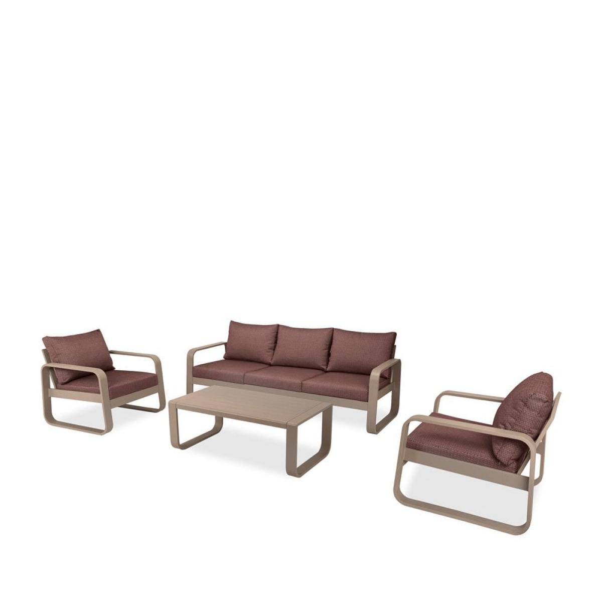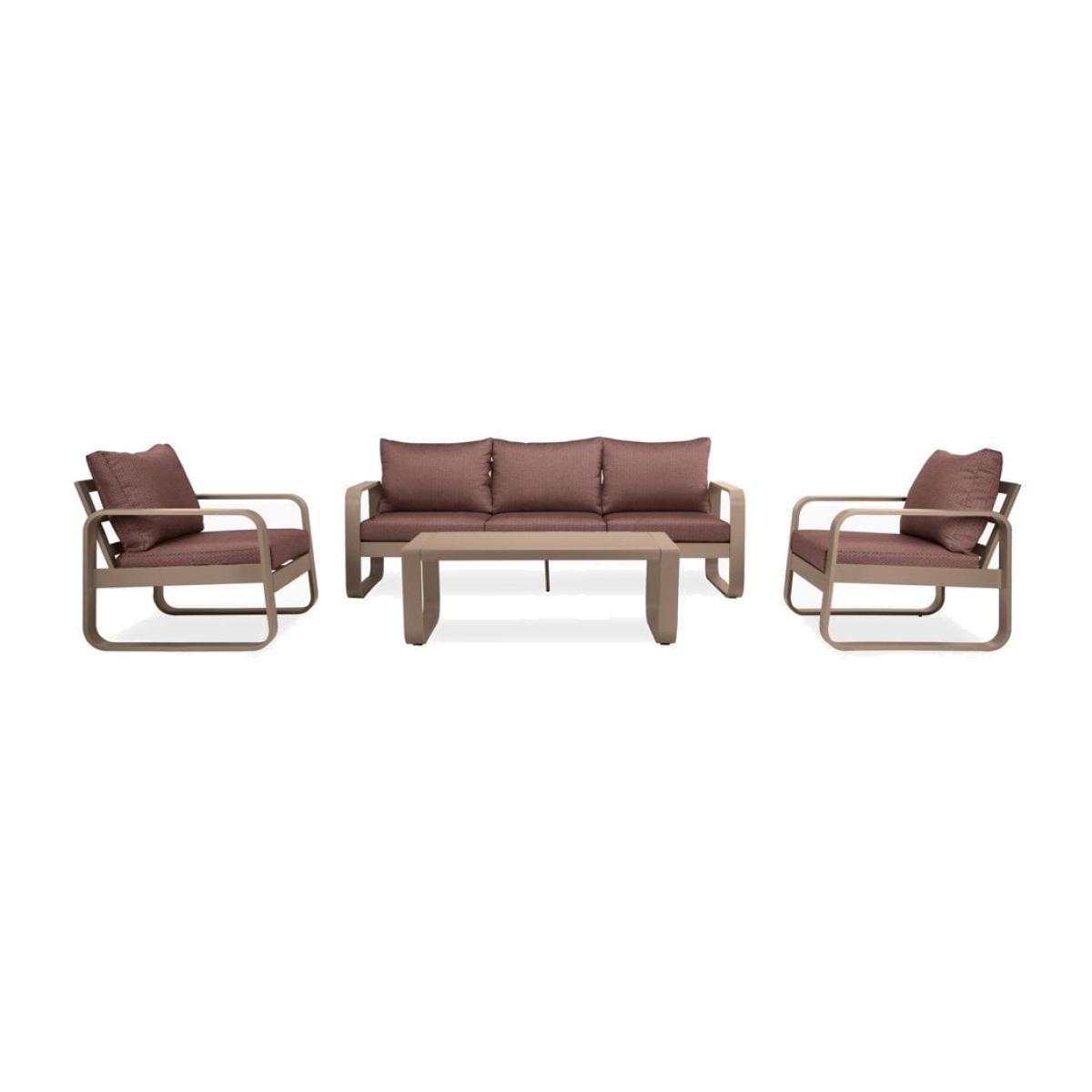 Absorb those rays with the Dante Garden Lounge Set, designed for both comfort and durability. Crafted from UV-Protected and water-resistant materials, this set includes one sofa, two armchairs and coffee table in a taupe aluminium frame and burgundy chequeboard cushions. The Dante is a chic, contemporary look with soft cushions for both the seat and backrest, offering a relaxing space to unwind. With its flexible design, you can place the set wherever you need it, whether to seek shade from the sun or bask in its warmth.