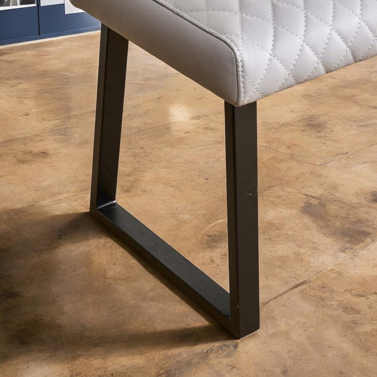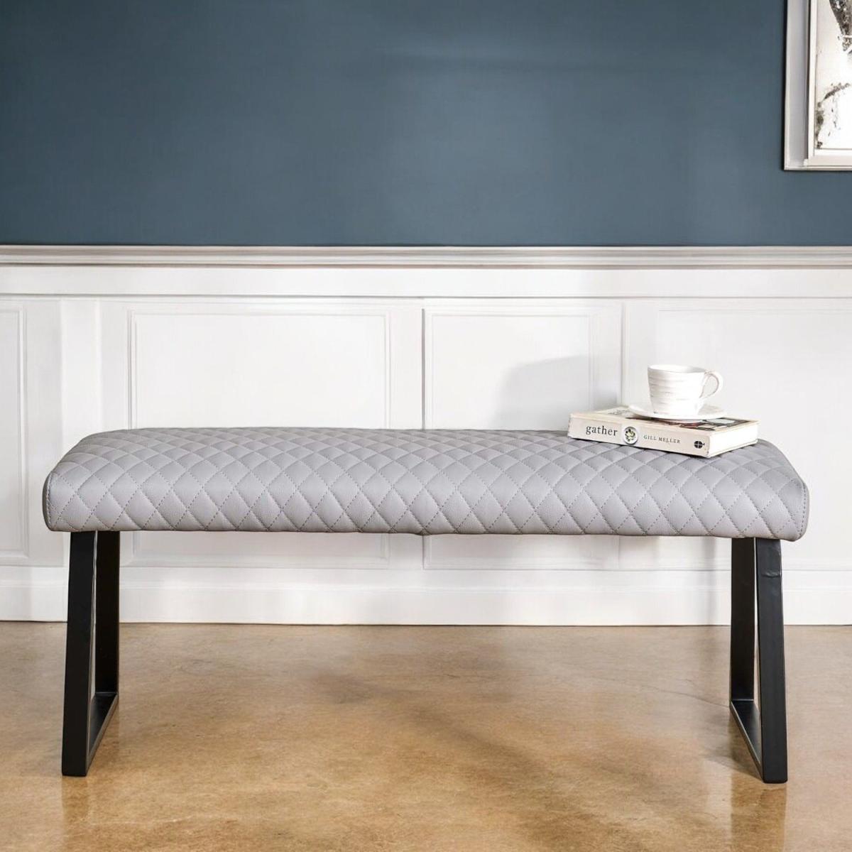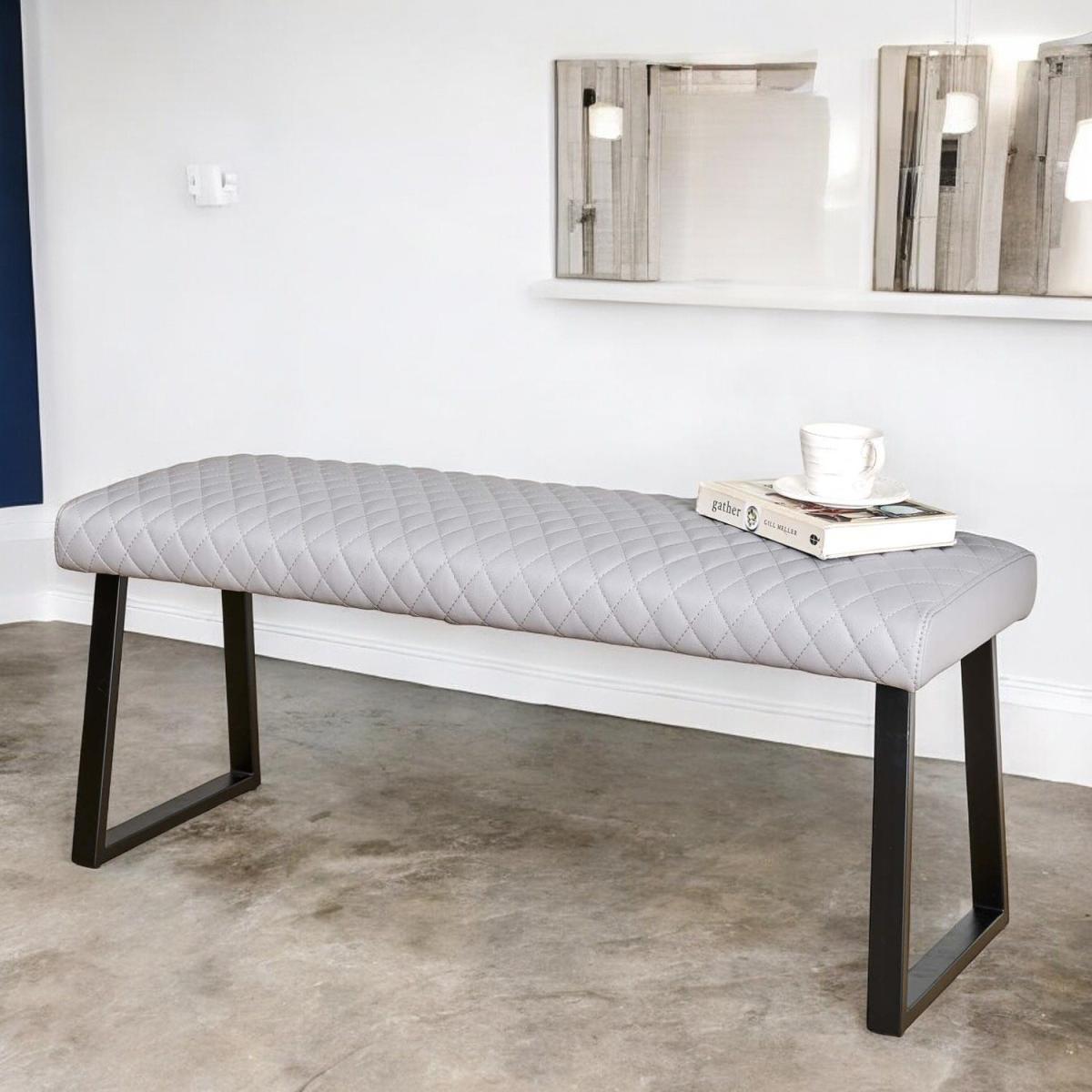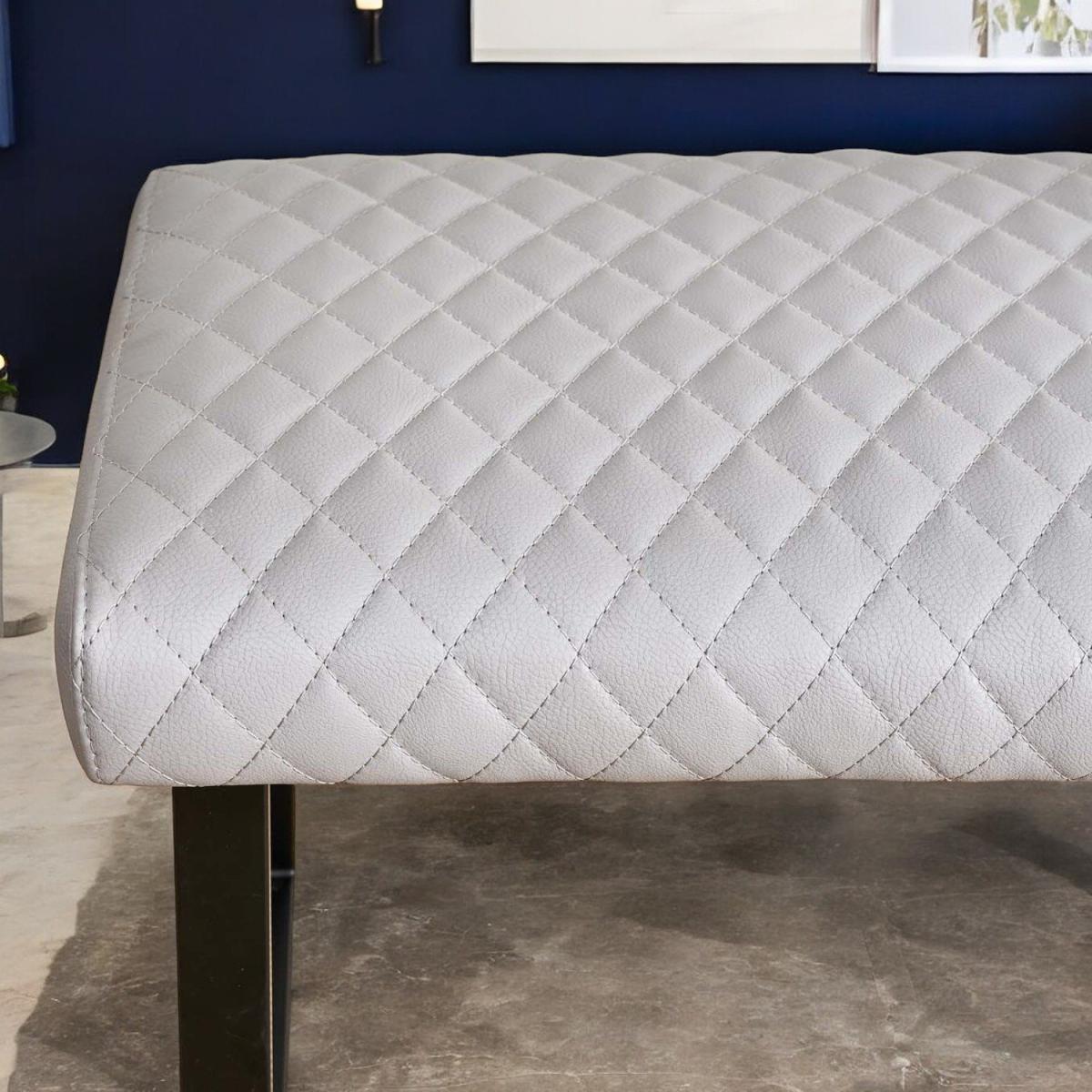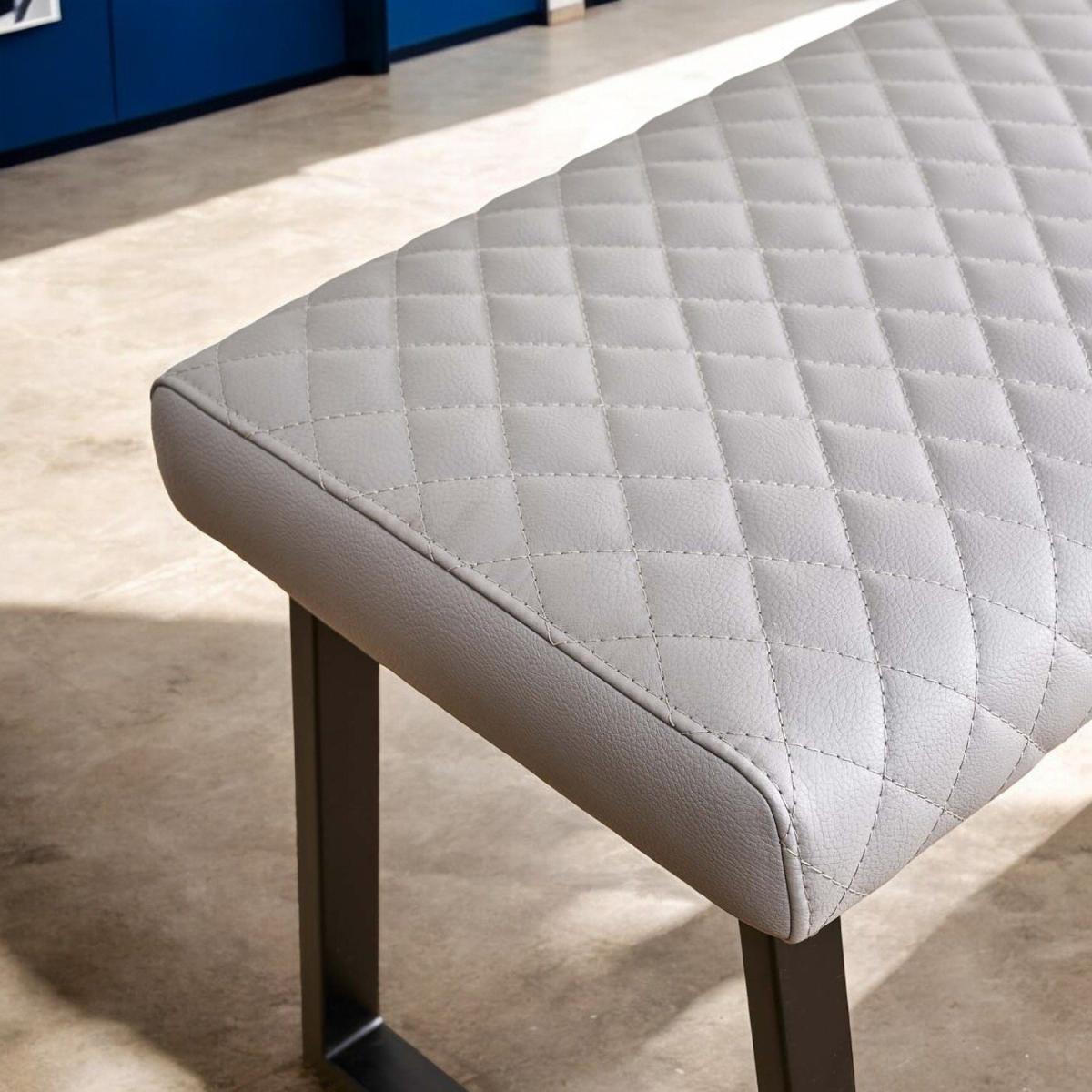 The Dante Low Bench is comfortable bench, which offers a great splash of industrial design to the dining room. In a pale grey faux leather, the bench enjoys a fabulous diamond stitching detail and strudy industrial style black metal legs. The bench pairs perfectly with the Corner Bench in the same range.