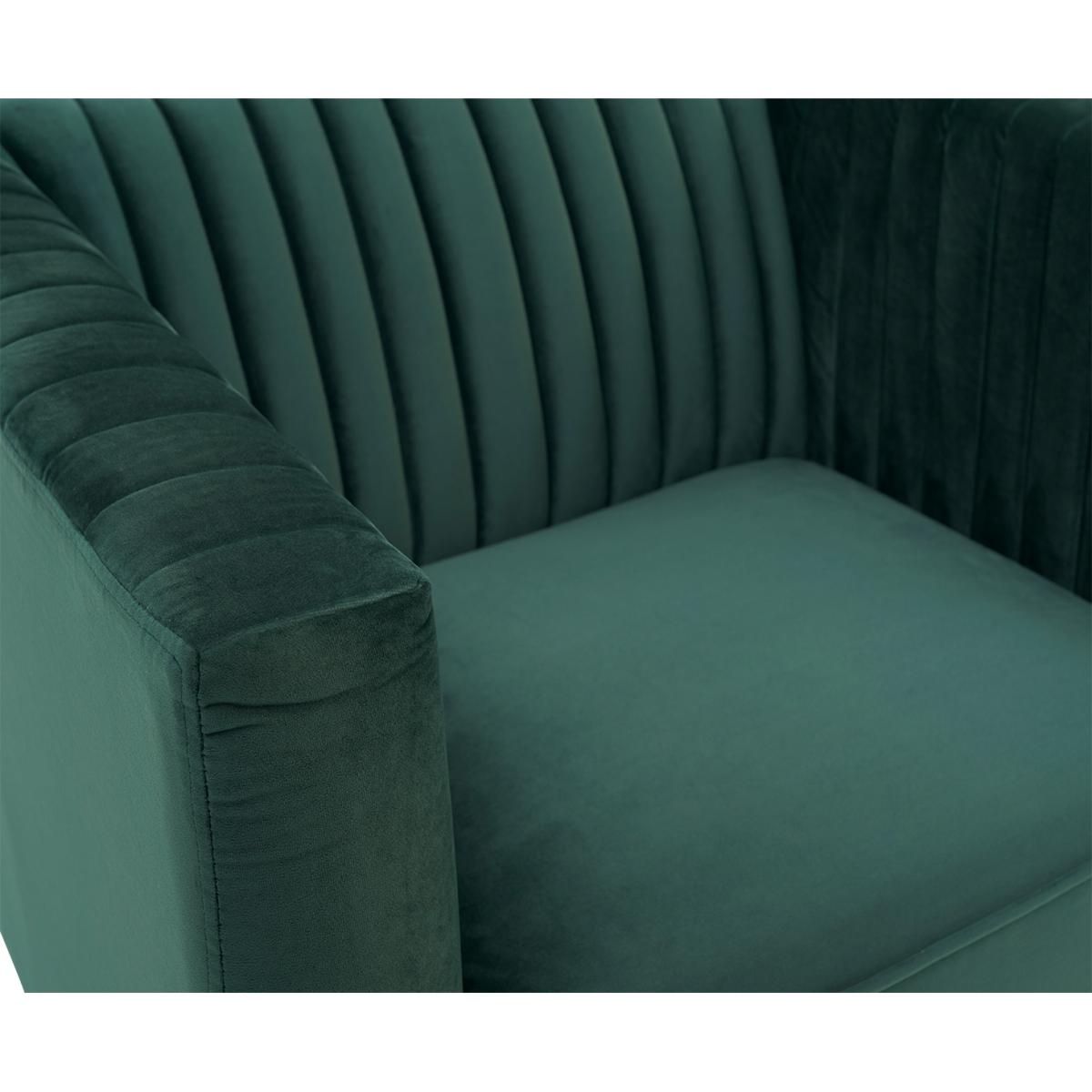 This green velvet armchair is a fantastic choice for adding a touch of luxe to any interior. Its rich hue and soft texture make it a versatile piece that works well in both contemporary and classic settings. I love pairing it with neutral tones to allow the colour to stand out, or mixing it with other jewel tones for a more layered, curated look. Practical styling tips include placing it near a cosy reading nook with a small side table and a good lamp, or using it as a statement piece in a minimalist space to inject colour and texture. Its compact size makes it ideal for smaller rooms or to create an inviting corner within an open-plan layout.