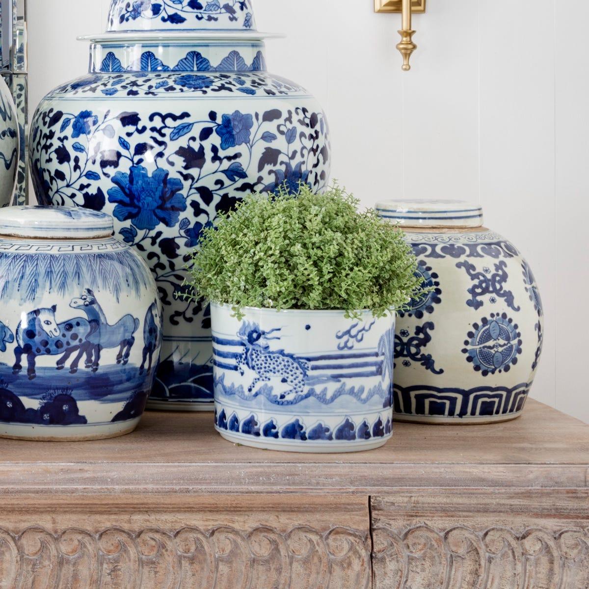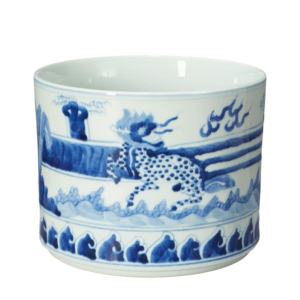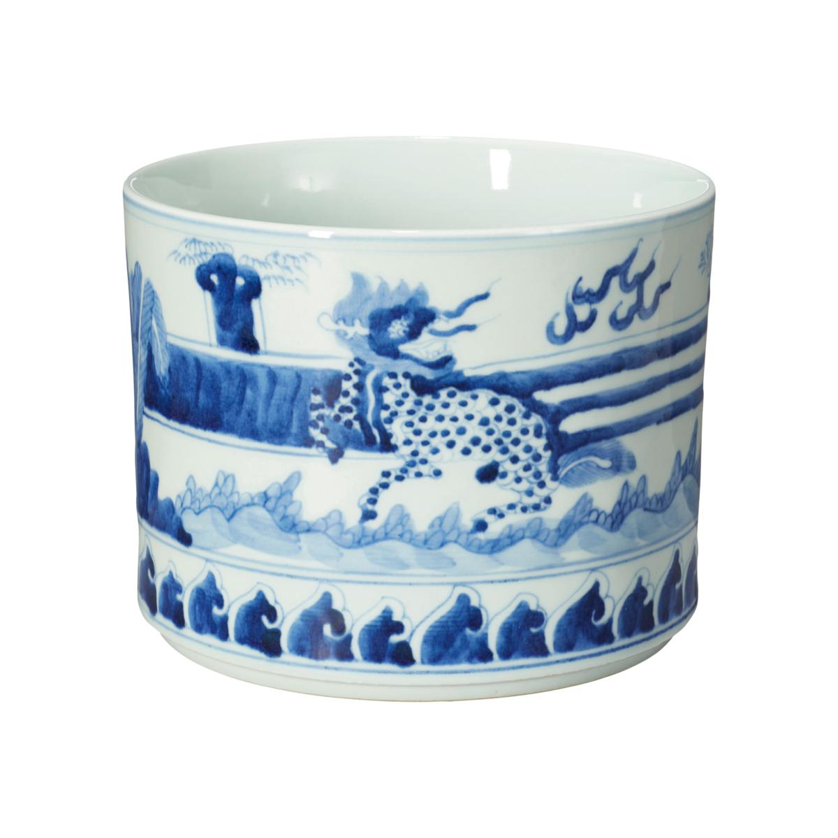 Decorated with traditional Chinese motifs, including a spotted Chinese lion, this small blue-and-white porcelain planter is ideal for holding some of our faux flowers. Handmade in the city of Jingdezhen, which has been producing innovative porcelain craftwork for more than 1,000 years, this hand-painted design is available in three sizes. The elaborate piece also makes an excellent gift. Daqing Planter, Small - Blue/White