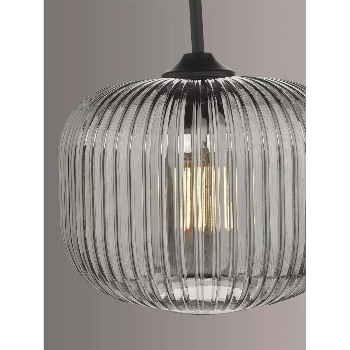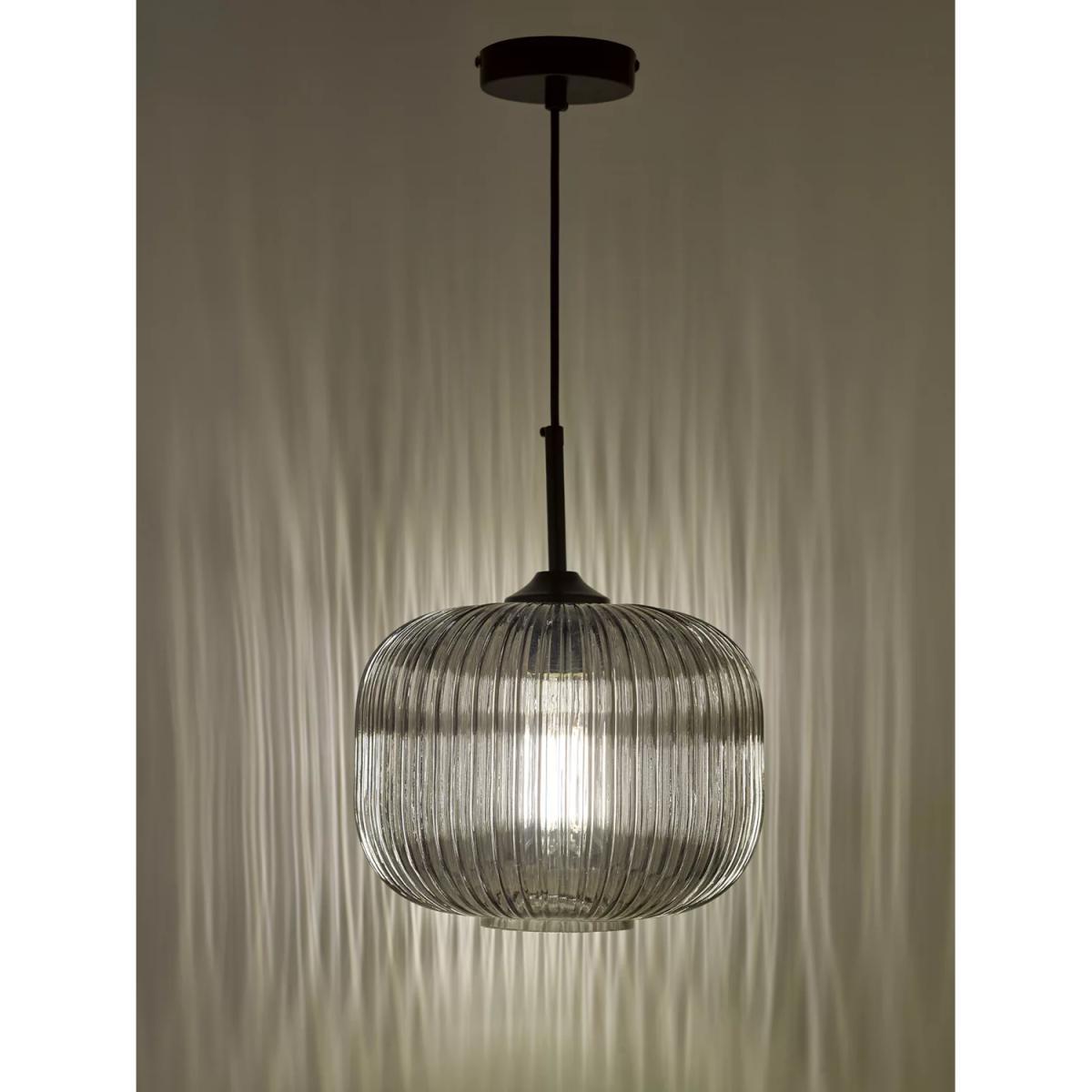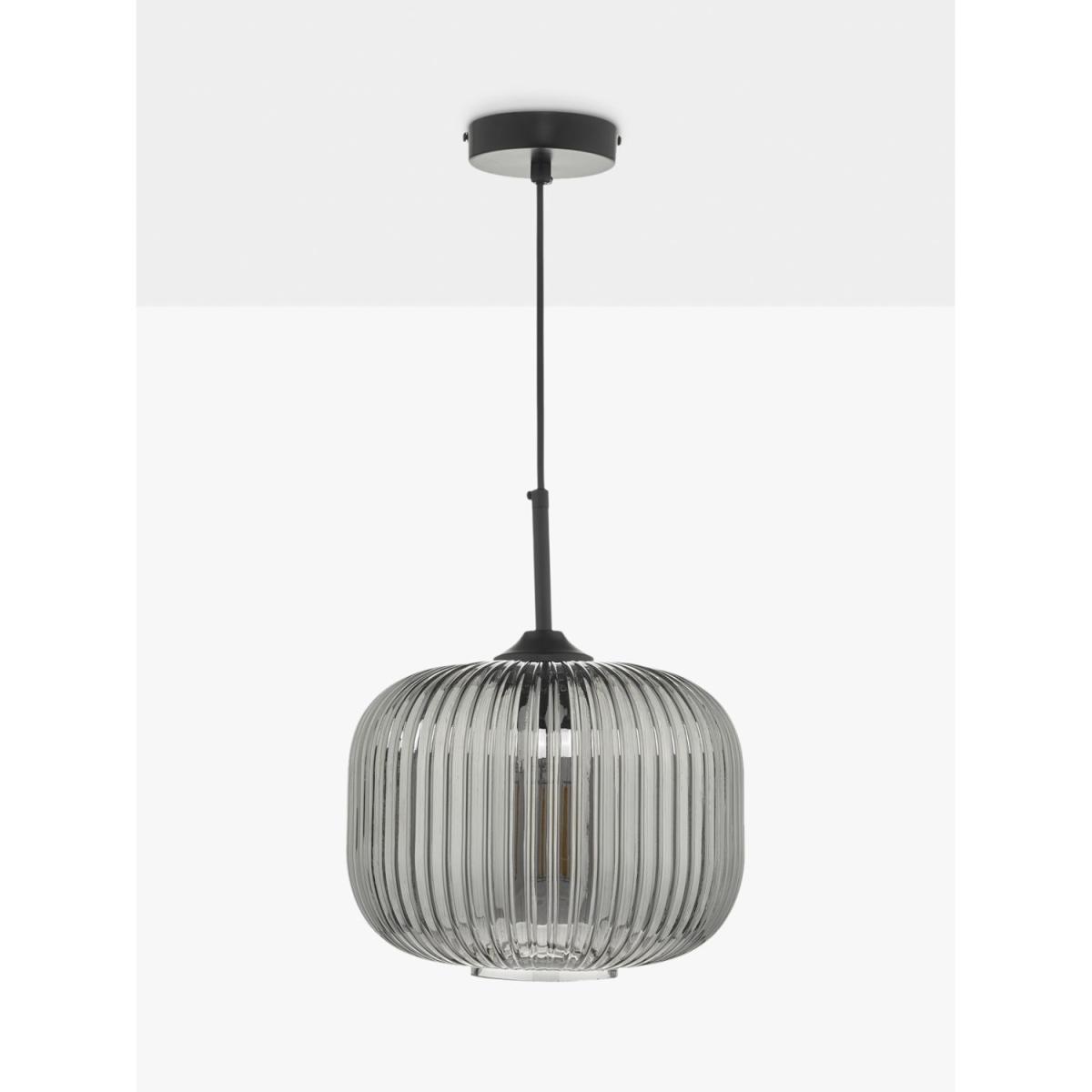 Made from ribbed glass in a smoked finish, this ceiling light has a modern-retro look that will draw the eye in your space. When illuminated, it will create a distinctive pattern of light on nearby walls and enhance a warm glow. Suspended from a height-adjustable braided cable.