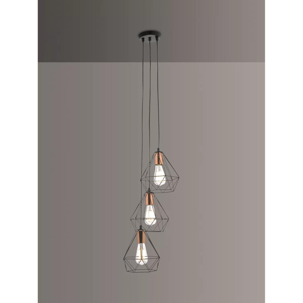 With three pendants suspended in a tiered formation, this ceiling light is a modern option with an industrial edge. Each pendant is made from metal in a geometric style and encases a copper-finished lamp holder. It needs three bulbs in total and is best paired with vintage lamps to achieve the popular, ambient light aesthetic.