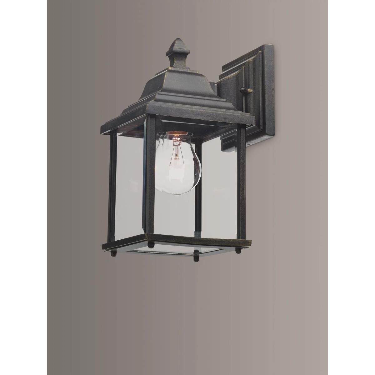 This traditional wall light is designed in a lantern shape with clear, bevelled glass panels and an aluminium frame. There's accents of gold wash in the matt finish which gives the design a rustic look. Providing a functional wash of light and IP44 rated, you can install it both inside and outside.