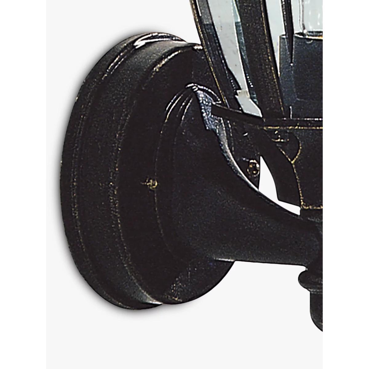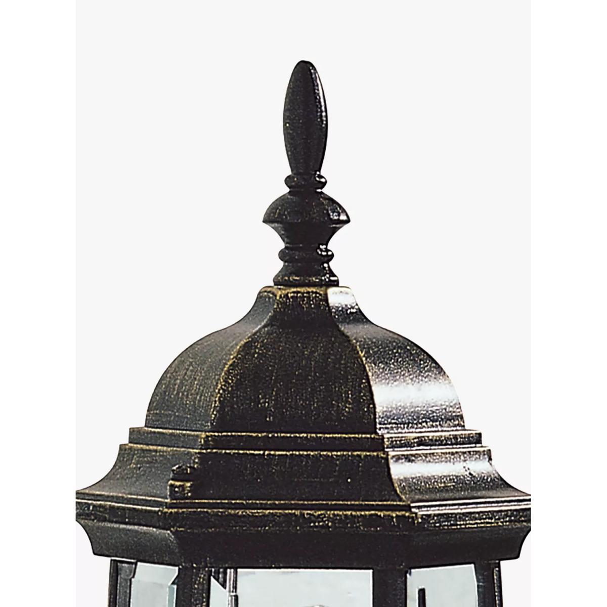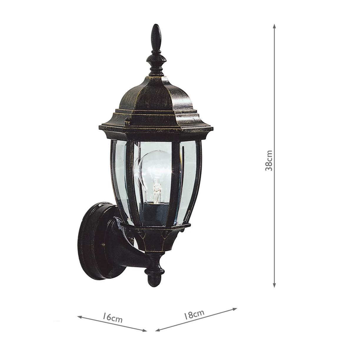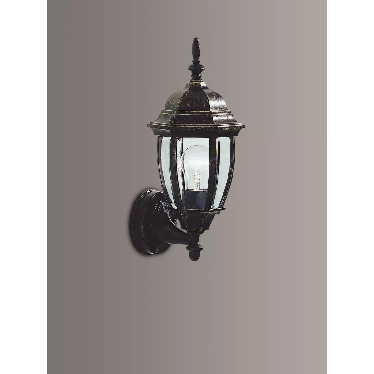 A traditional outdoor wall light made from robust cast aluminium alloy with bevelled edge glass panels. Ideal for illuminating front porches and finished with subtle gold detailing to enhance an antique look.