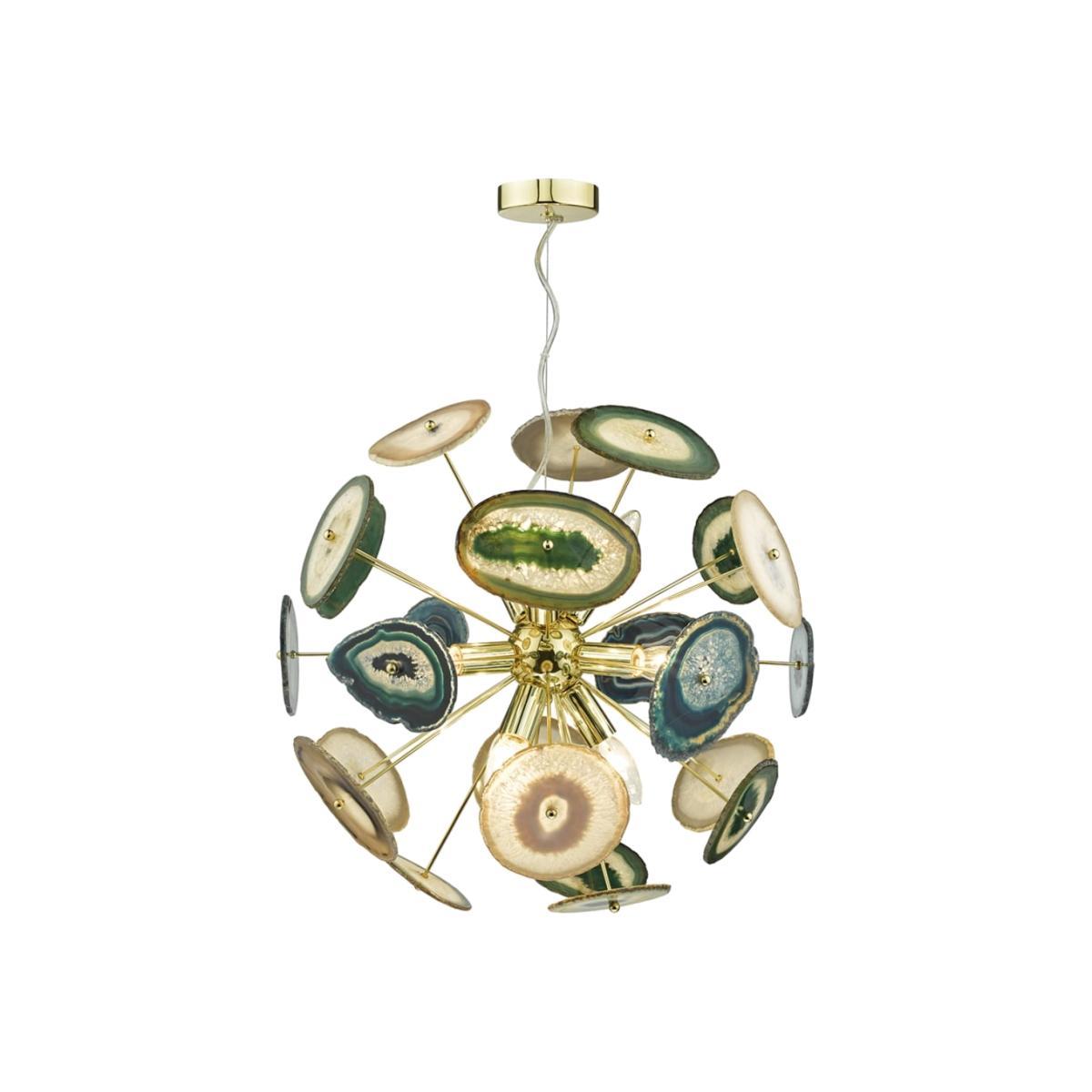 The ACHATES pendant is made of unique pieces of agate; each formed naturally in volcanic rock, sliced and polished to a high shine. The natural material is selected in a subtle blend of greens and blues, contrasting with the warm gold of the metalwork which looks beautiful when off and spectacular when lit. Fitted with a clear cable, this fitting is adjustable to suit the height of your ceiling.