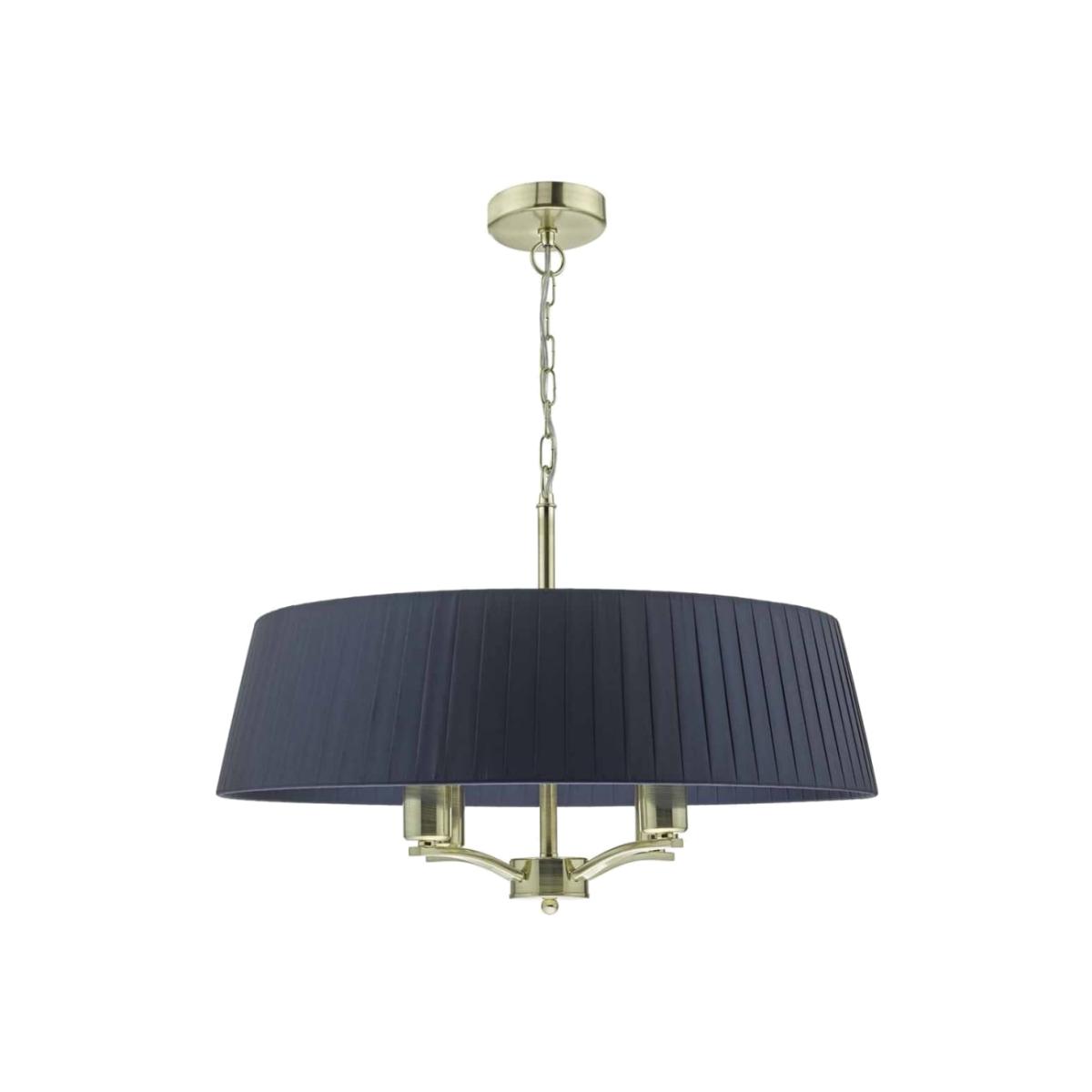 The CRISTIN is an elegant four-light pendant in satin brass, surrounded by a hand wrapped navy ribbon shade. The layers of ribbon are repeated both inside and outside the shade giving the CRISTIN a beautiful appearance from any angle. Suspended by a chain, which is height adjustable on installation. Colour: Blue. Material: Fabric / Metal. Maximum Bulb Wattage: 40. Bulb Included: No. Number of Bulbs: 4.