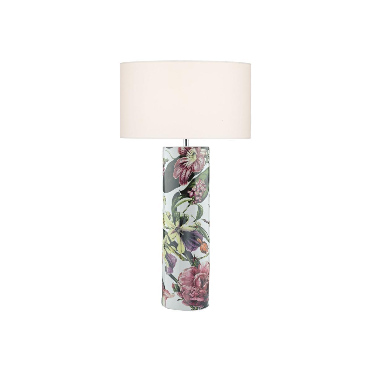 The elegant Elana ceramic table lamp has a tall, cylindrical shape with a detailed and vibrant botanical print featuring large pink blooms with green leaves on a white ground. This colourful lamp base will bring the outdoors in.