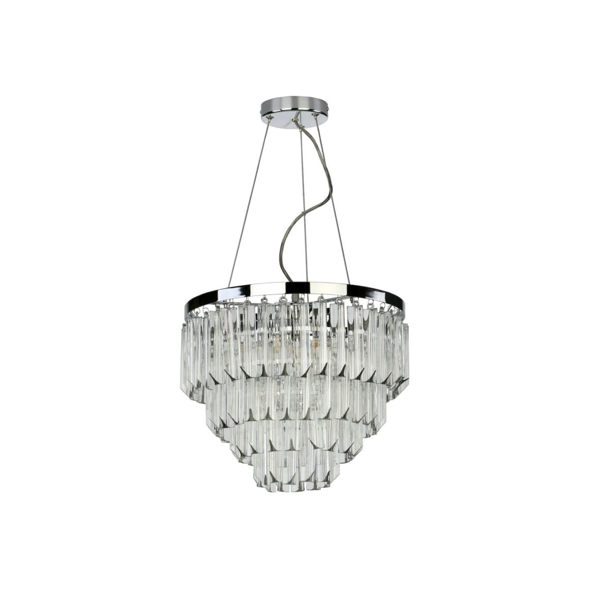 The Fame Chandelier is a beautiful ceiling light with shaped glass crystals to capture and refract the light with polished nickel metal work. Supported by adjustable steel tension cables and a clear electrical cable with 1m of adjustment on installation. The Fame Chandelier is a stunning addition to living room or hung low over a table in a dining room, or add a touch of opulence to a bedroom. Take a look at our Chandelier collection for more eye catching ceiling lights. Colour: Glass. Lamp Holder Type: G9. Maximum Bulb Wattage: 40. Bulb Included: No. Number of Bulbs: 5.