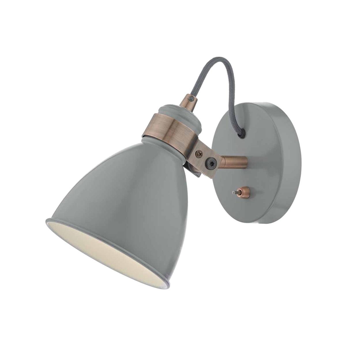 The FREDERICK is a neat directional wall lamp shown in soft gloss grey with a cool Nordic look, warmed up with copper metalwork and a matching toggle switch. Teamed with the floor or table lamp, this range adds an instant style fix to any interior. Colour: Grey. Lamp Holder Type: E14. Bulb Type: Golf Ball. Maximum Bulb Wattage: 40. Bulb Included: No.