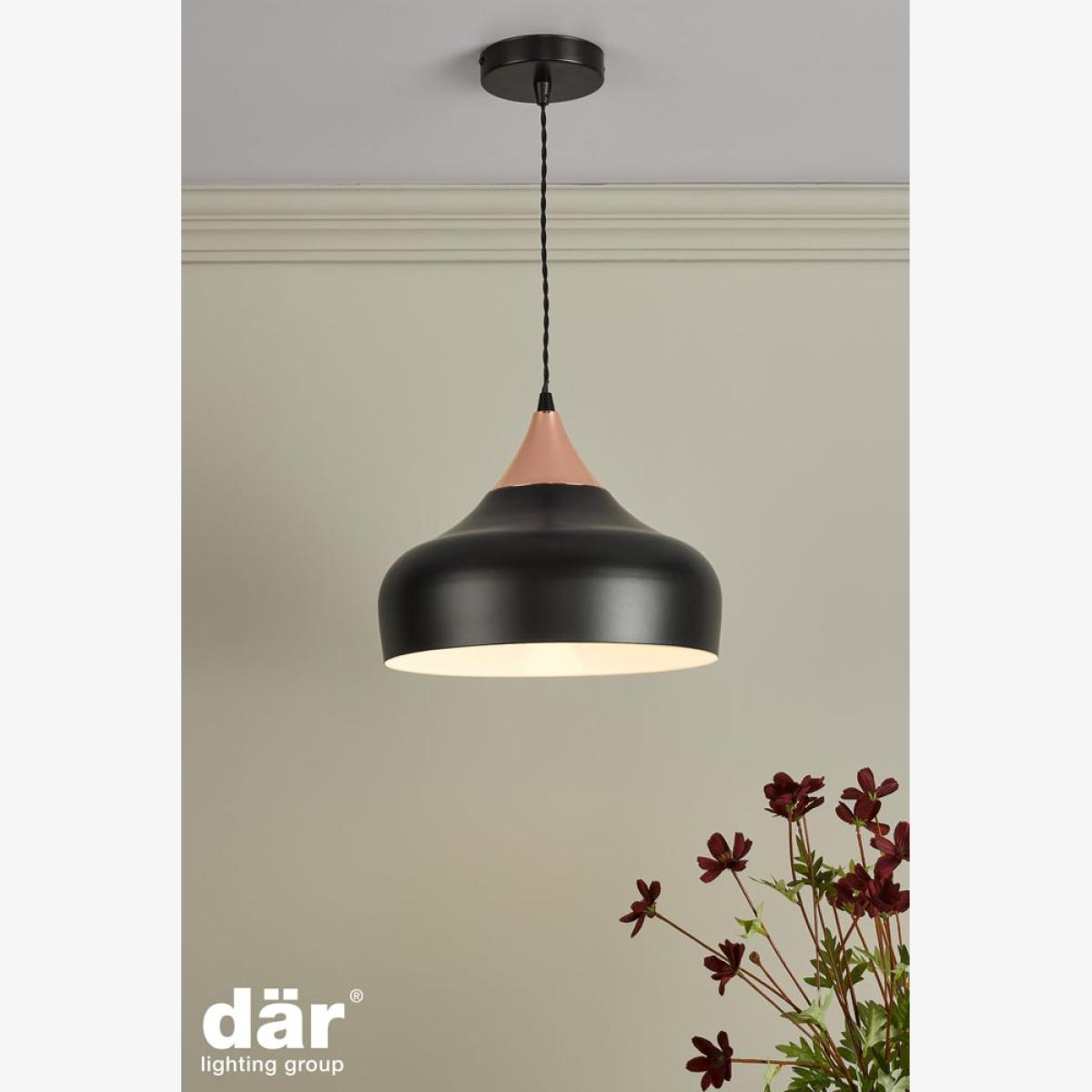 The Gaucho single pendant features a gently curved metal shade with a matt black finish topped with contrasting polished copper. The inside of the shade is painted in white to reflect a useful pool of light. This dome-shaped pendant light is just the thing for over a dining room or family room table. Colour:Matt Black. Lamp Holder Type: E27. Bulb Type: GLS. Maximum Bulb Wattage: 60. Bulb Included: No.