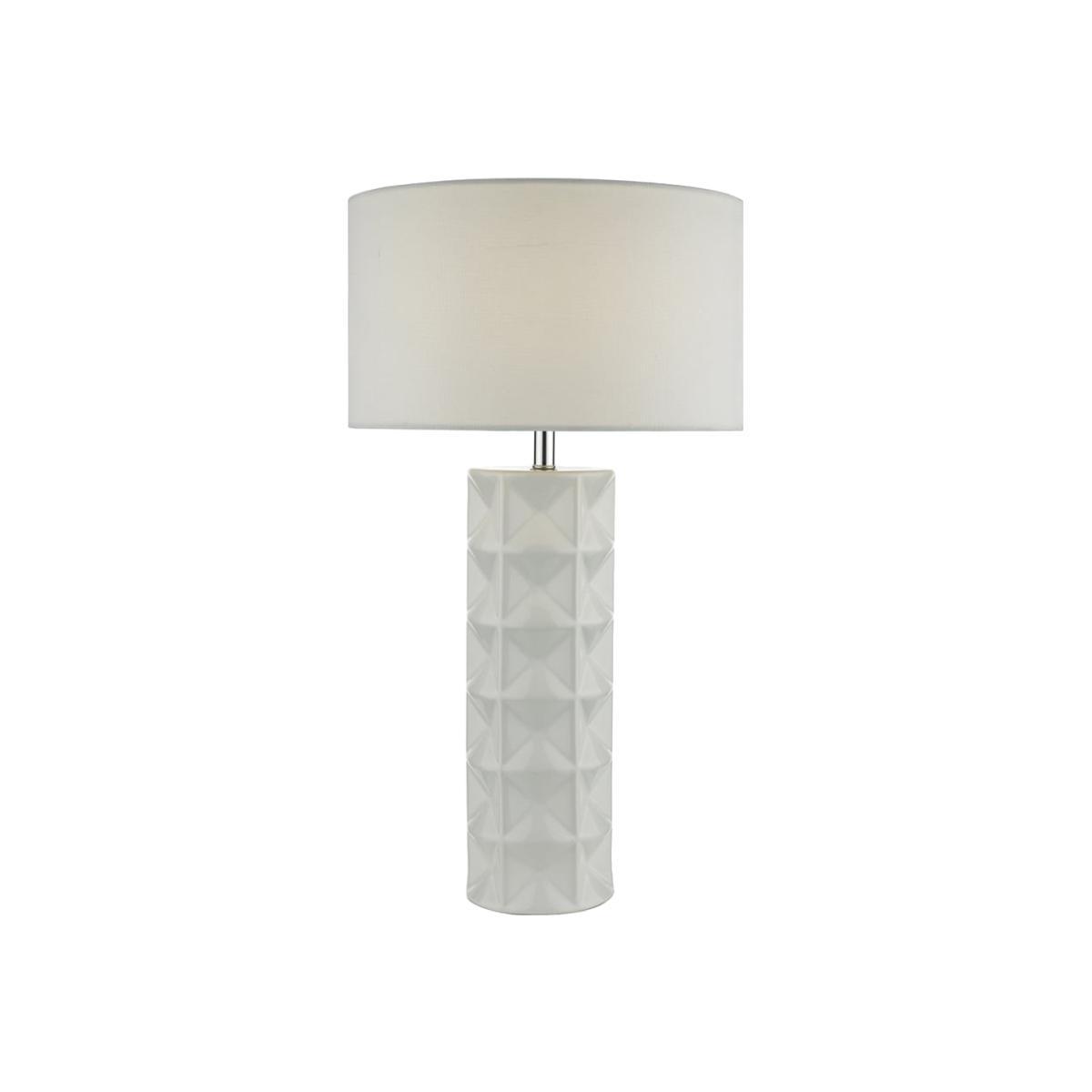 GIFT – is a statuesque table lamp standing 64cm high. With a pure white gloss ceramic base with an embossed geometric 3d design topped by a cool white linen shade this table lamp has a great sense of tranquillity. This table lamp has white cable and an in line switch.