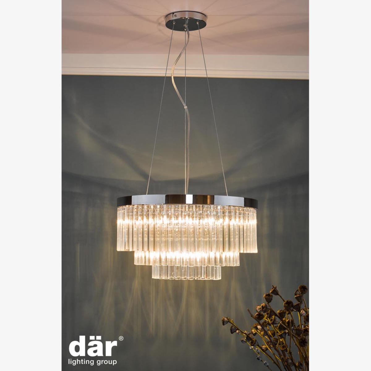 The Giovana five-light pendant is a real stunner. Three decreasing tiers of long hexagonal crystals are suspended from a polished chrome circular frame. This is supported by three high tensile steel cables, which can be adjusted on installation to suit the available height. Colour: Glass. Lamp Holder Type: G9. Maximum Bulb Wattage: 40. Bulb Included: No. Number of Bulbs: 5.