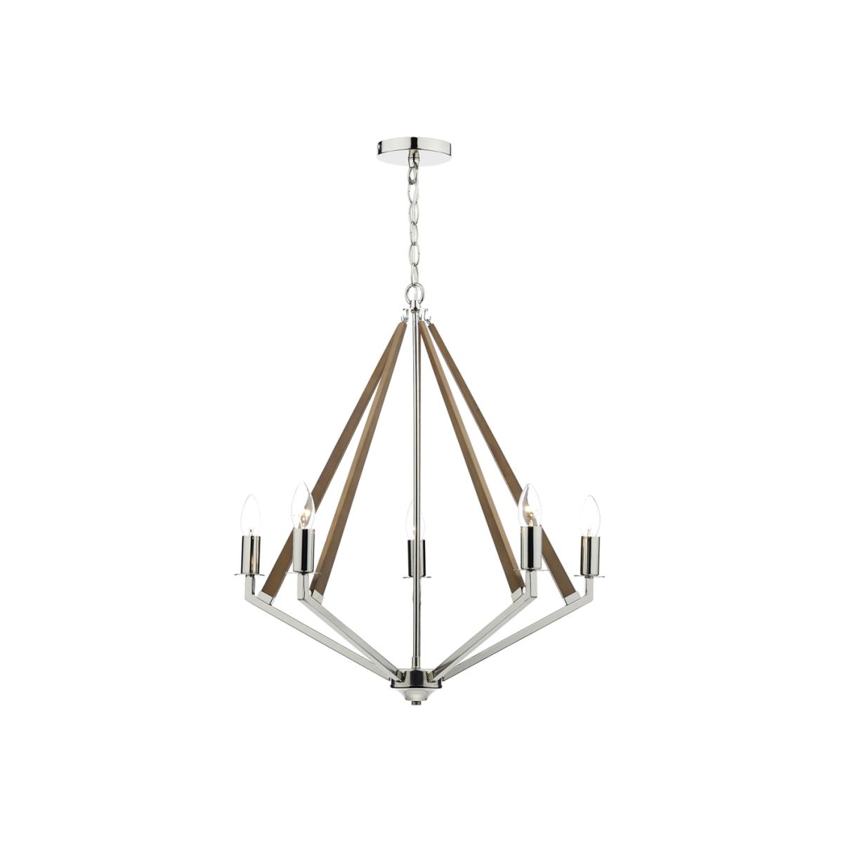 The HOTEL 5lt pendant has a modern polished nickel pentagonal frame with feature pale wood detailing Supplied with 100cm of cable and chain and with a dual mount option to make this fitting semi flush. This pendant is fully height adjustable at point of installation. Matching products are available; type HOTEL in the search box at the top of the screen to view the whole range. Colour: Polished Nickel. Lamp Holder Type: E14. Bulb Type: Candle. Maximum Bulb Wattage: 40. Bulb Included: No.
