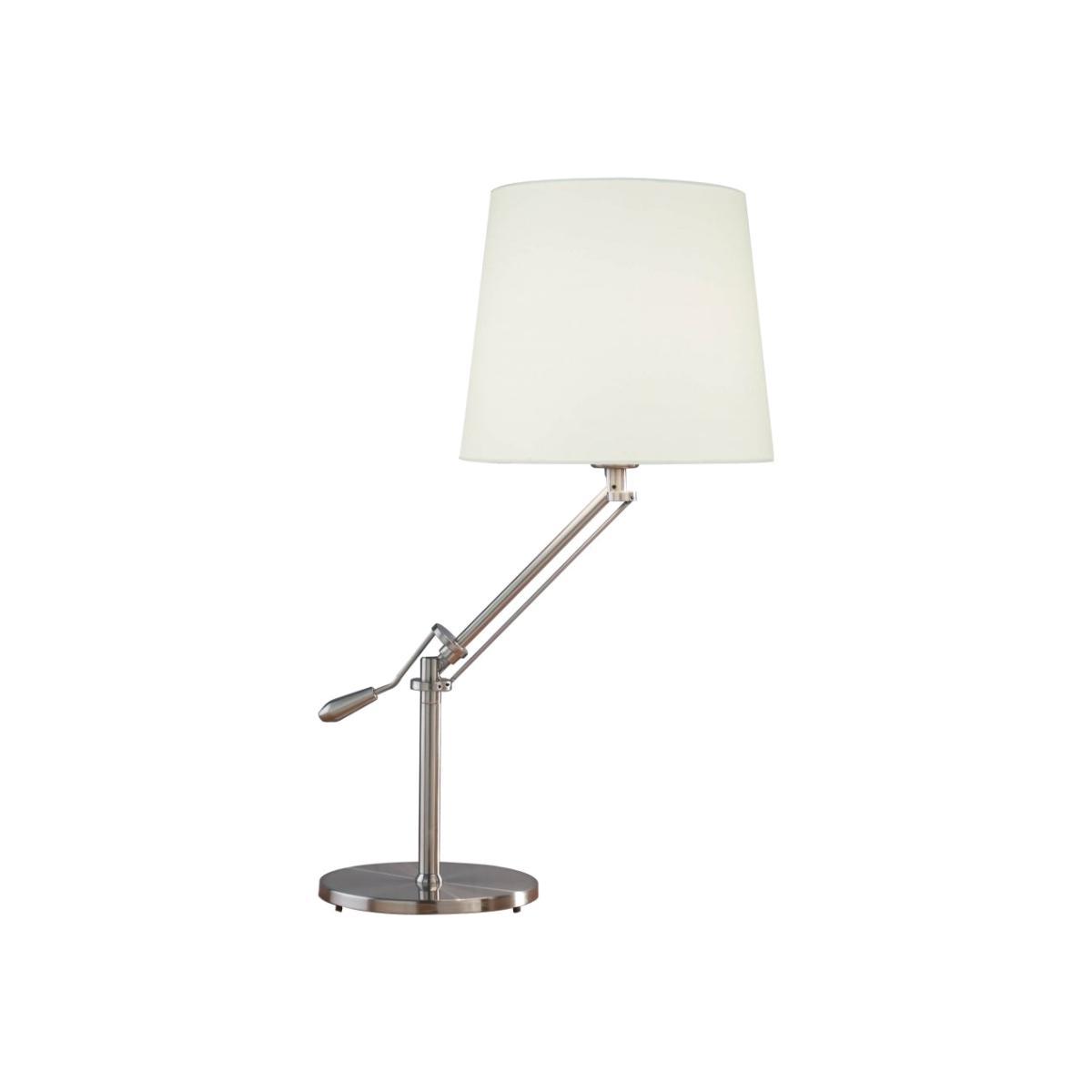 The satin chrome adjustable INFUSION 1lt Table Lamp has a white cotton tapered shade and is in line rocker switched.